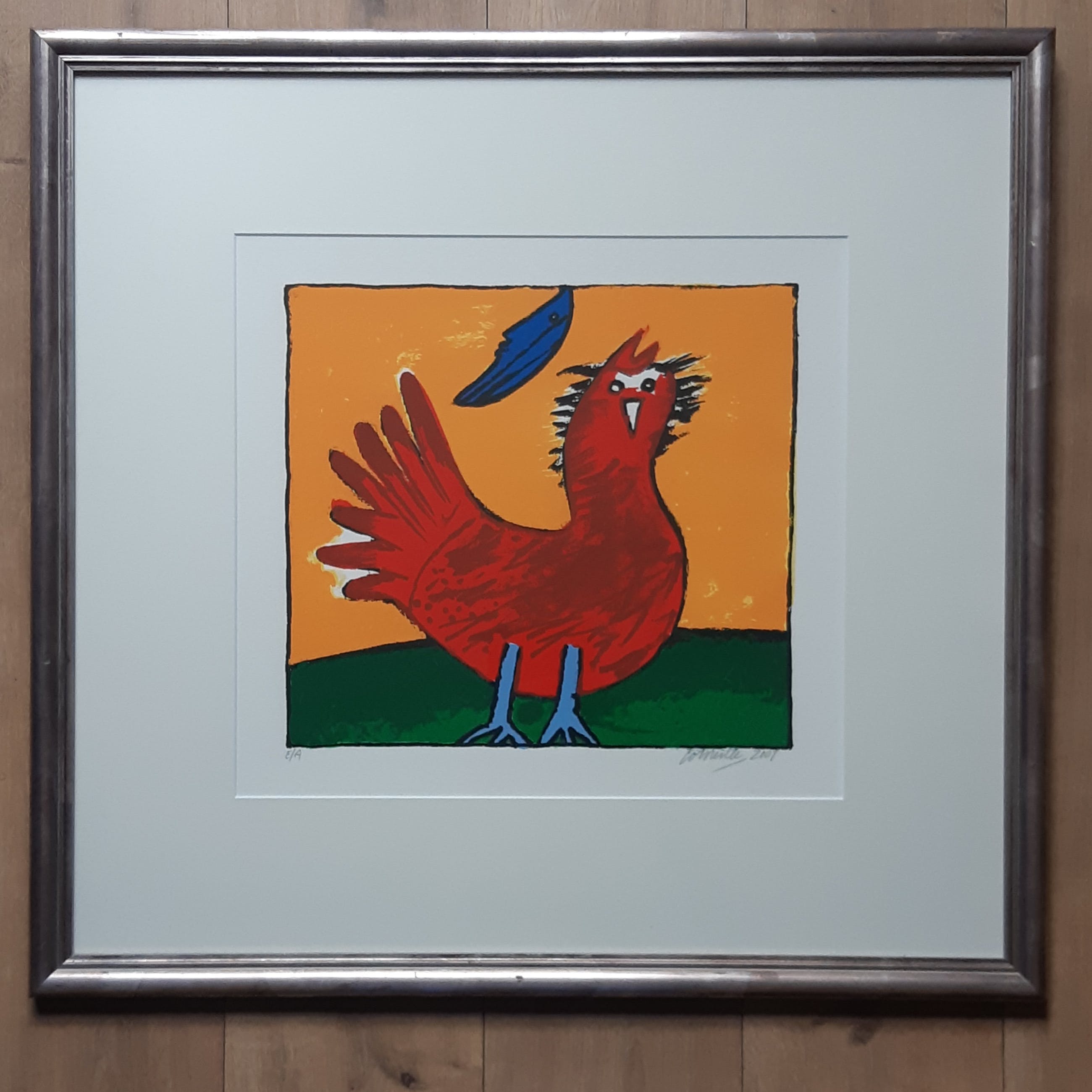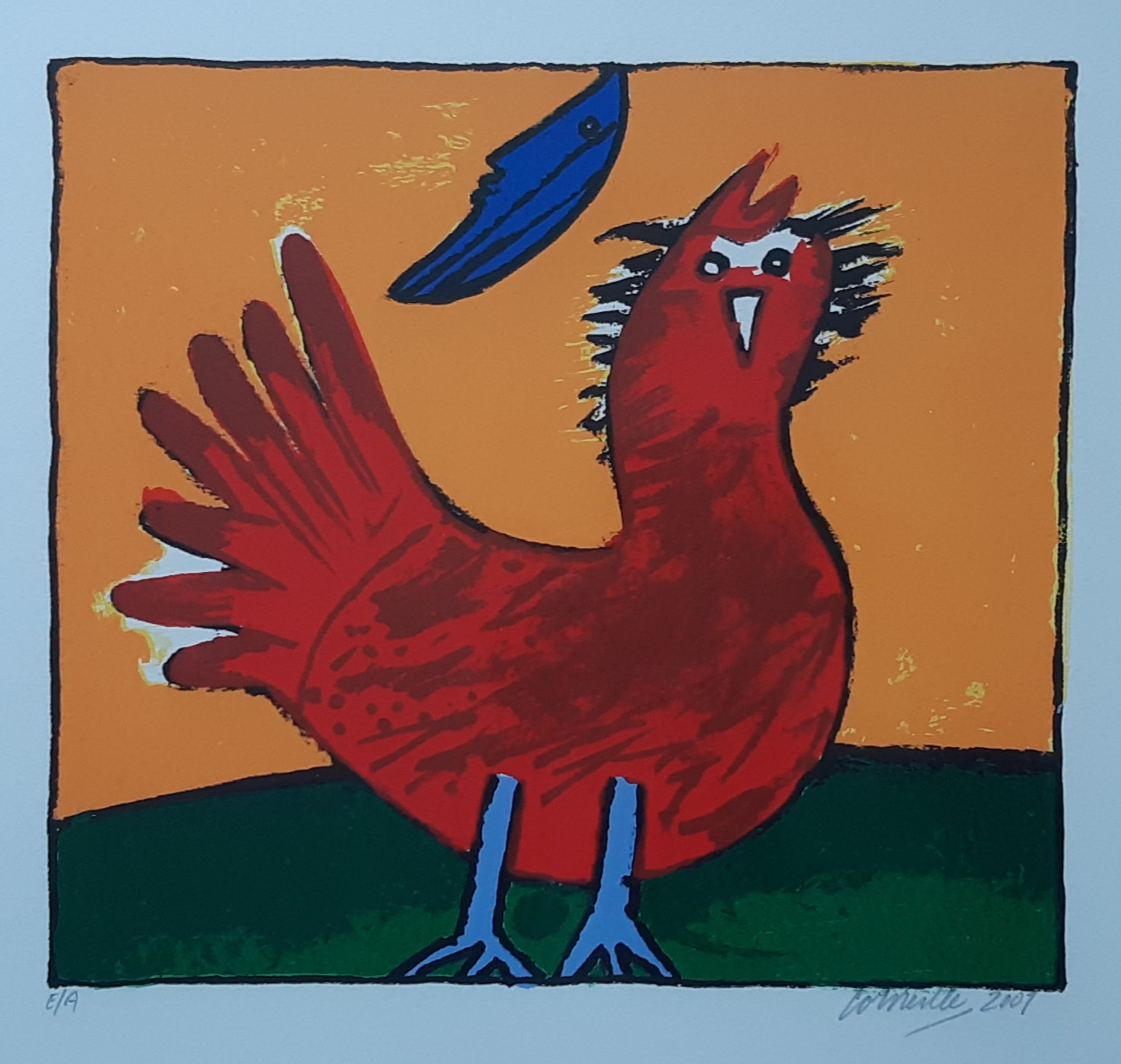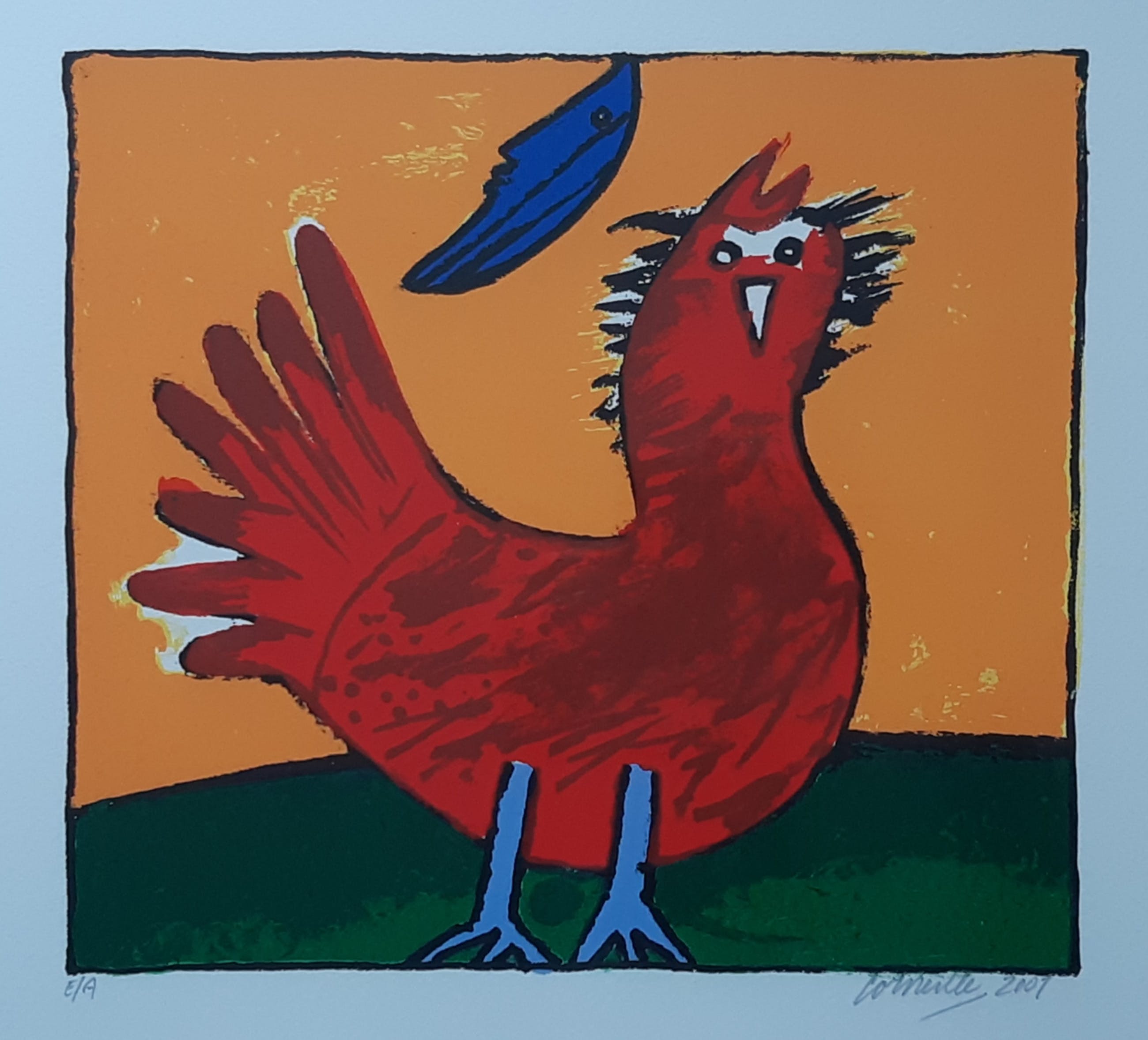 Werkelijk prachtig ingelijst werk van Corneille uit 2001. Het geheel is professioneel en smaakvol ingelijst ( 74 x 70 cm) en voorzien van een Passe-partout. Het werk is gesigneerd, gedateerd en genummerd ( Epreuve D'artiste ) in potlood door de kunstenaar. Echt een zéér fraai geheel dat zo aan de muur kan.