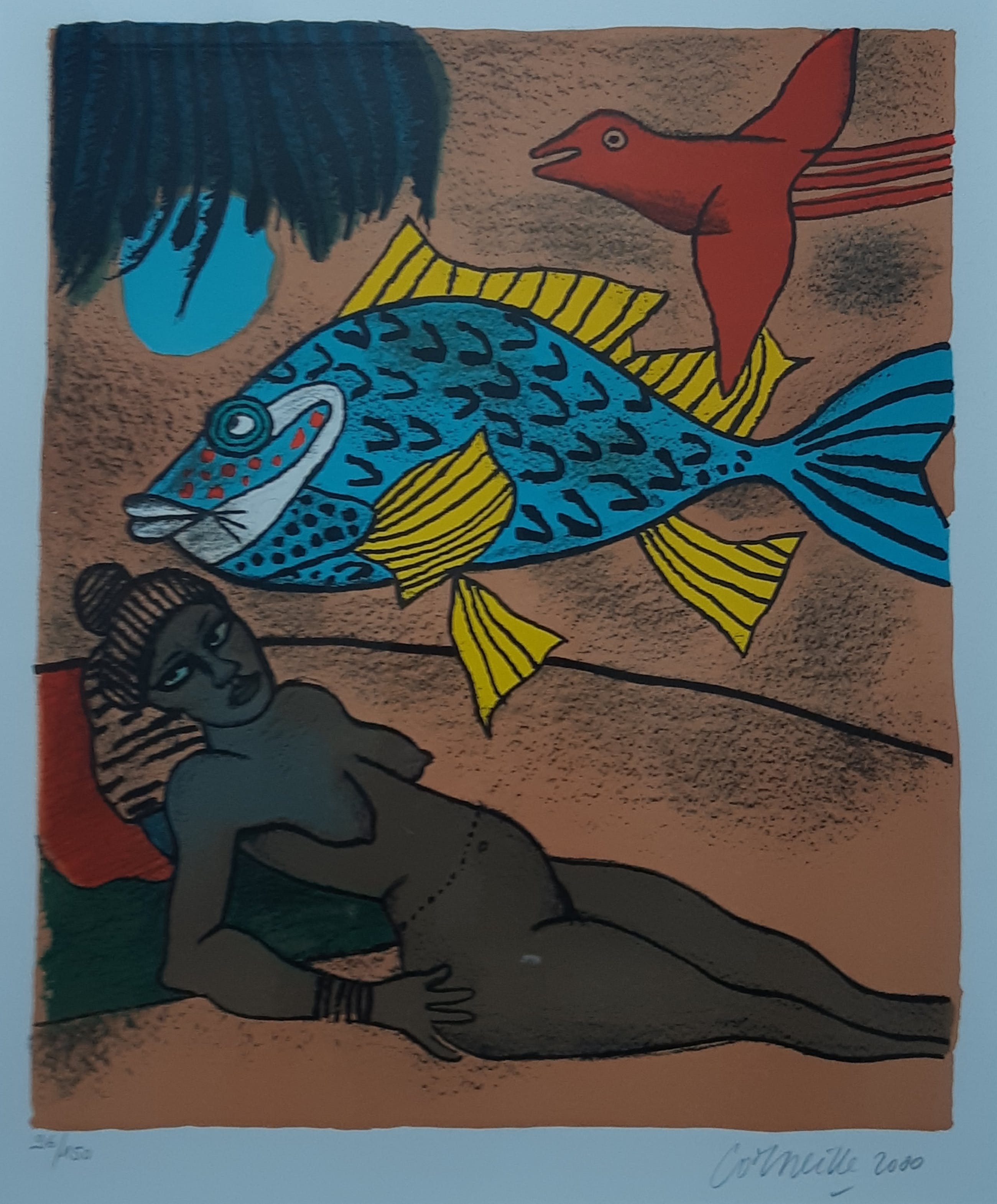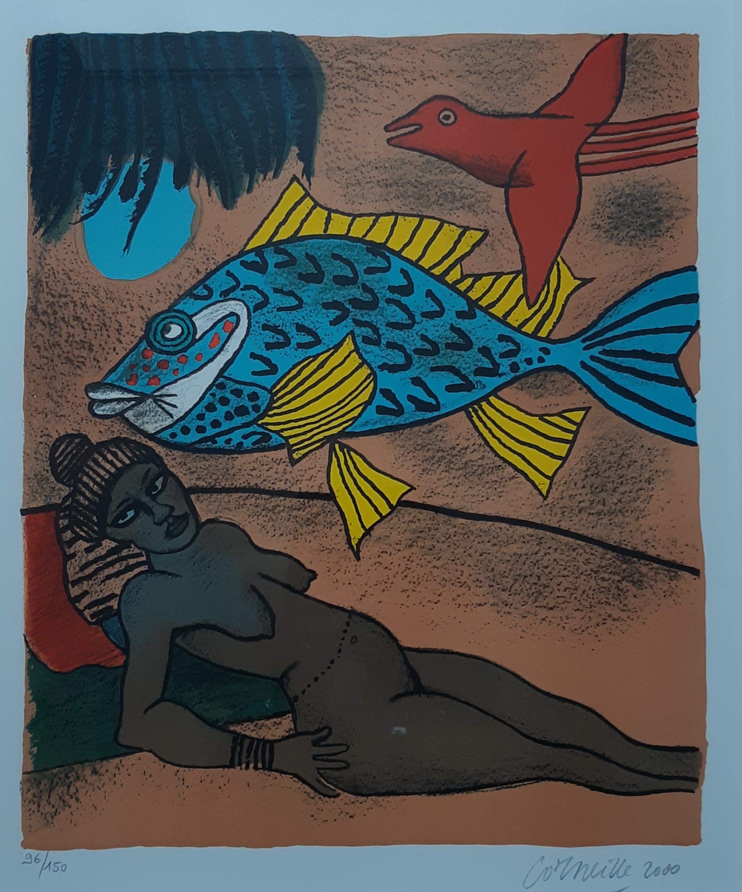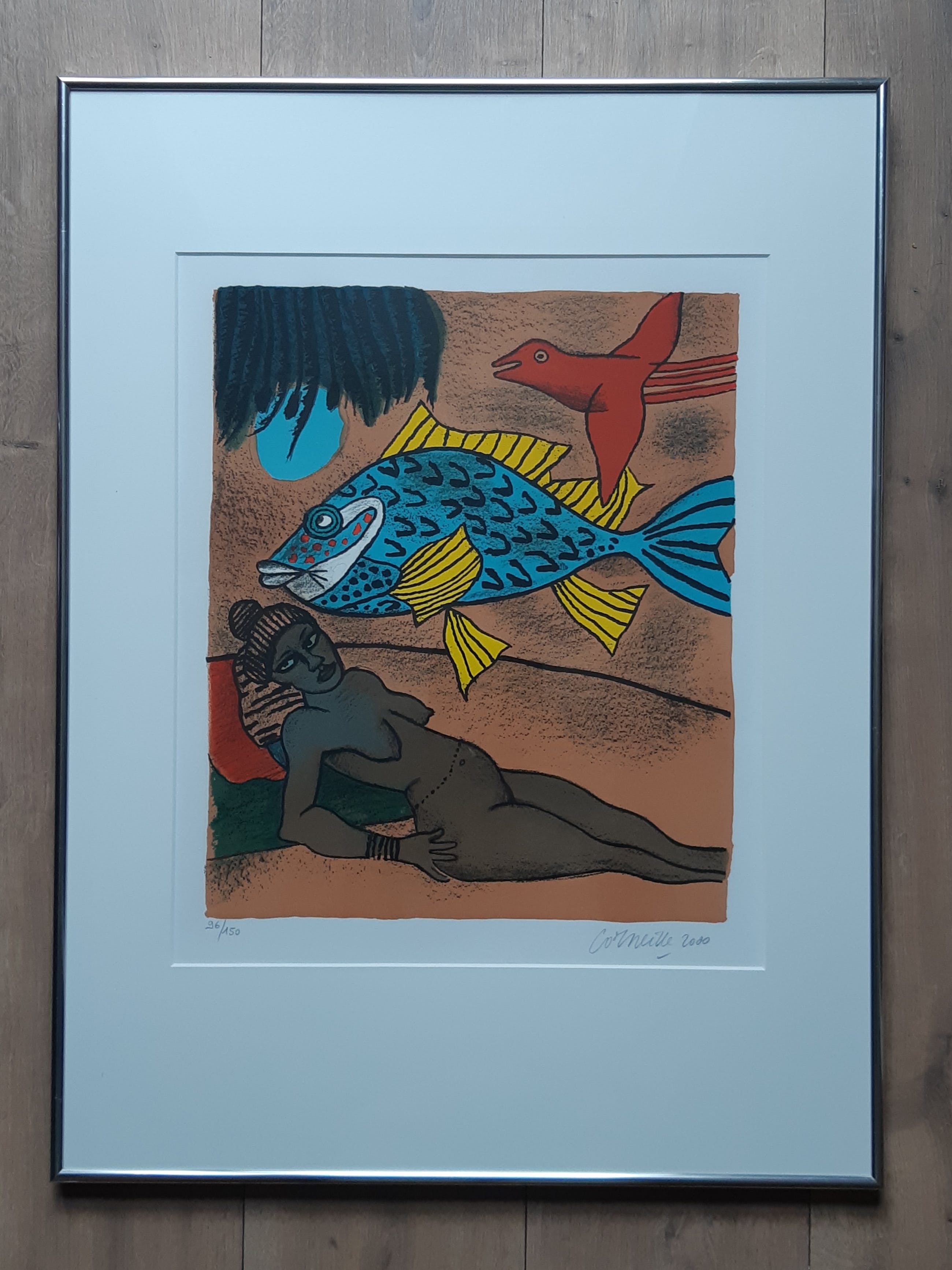 Goed ingelijste zeefdruk van Corneille uit 2000. Het geheel is voorzien van een Passe-partout en ingelijst in een zilverkleurige aluminium lijst. Kan zo aan de muur! In potlood gesigneerd, gedateerd en genummerd door de kunstenaar. Dit is nummer 96 uit een serie van 150 exemplaren.