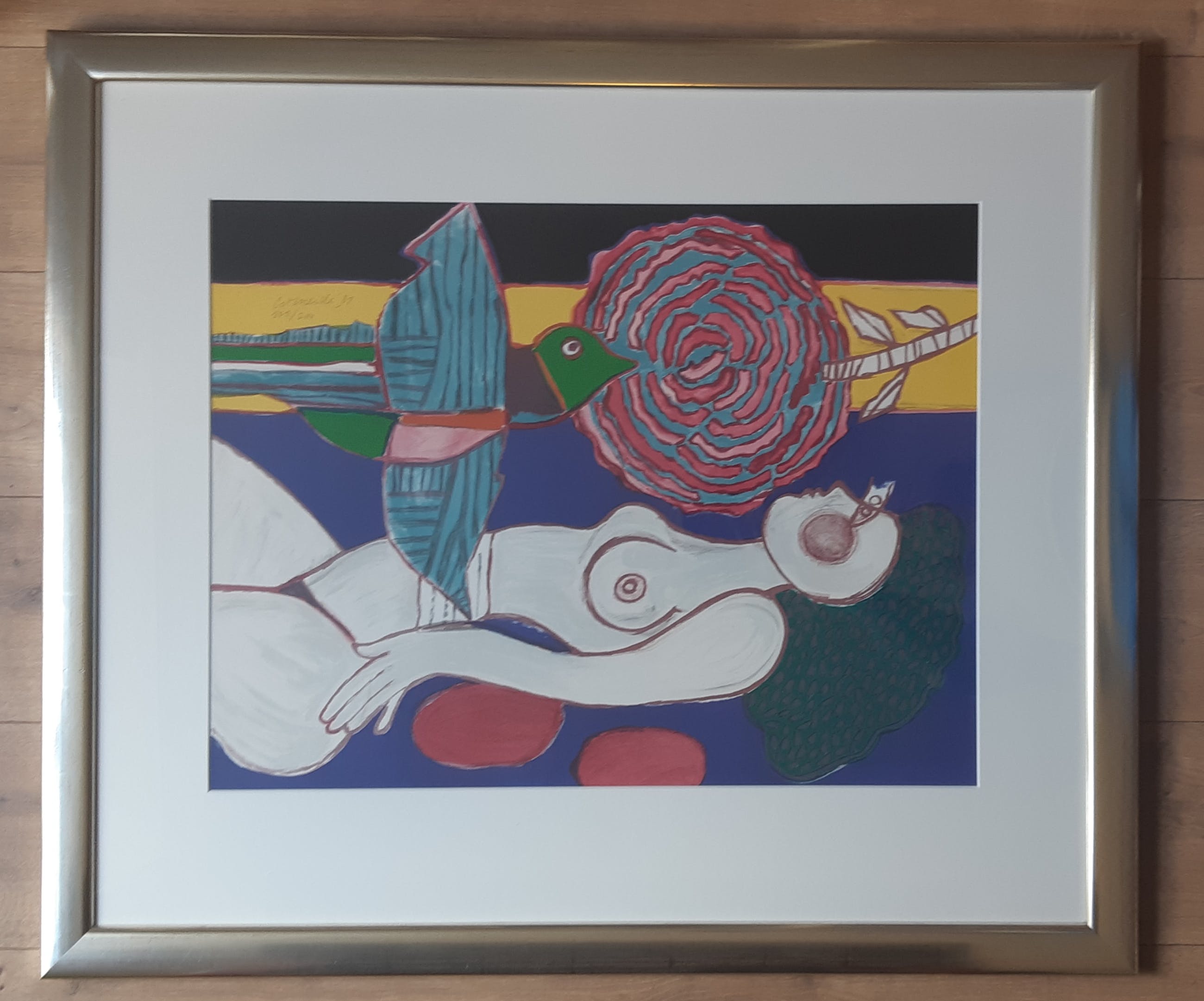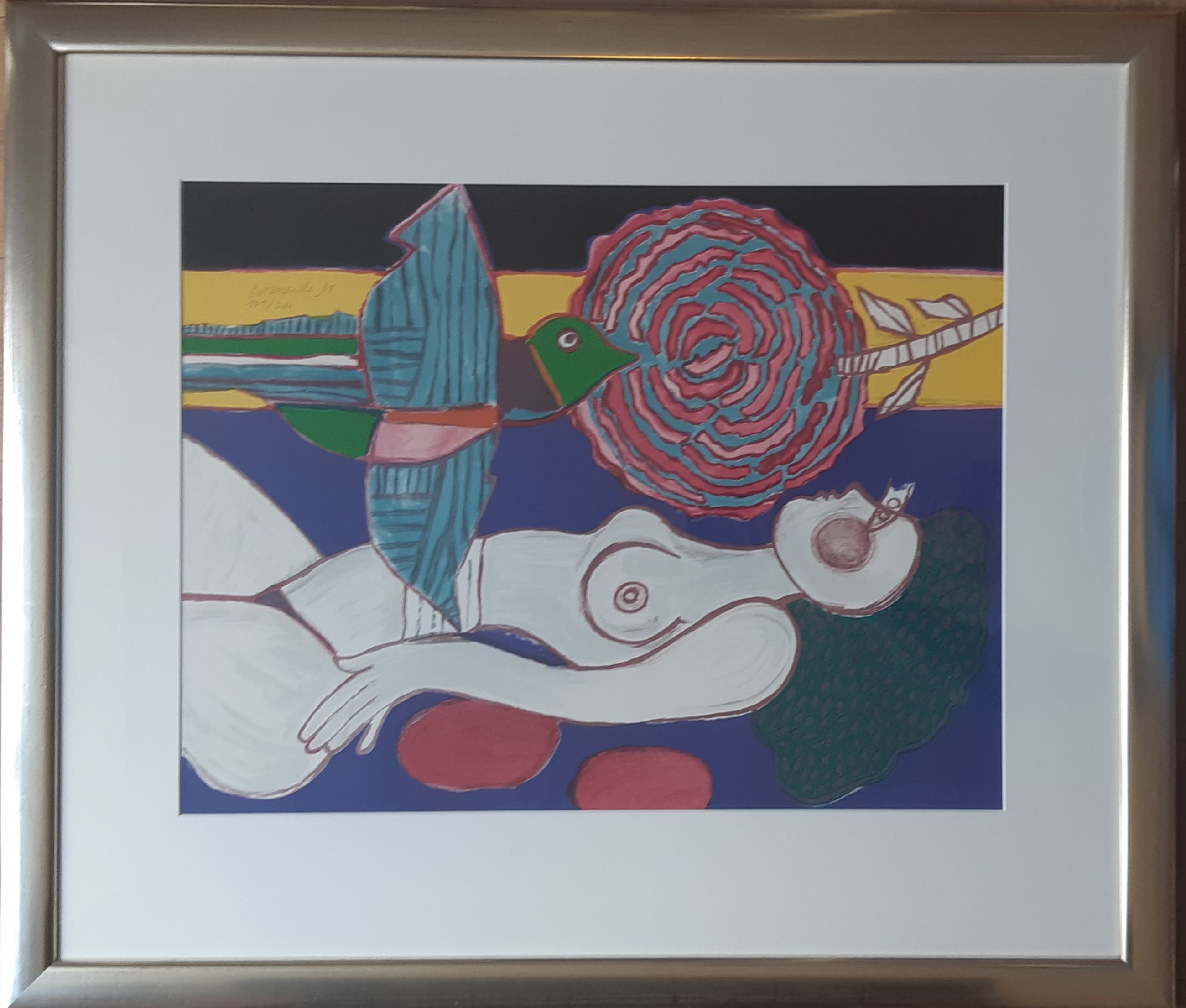 Professioneel en smaakvol ingelijste zeefdruk van Corneille uit 1981. Gelijst in een brede houten zilverkleurige lijst en voorzien van een Passe-partout. Gesigneerd en genummerd in potlood door de kunstenaar. Dit is nummer 101 een serie van 200 exemplaren . Een prachtig geheel dat zo aan de muur kan!