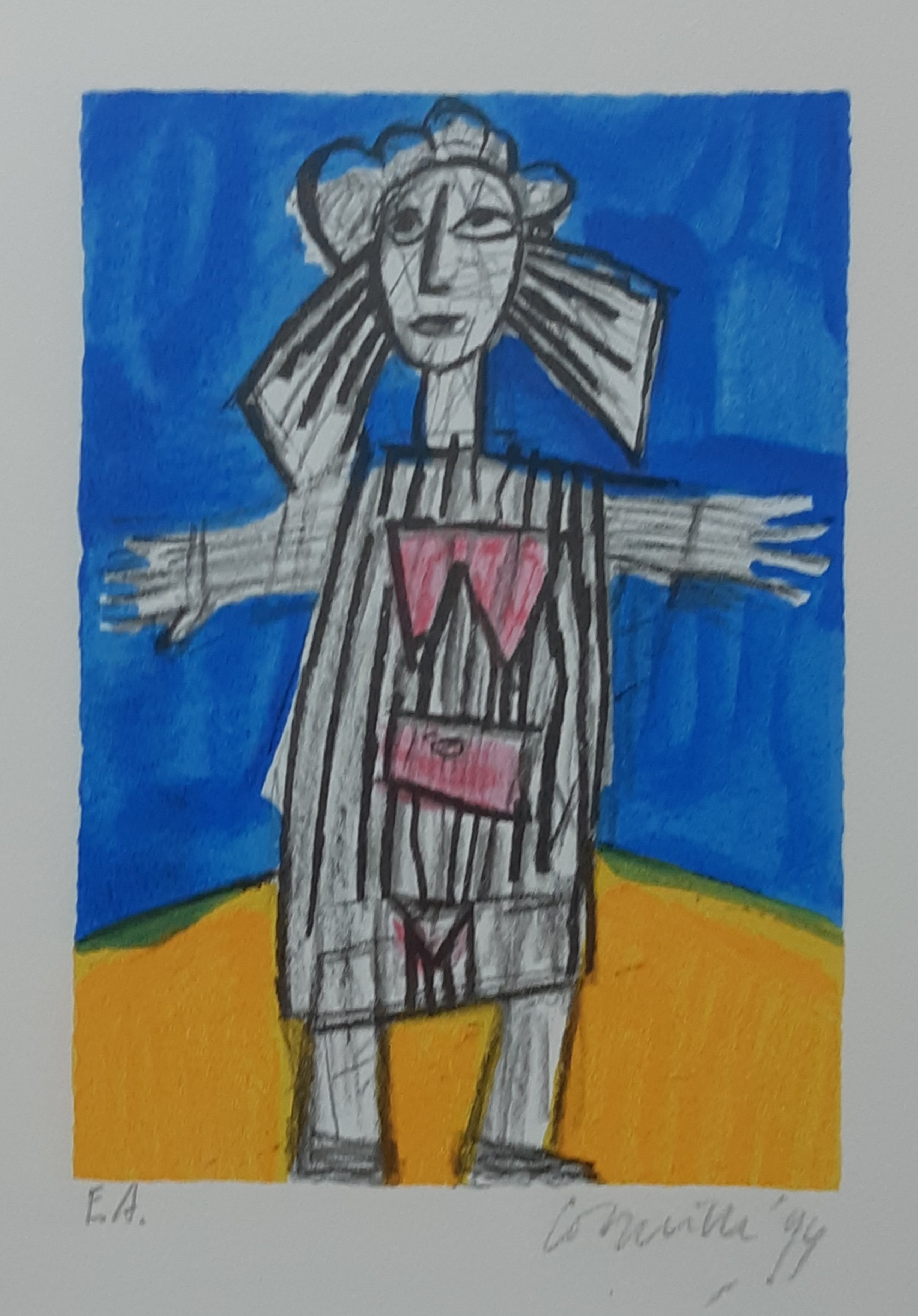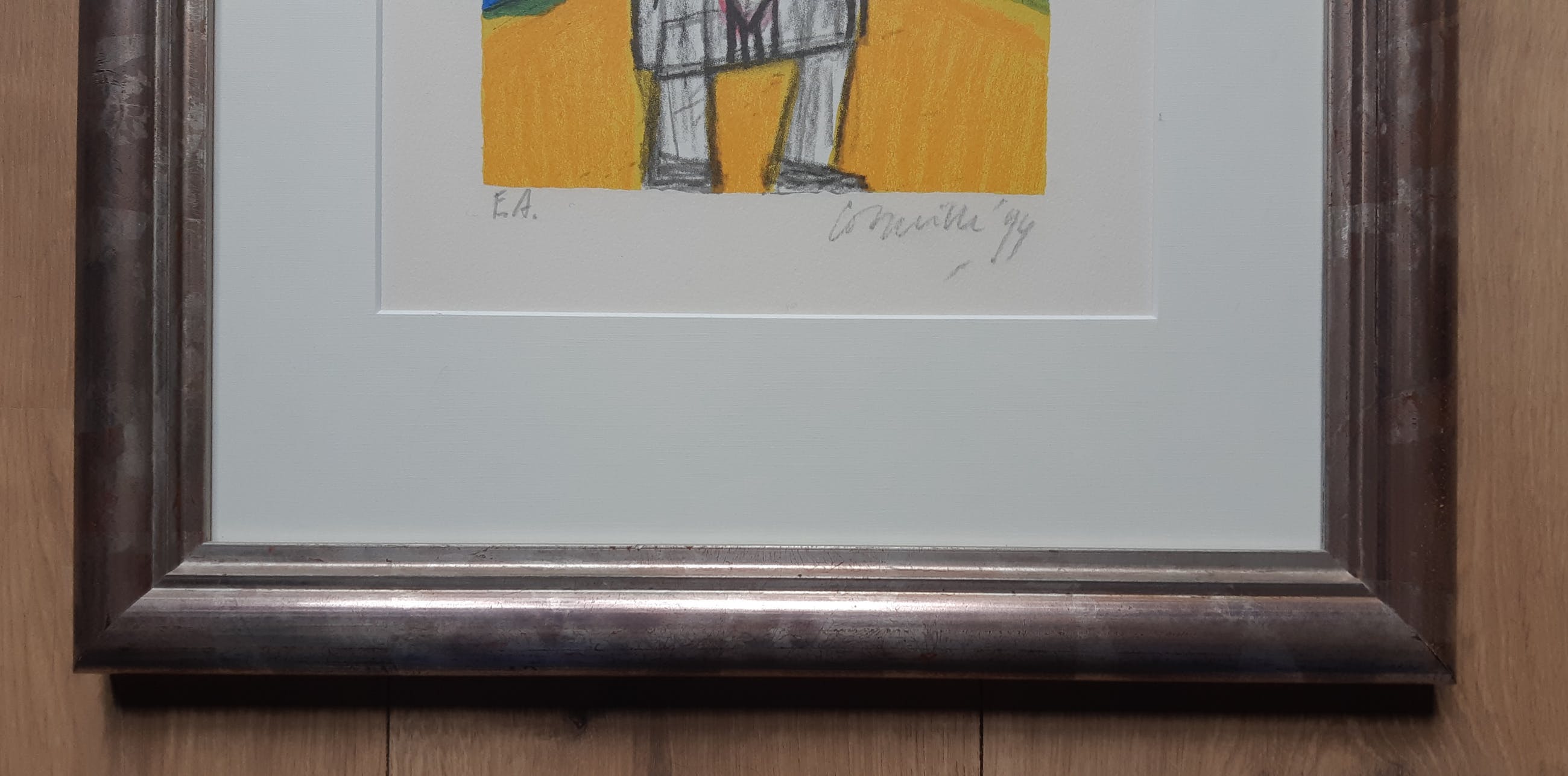 Werkelijk zeer fraai ingelijste zeefdruk van Corneille uit 1994. Perfect en smaakvol ingelijst en voorzien van een Passe-partout. Het werk is gesigneerd gedateerd en genummerd ( Epreuve D'artiste) in potlood door de kunstenaar. Kan zo aan iedere muur!!
