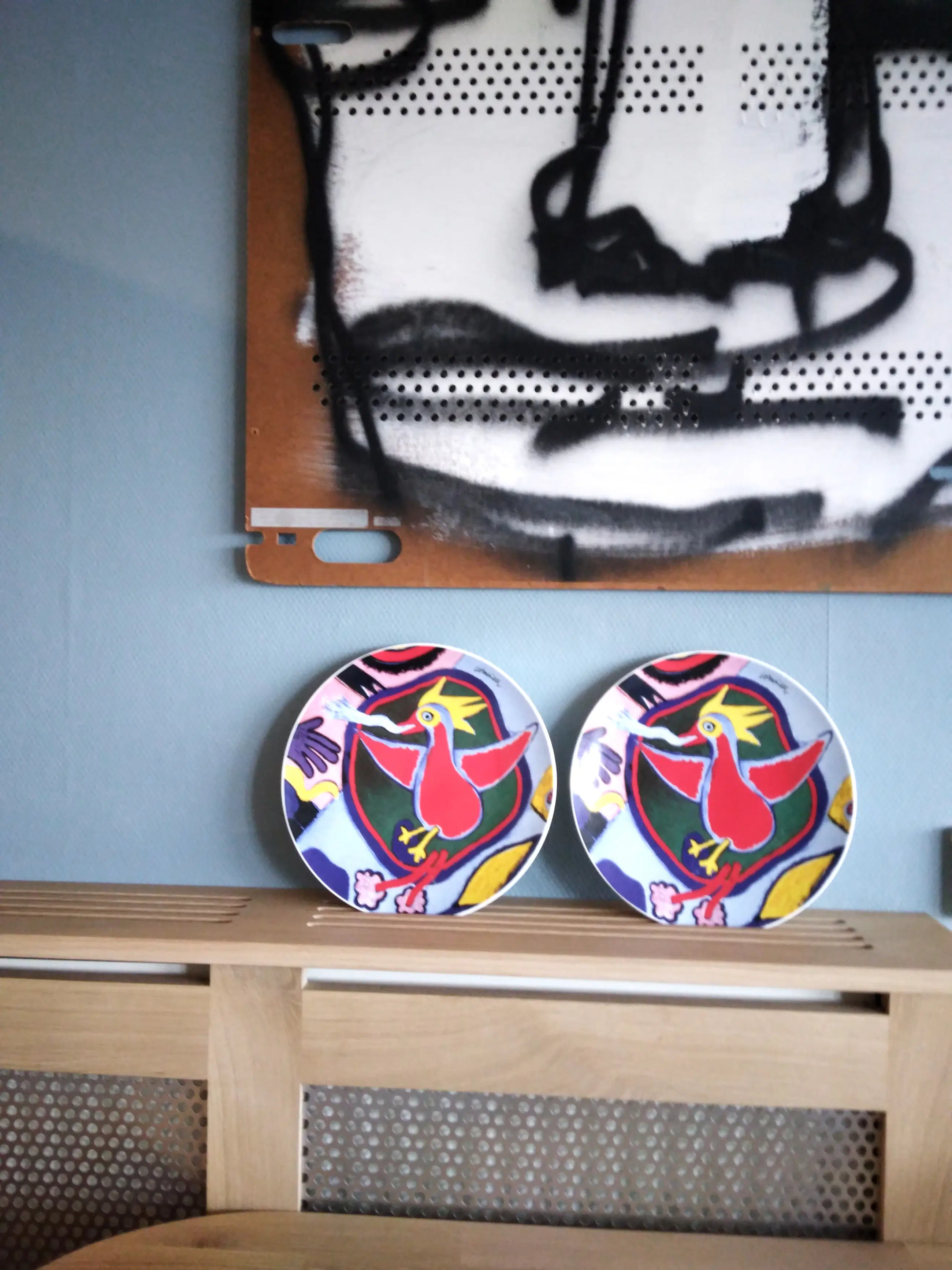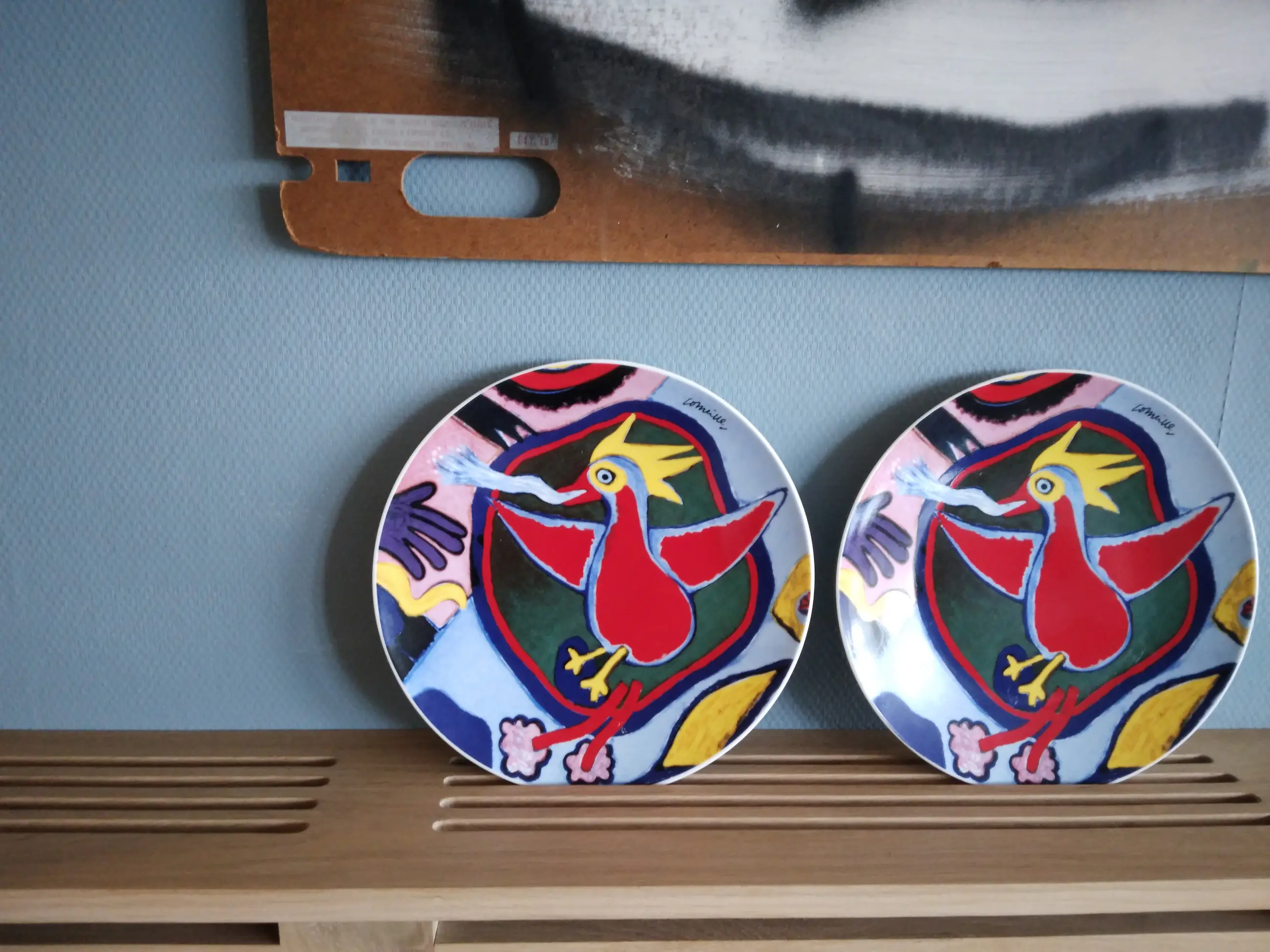 2 mooie grote borden met de afbeelding van de Vuurvogel van Corneille. Echte Cobra kunst. De borden zijn in goede staat en op zowel de bovenkant als onderkant gesigneerd.