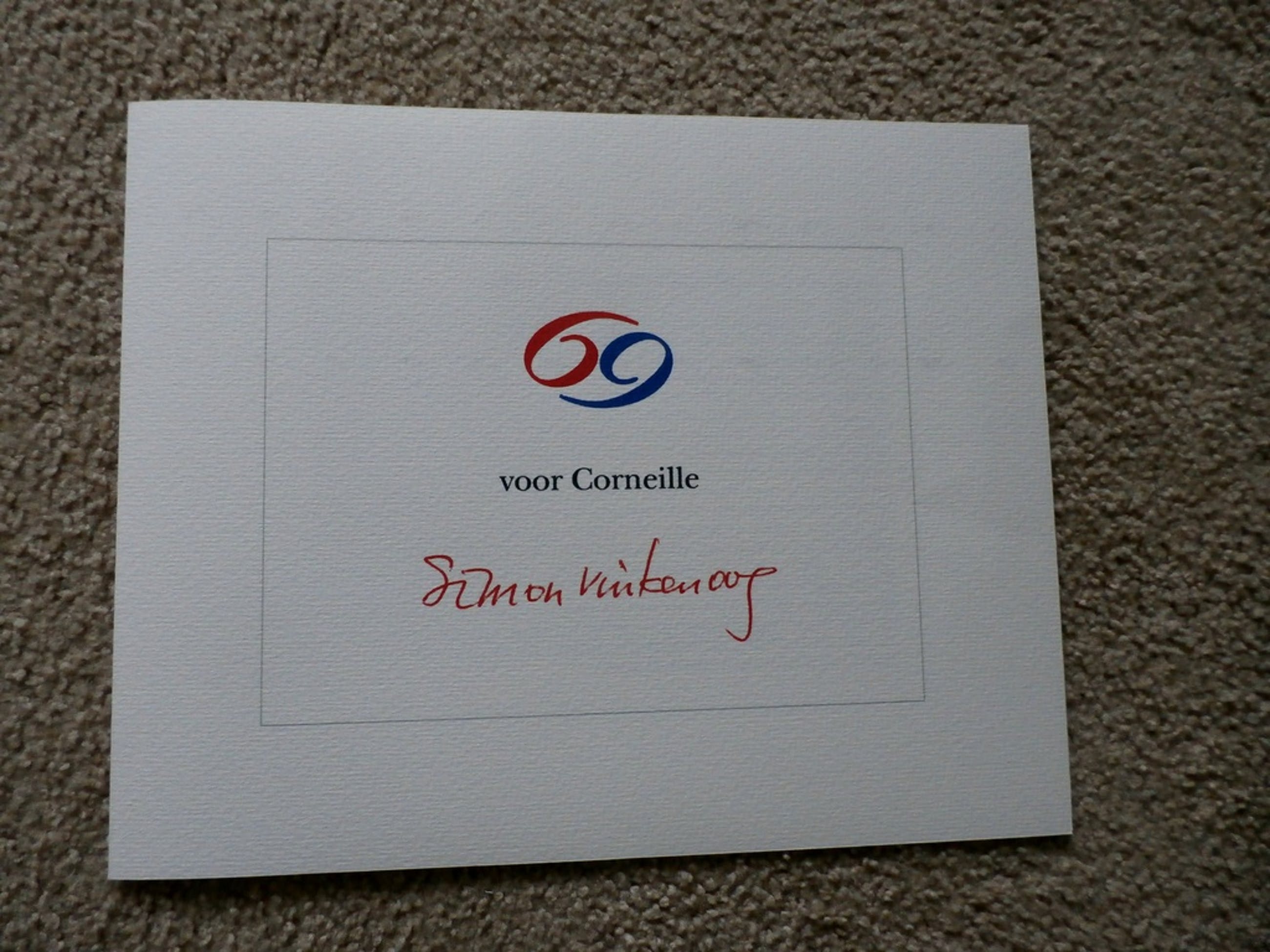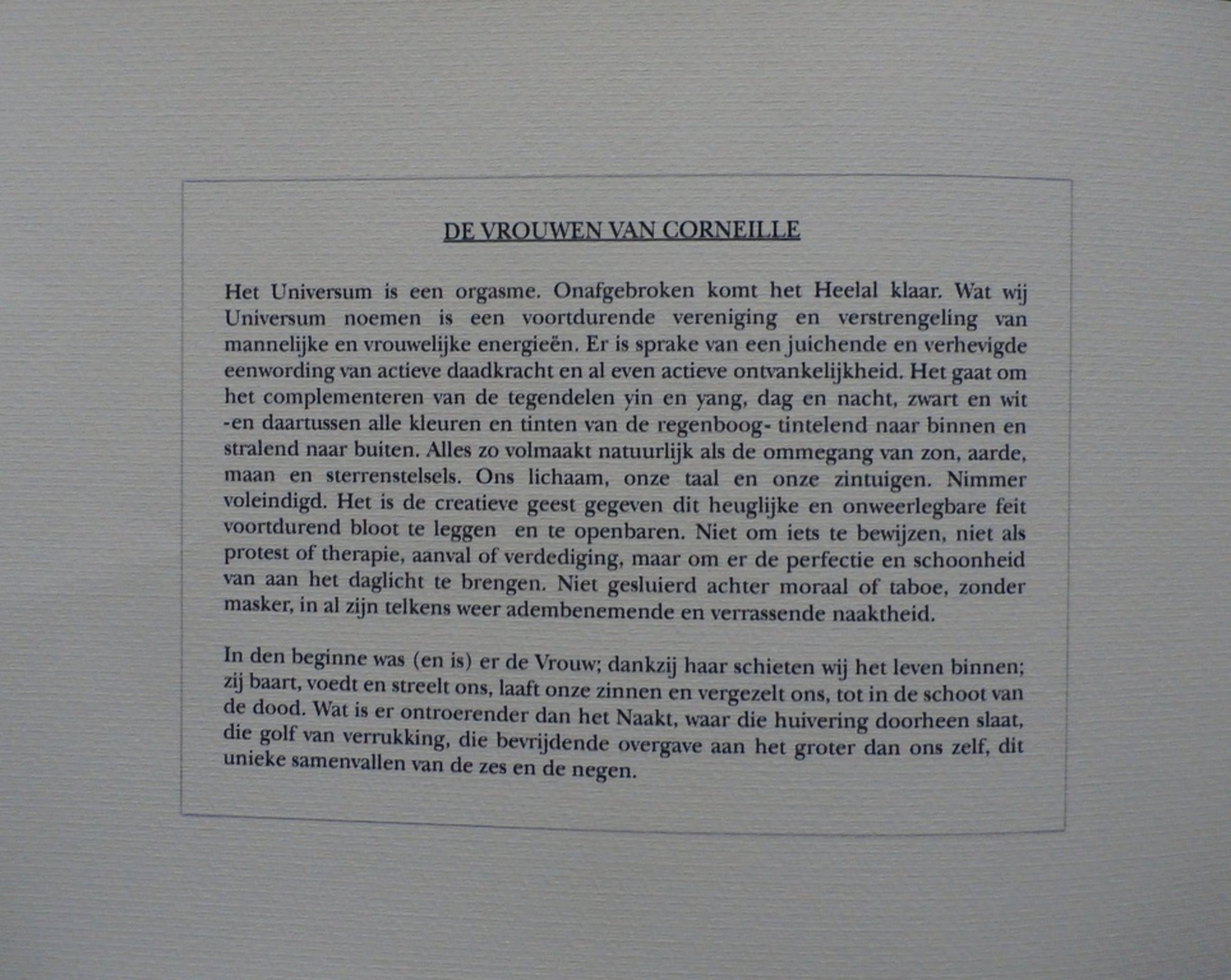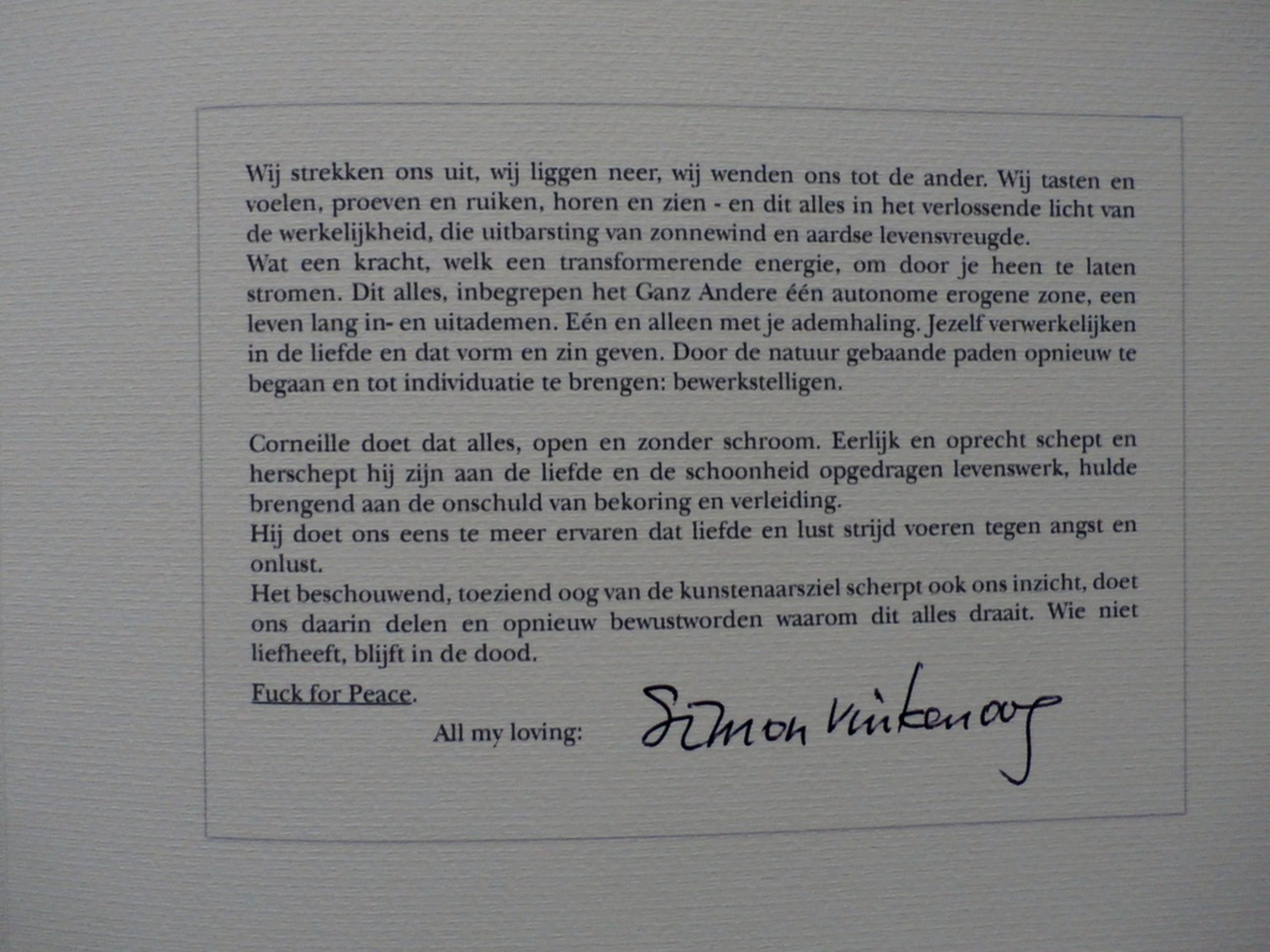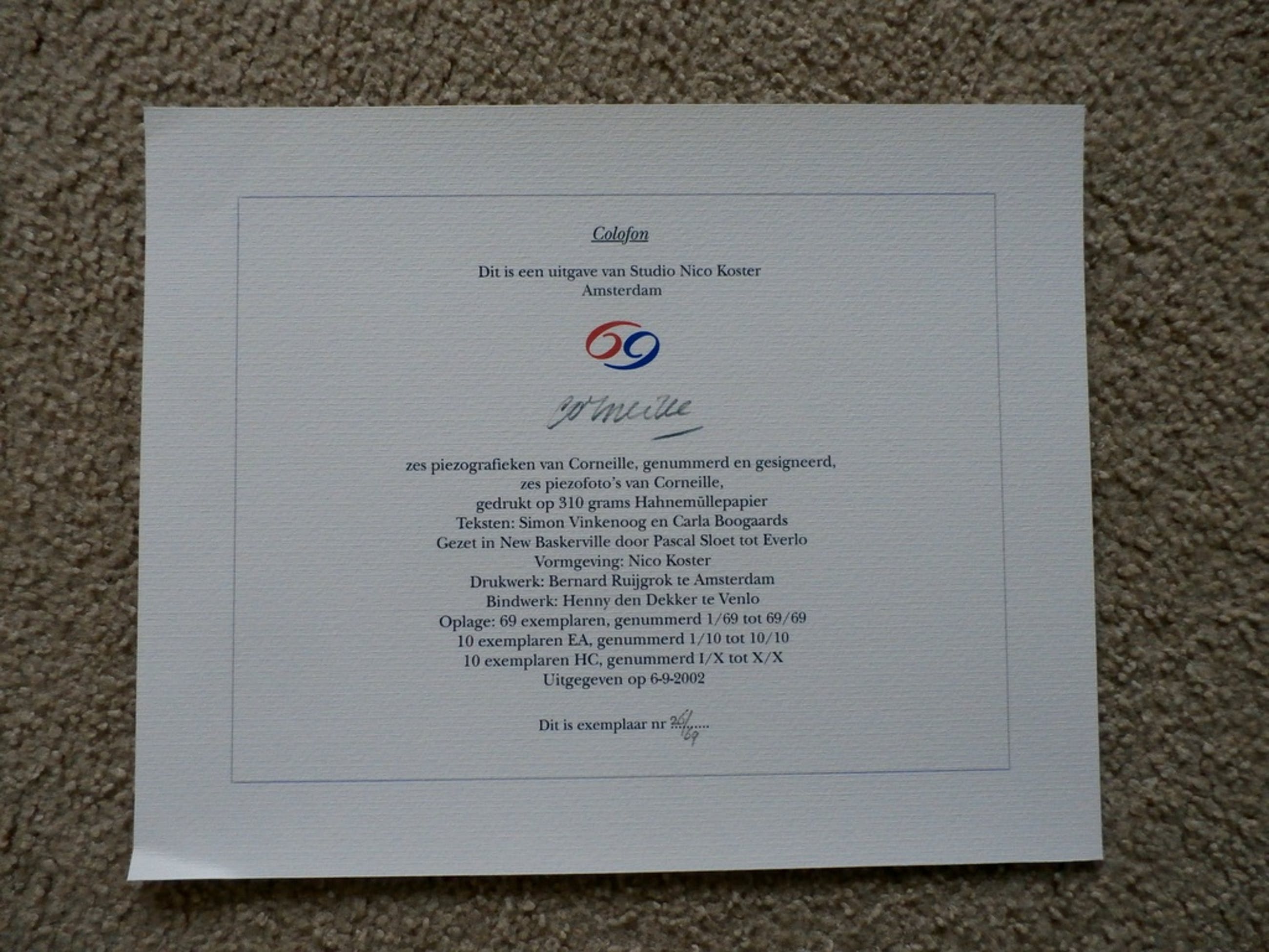 Uitgavemap voor Corneille zijn 69e verjaardag. Uitgave: studio Nico Koster. De piezofoto's en piezografieken zitten er niet in. Wel de door Corneille gesigneerde colofon (nummer: 26/69) en de door Simon Vinkenoog gesigneerde bijlage. Afmetingen map: H33 x b28 cm.