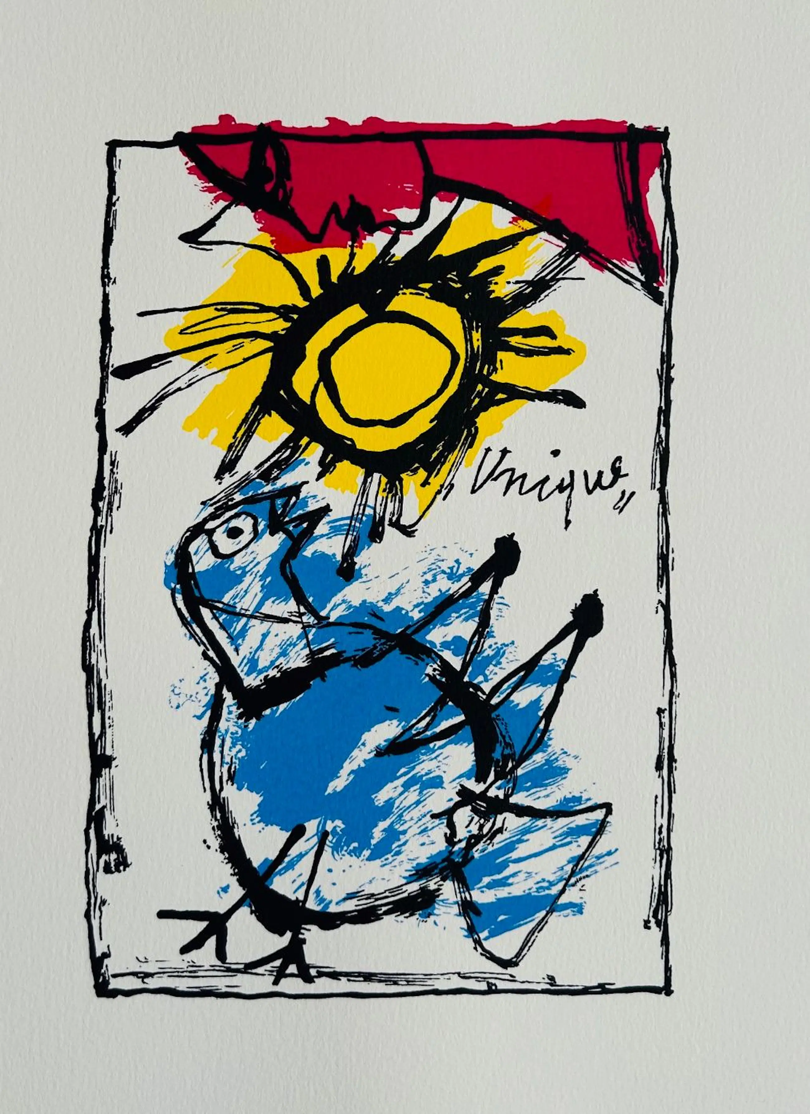 Expressionistisch werk van Cobra-kunstenaar Corneille. Het werk is gedrukt op geschept papier en in zeer goede staat. Het werk kunt u vooraf komen bekijken en beoordelen. Het werk kan na aankoop afgehaald worden bij galerie Rotor in Gorcum of verzonden worden per post. Ophalen is leuker dan drinken we gelijk koffie. Wie van architectuur houdt mag een bezoek aan ons rijksmonument ook zeker niet overslaan. Een pand vol kunst en een ware beleving. Het historische stadje Gorcum, met de grootste intact zijnde vesting en met daarin het Gorcums Museum met een goede reputatie op het gebied van hedendaagse kunst zijn op loopafstand te bereiken.