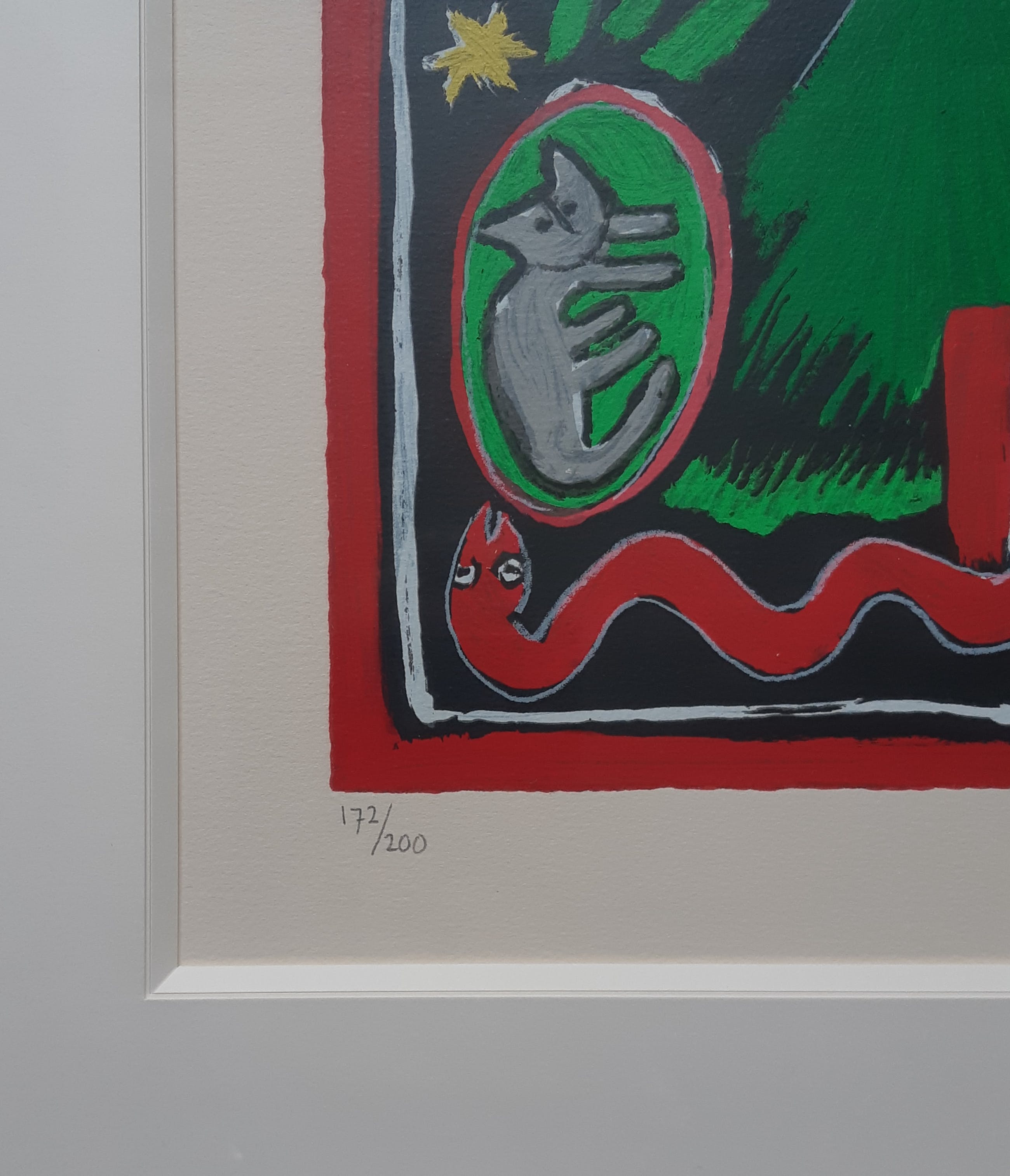 Zeer smaakvol ingelijste zeefdruk van Corneille. Ingelijst in een goudkleurige houten lijst en voorzien van een Passe-partout dat ervoor zorgt dat het werk verdiept in de lijst ligt. Gesigneerd, gedateerd en genummerd in potlood door de kunstenaar. Dit is nummer 172 uit een serie van 200 exemplaren.