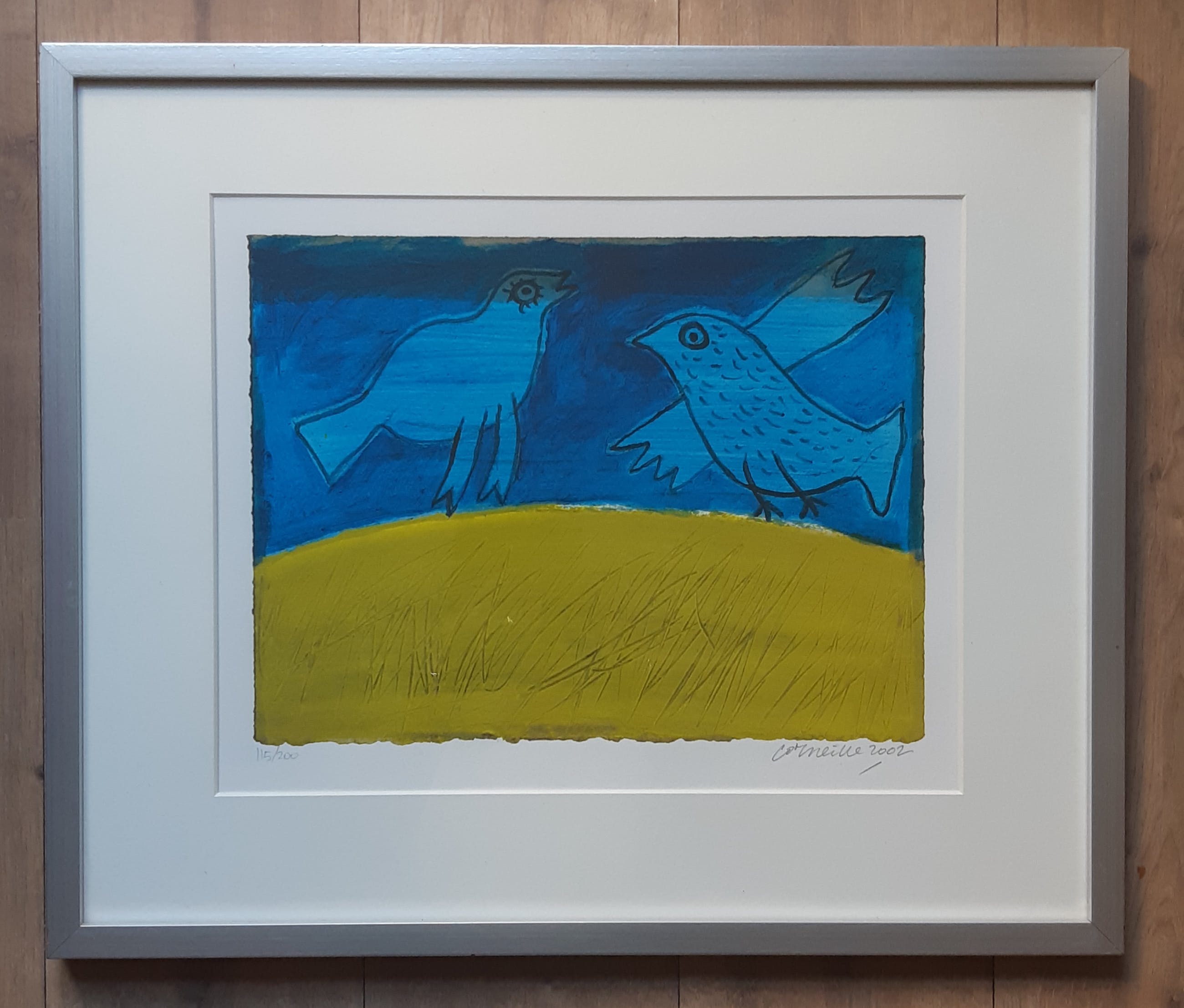 Fraaie zeefdruk van Corneille uit 2002. Ingelijst in een houten zilverkleurige lijst en voorzien van een Passe-partout. Het geheel meet 63 x 53 cm. Mooie, frisse en sterke kleuren. Gesigneerd, gedateerd en genummerd in potlood door de kunstenaar. Dit is nummer 115 uit een serie van 200 exemplaren. Erg leuk werk!