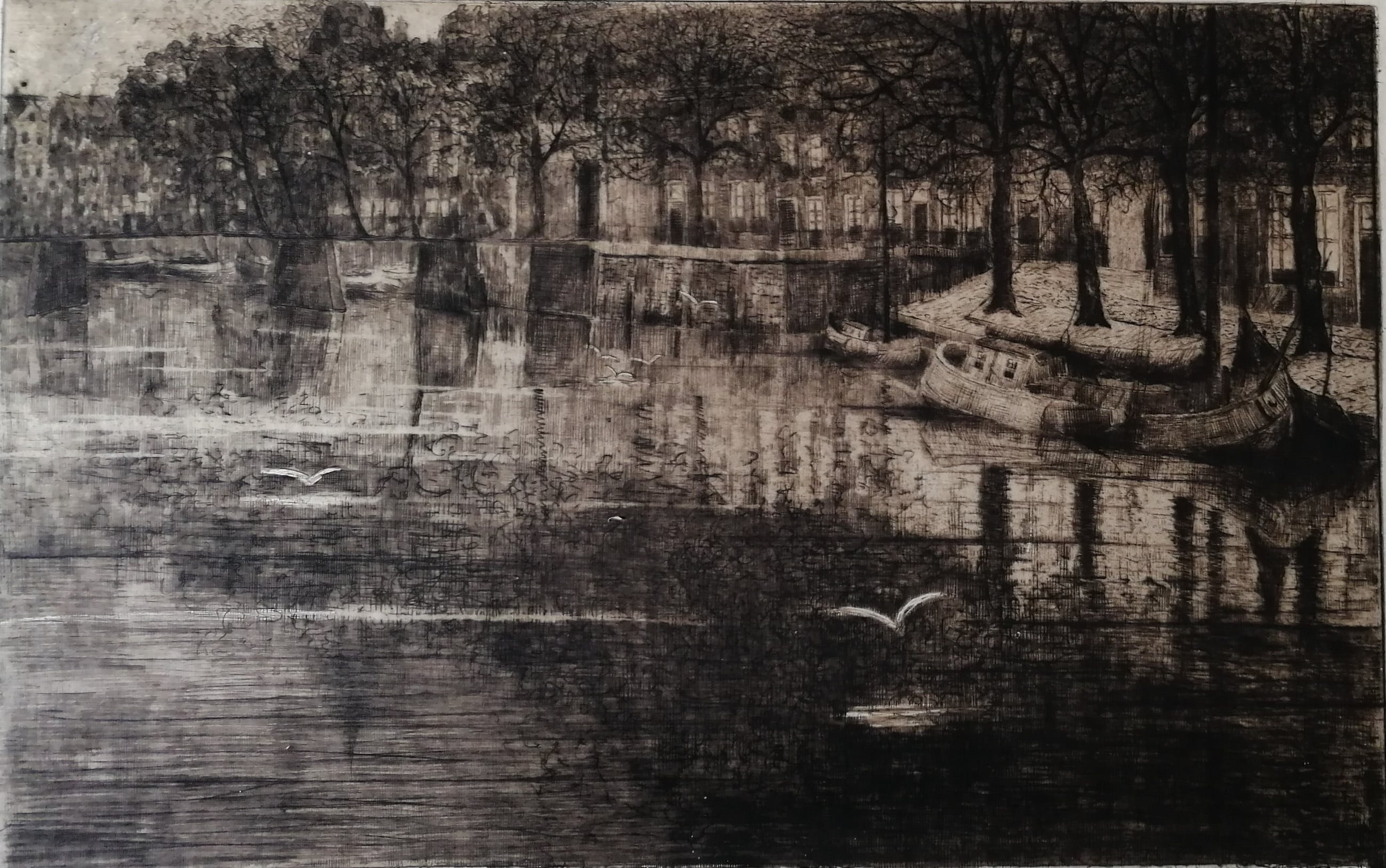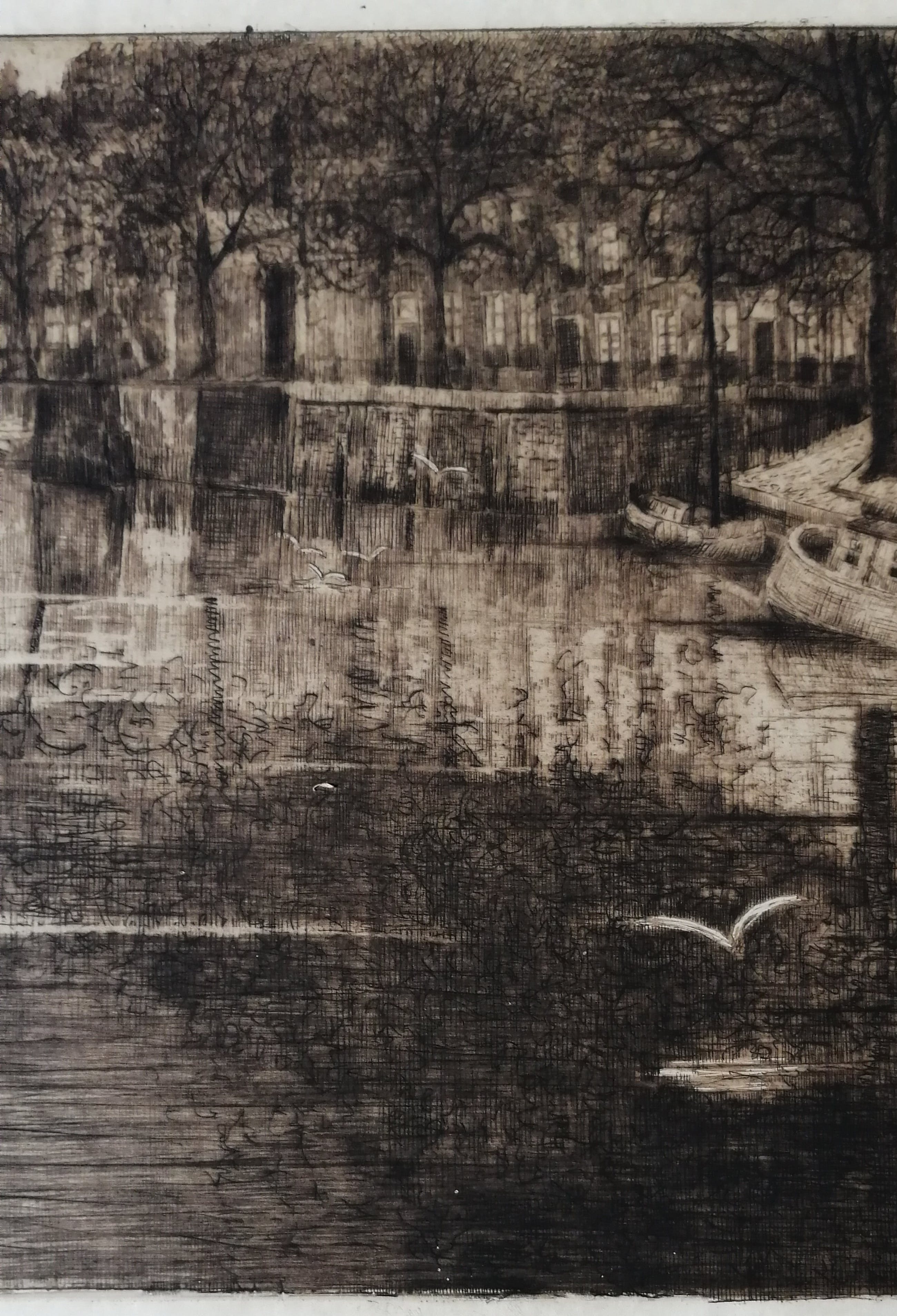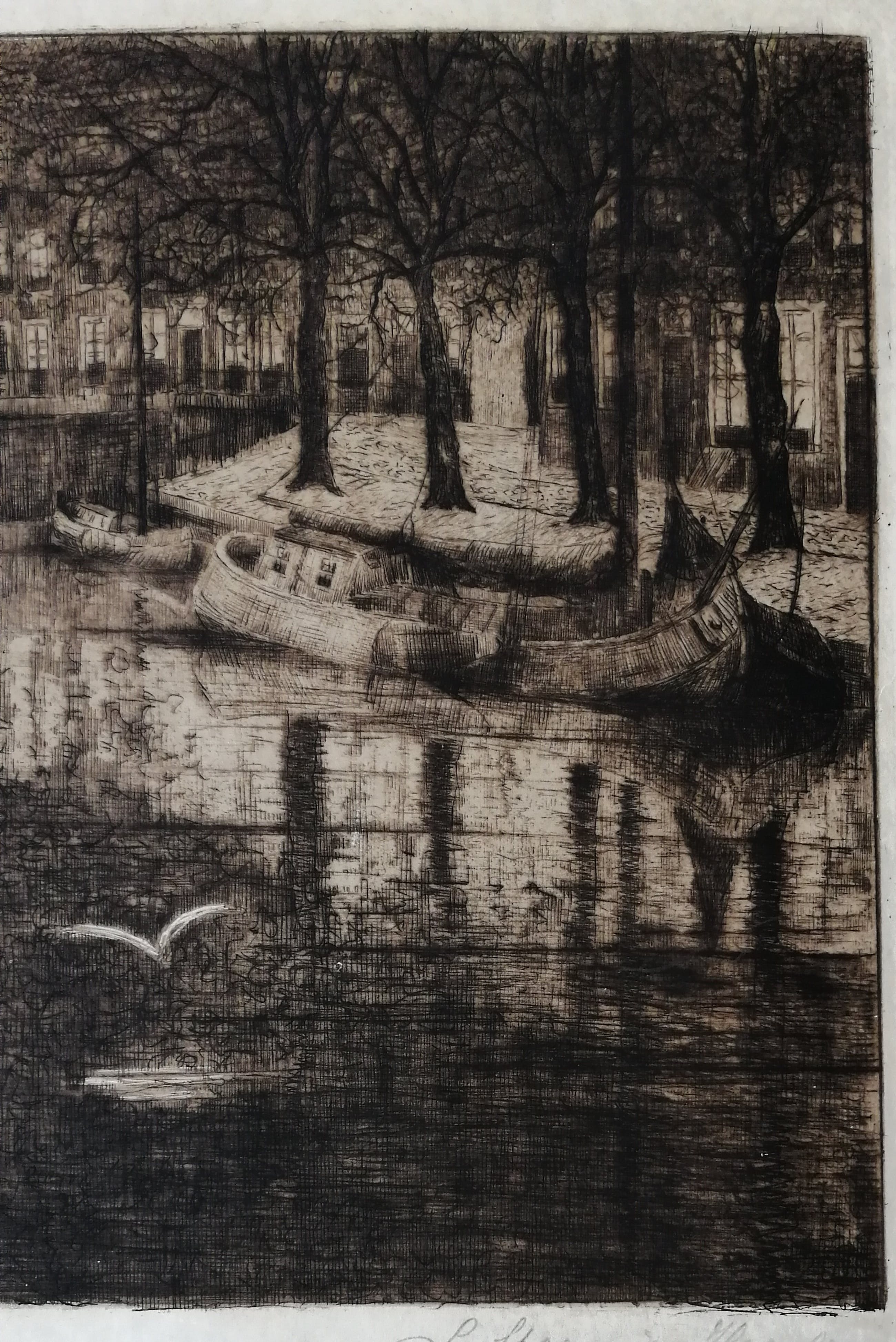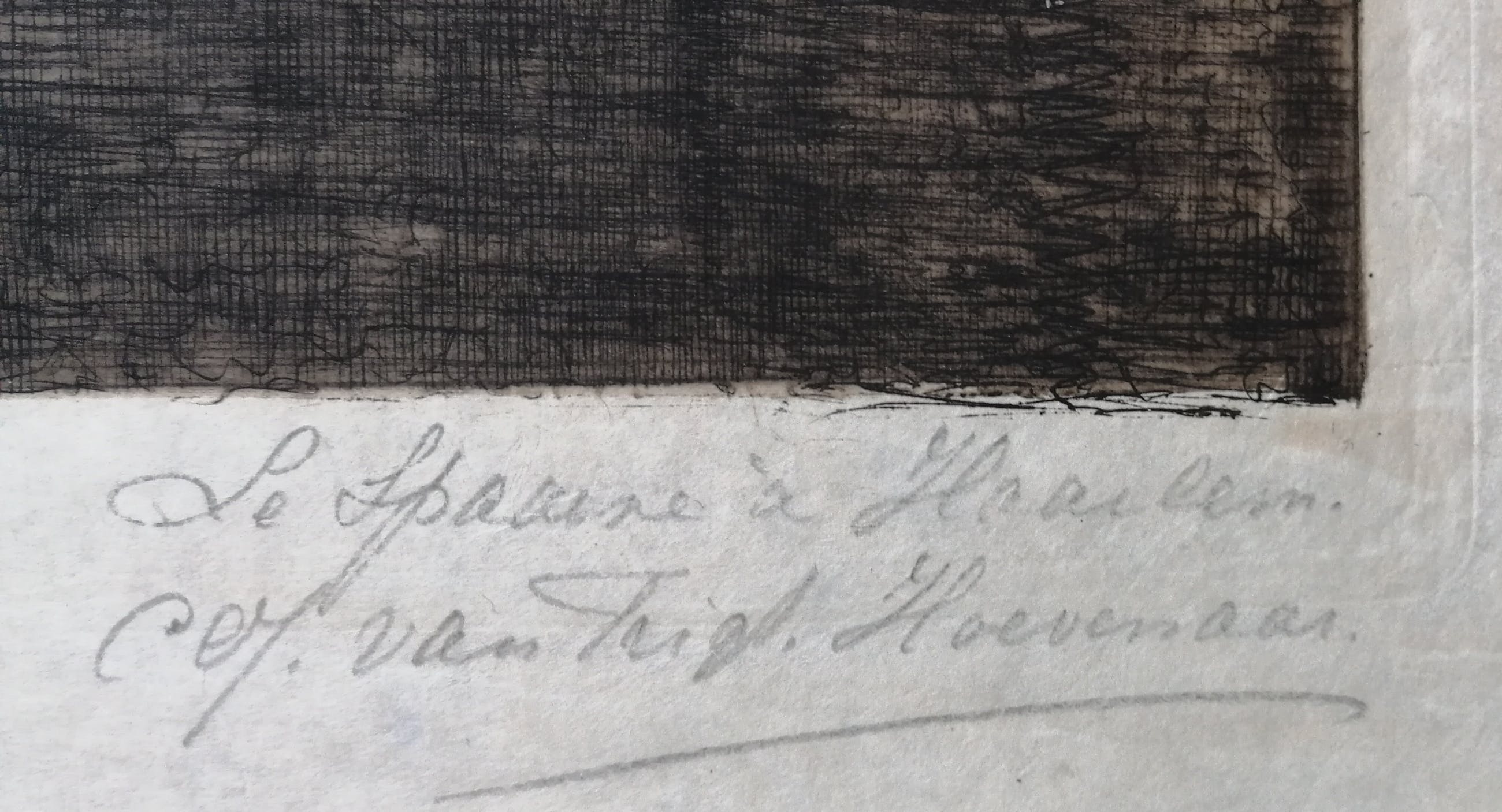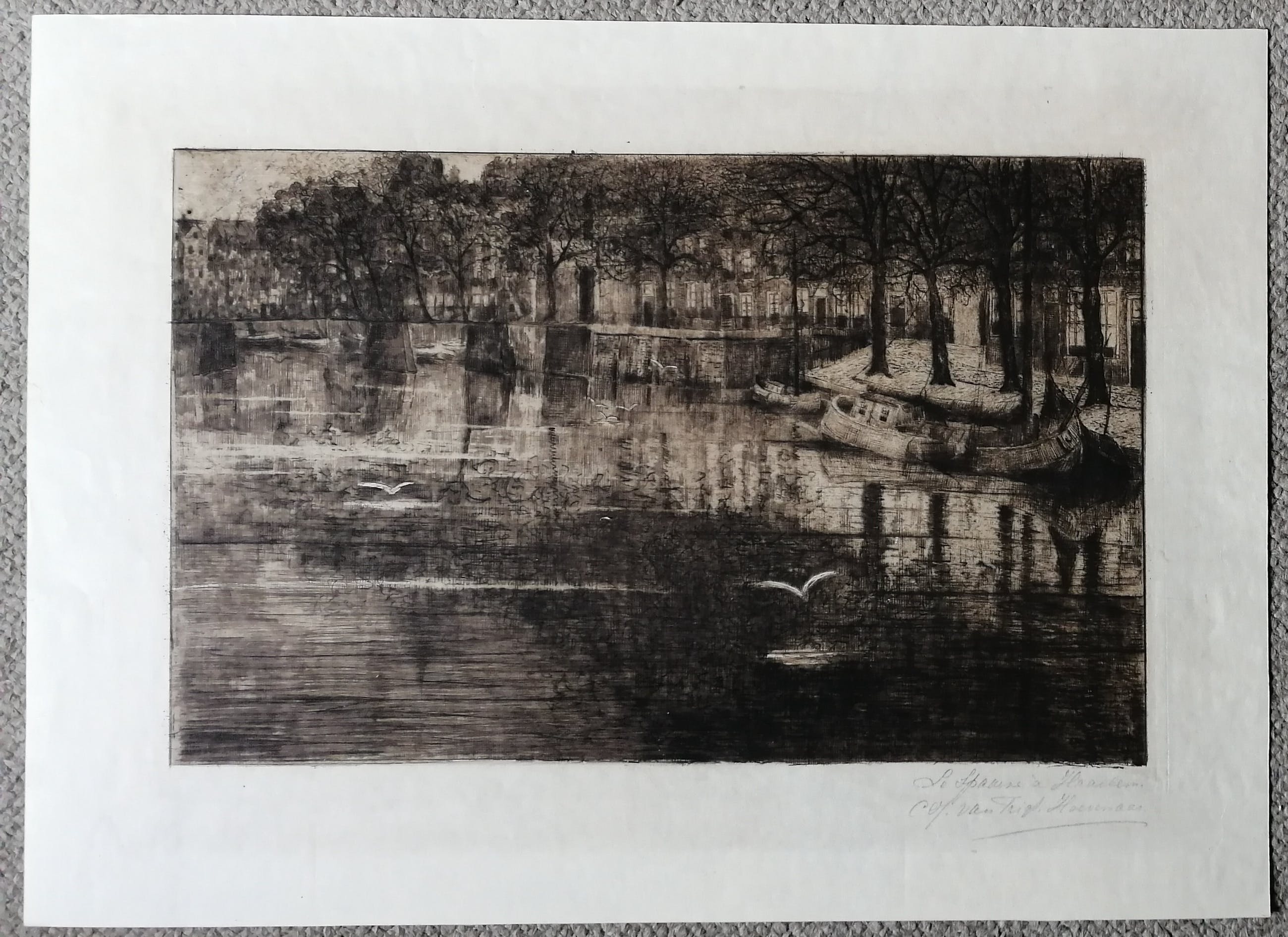Ets voorstellende het Spaarne te Haarlem ter hoogte van de Bakenessergracht, Gravestenenbrug en Teylermuseum. Van deze voorstelling heeft zij ook een olieverf op doek vervaardigd. Potlood gesigneerd en getiteld rechtsonder. Beeldmaat 24x38 cm. Bladmaat 35x48 cm. Losbladig. Cornelis Christina Johanna van Trigt-Hoevenaar werd geboren te Leeuwarden op 8 oktober 1854 en overleed te Haarlem op 15 maart 1924. Zij was Schilder, tekenaar, beeldhouwer en graficus. Zij was getrouwd met de kunstschilder H.A. van Trigt.
