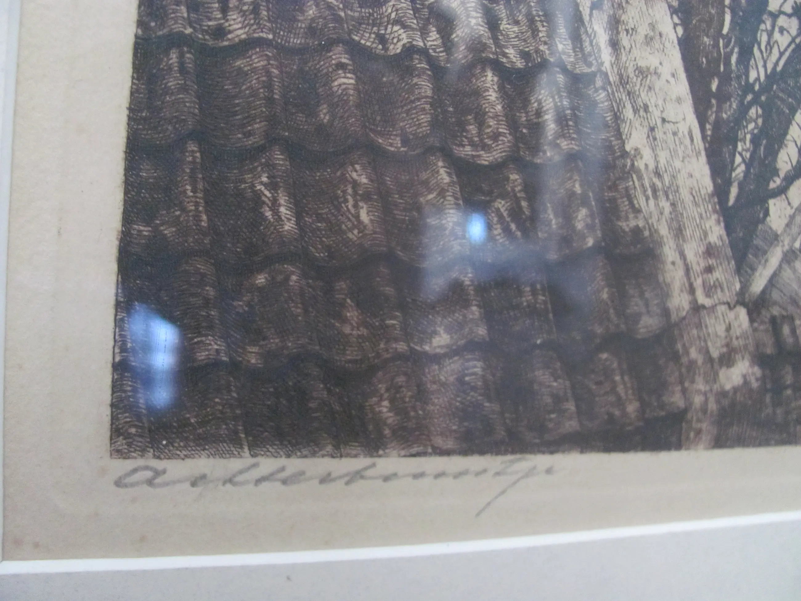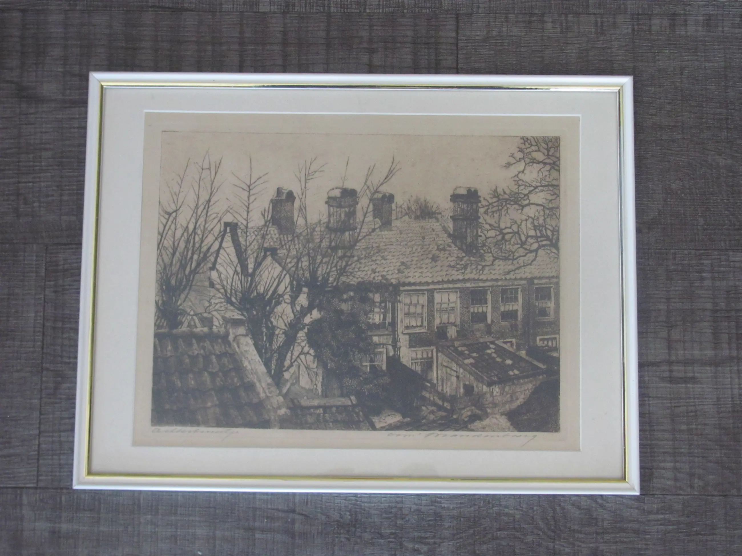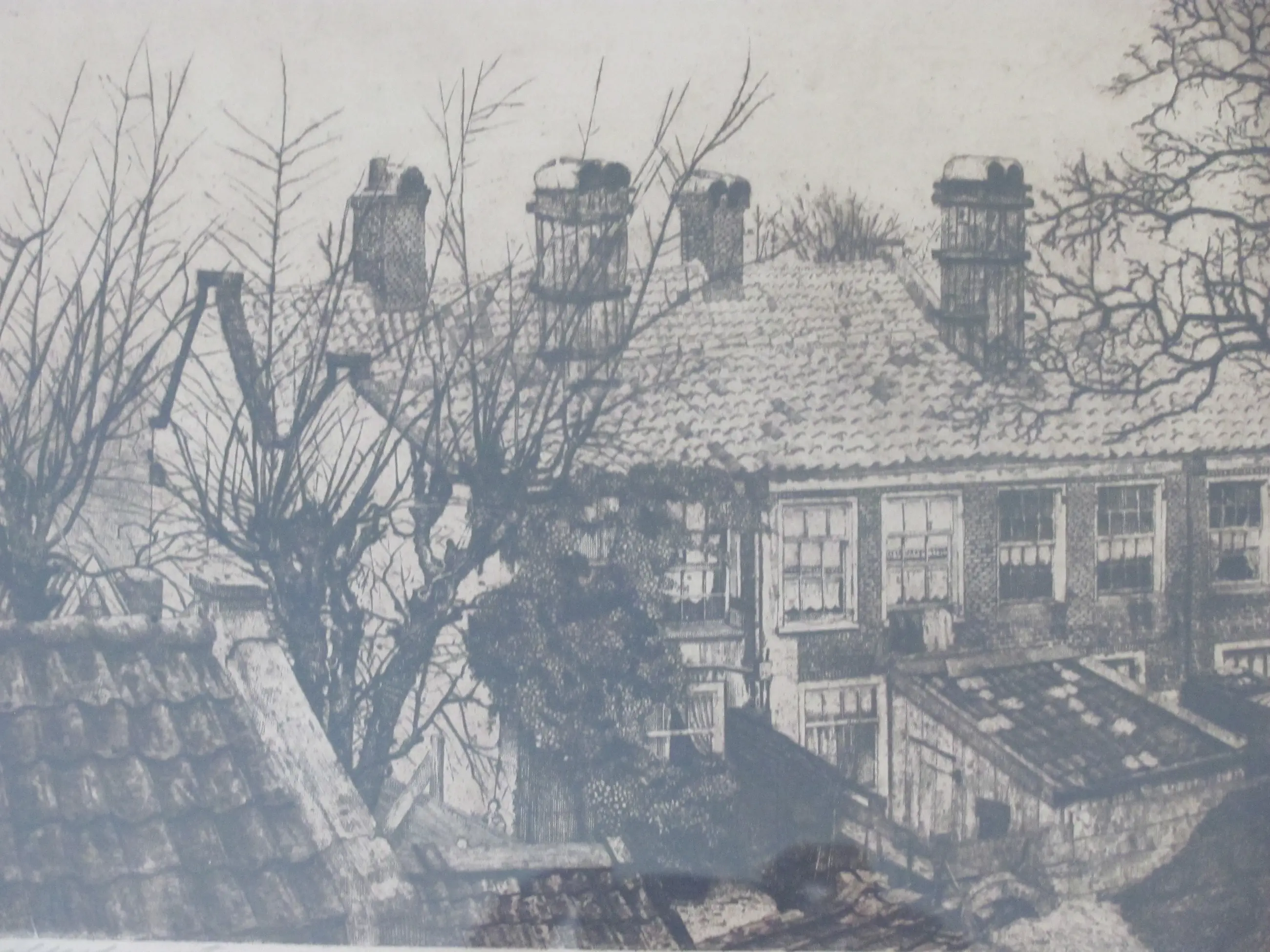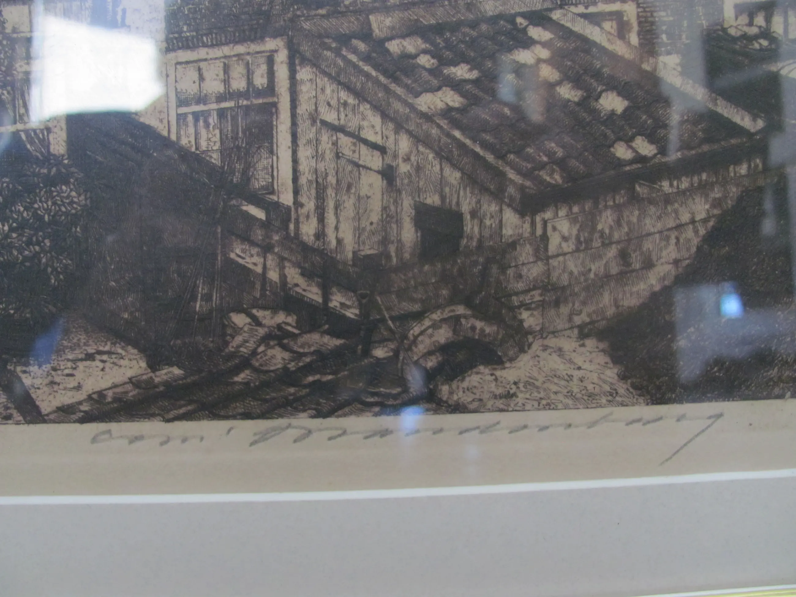 Ets van Cornelis Brandenburg. Linksonder met potlood getiteld (Achterbuurtje) en rechtsonder met potlood gesigneerd. De titel van de ets is "Achterbuurtje". Dit is de achterkant van de huizen in de Kuiperstraat in Amsterdam.