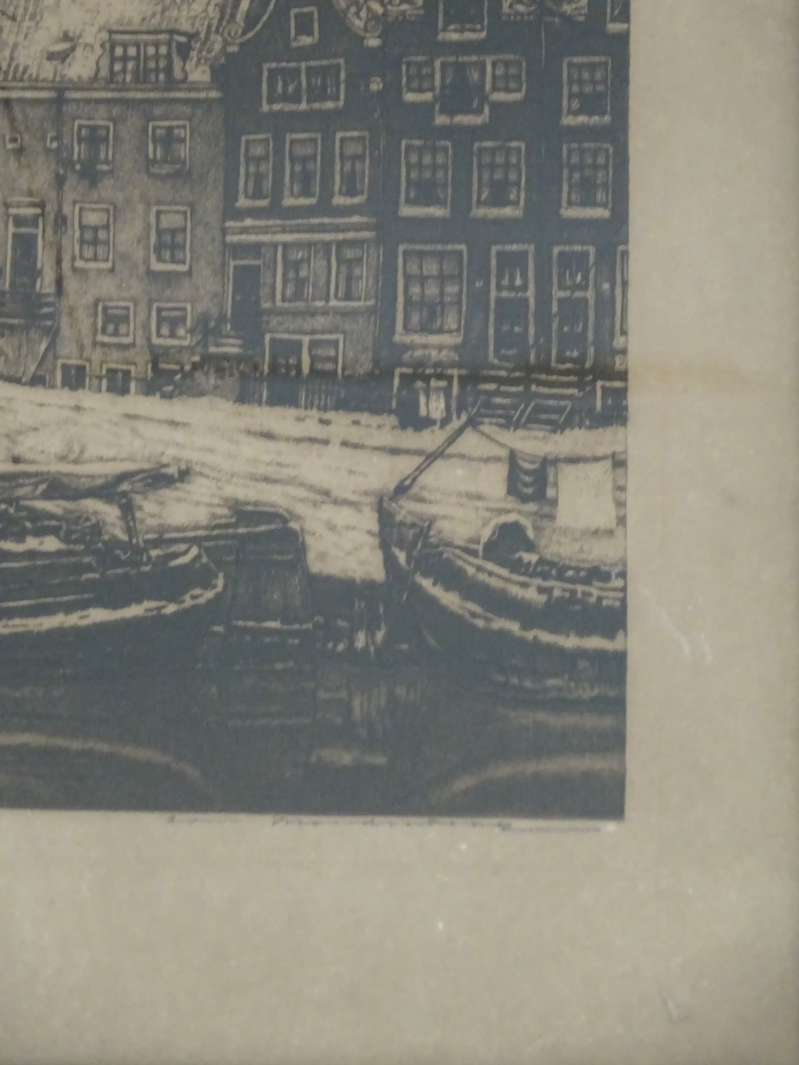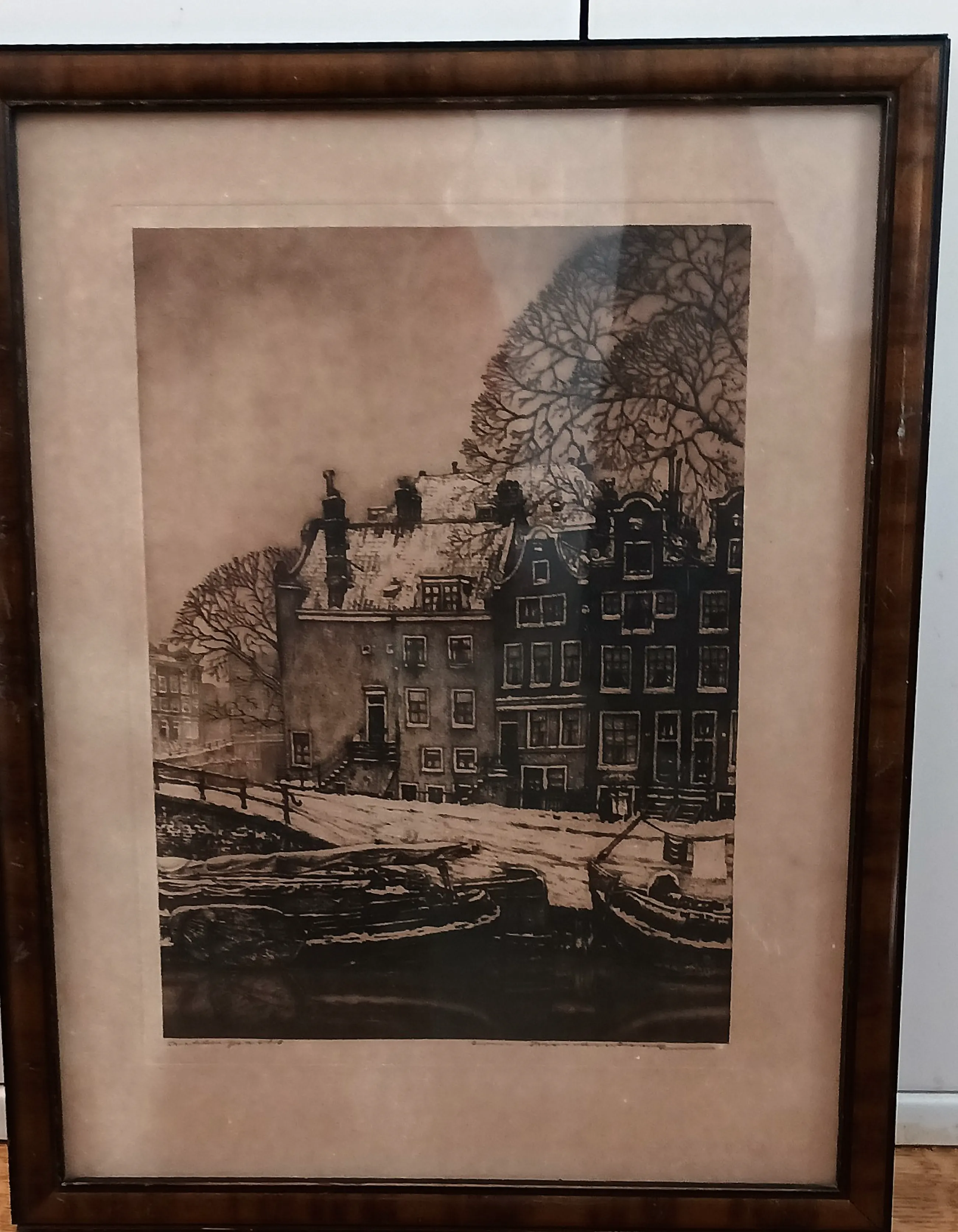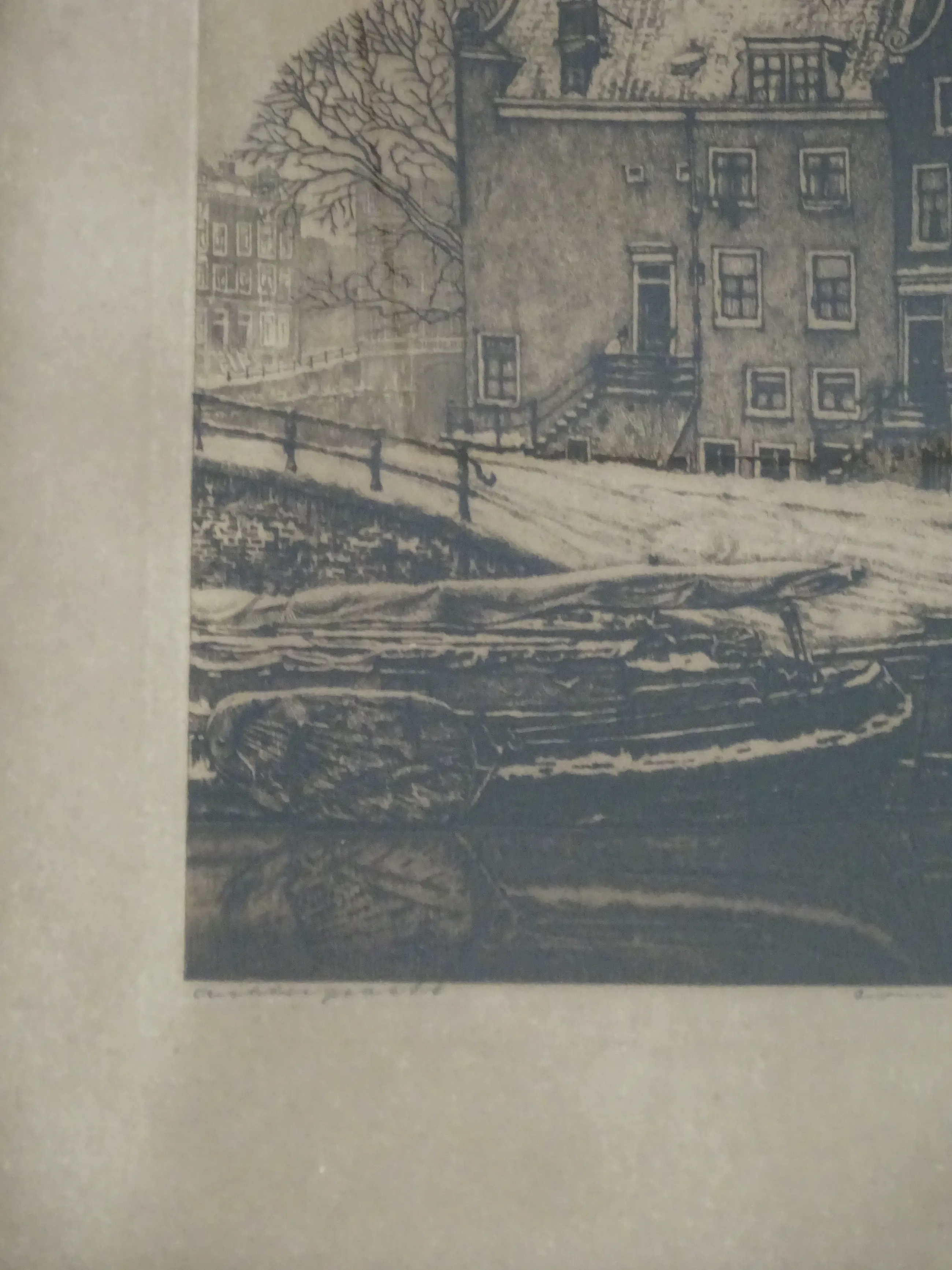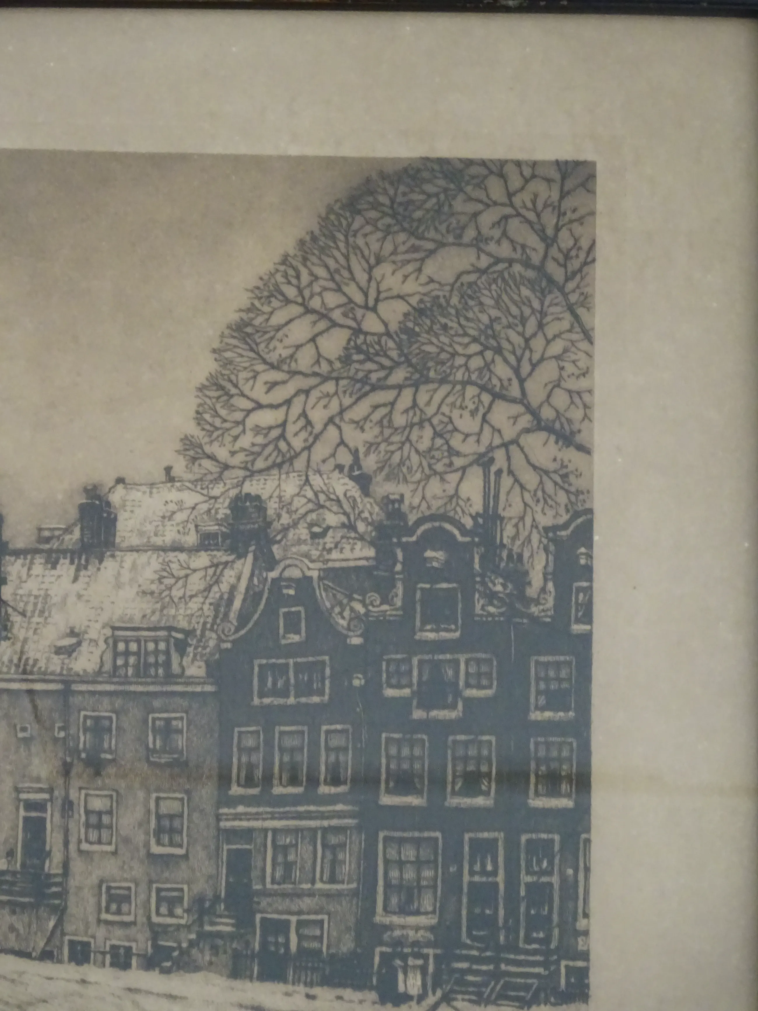 Oude Gravure van de Achtergracht te Amsterdamin mahonie houten lijst.