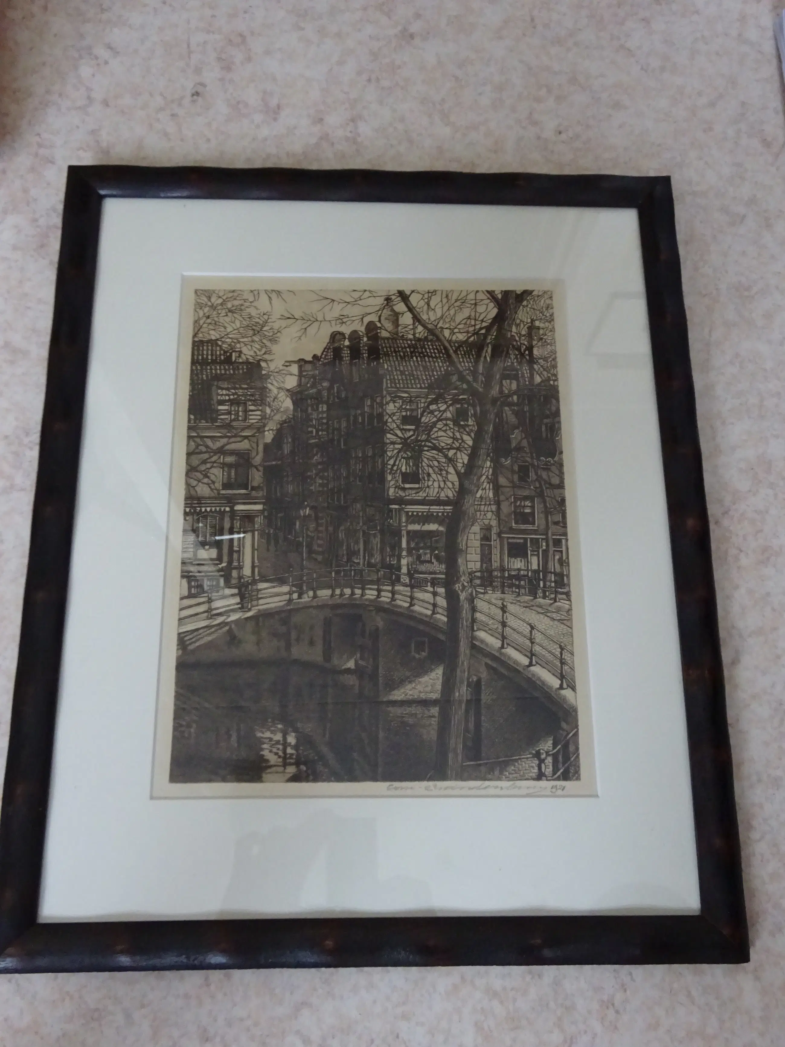 De ets is ingelijst met een zuurvrij passe-partout en in zeer leuk houten lijstje.