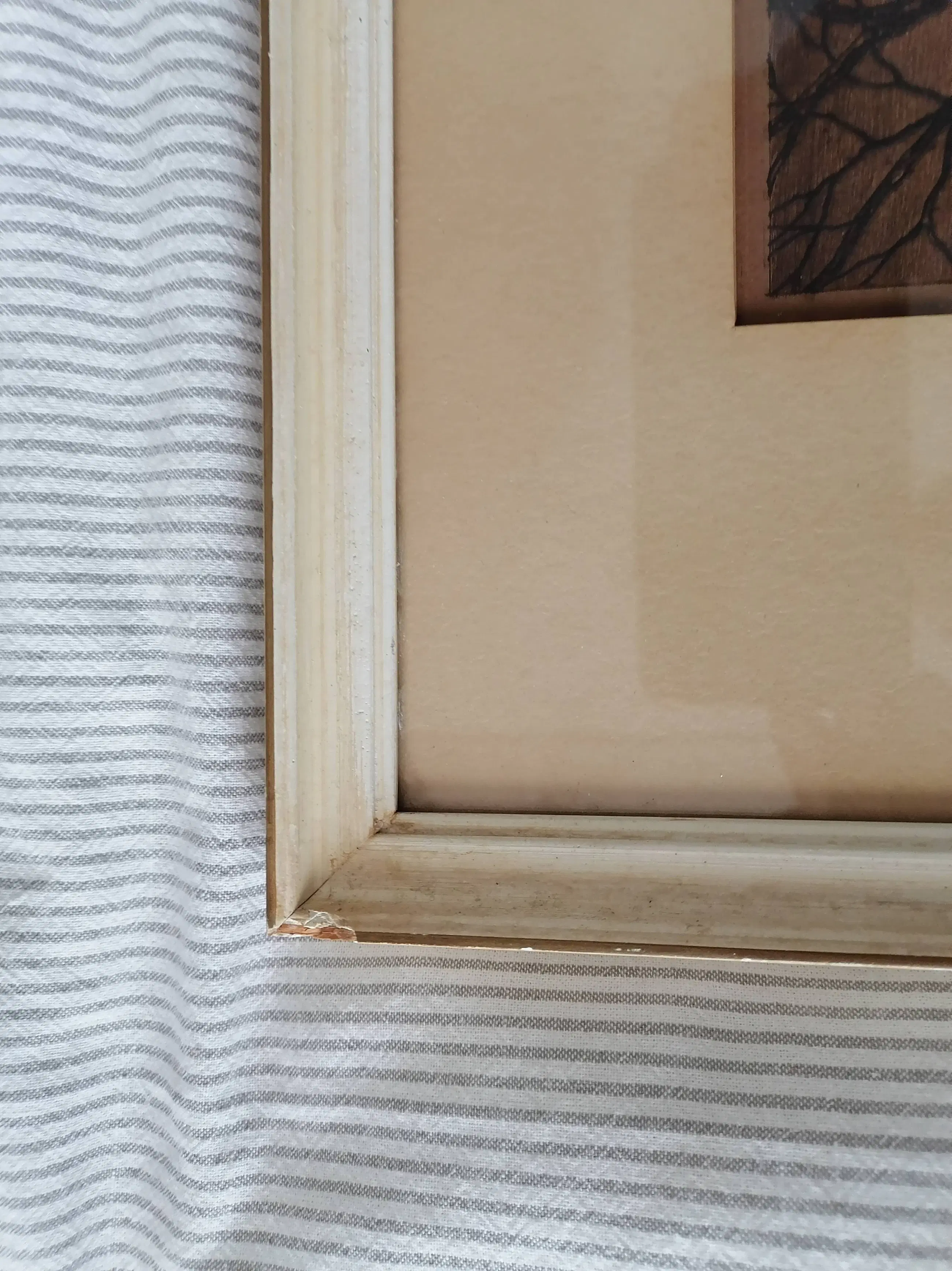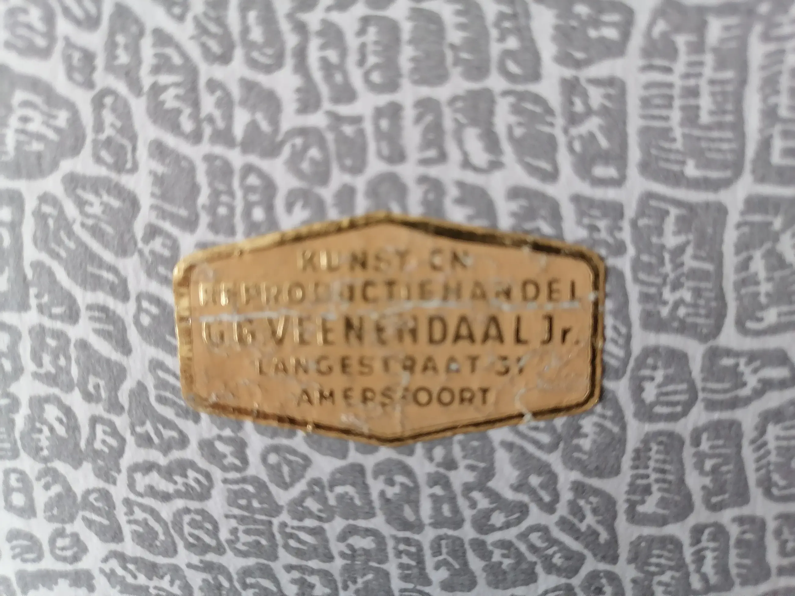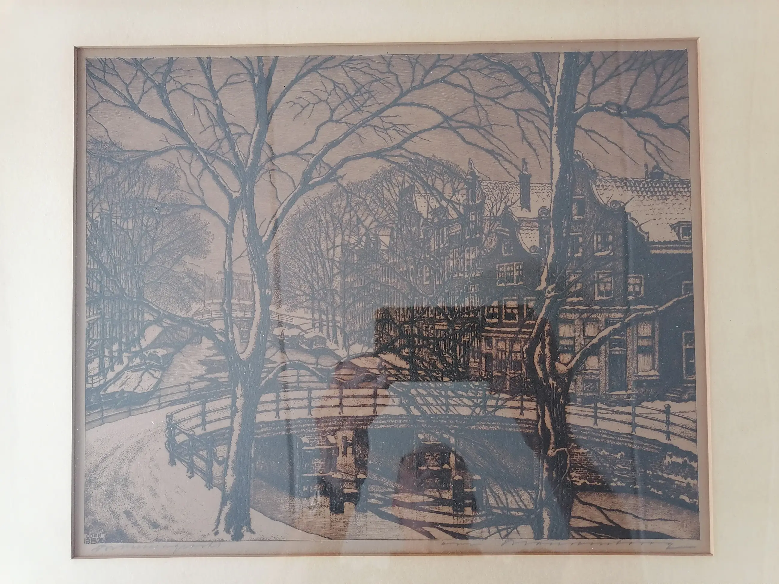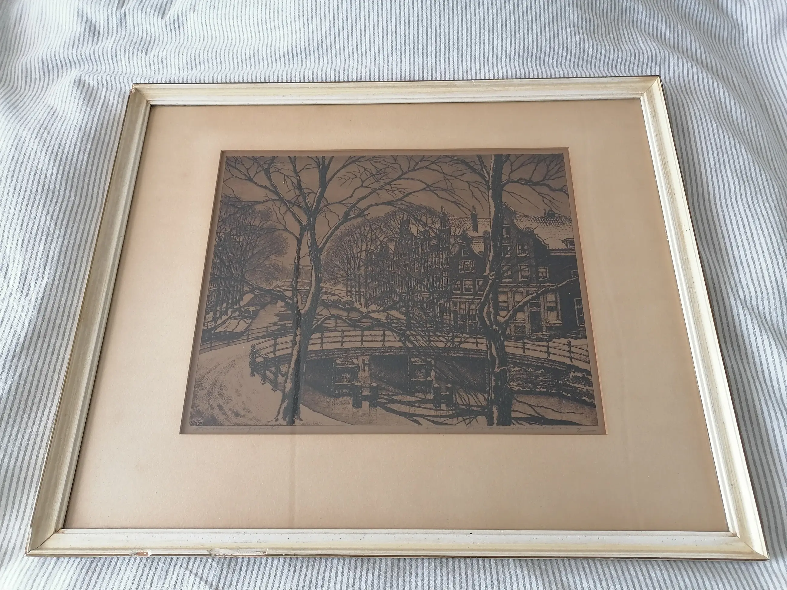 Het werk (ik durf niet 100% te garanderen dat het hier om een ets gaat...) is handgesigneerd en ingelijst. Het is nogal donker van kleur, de lijst heeft lichte beschadigingen.