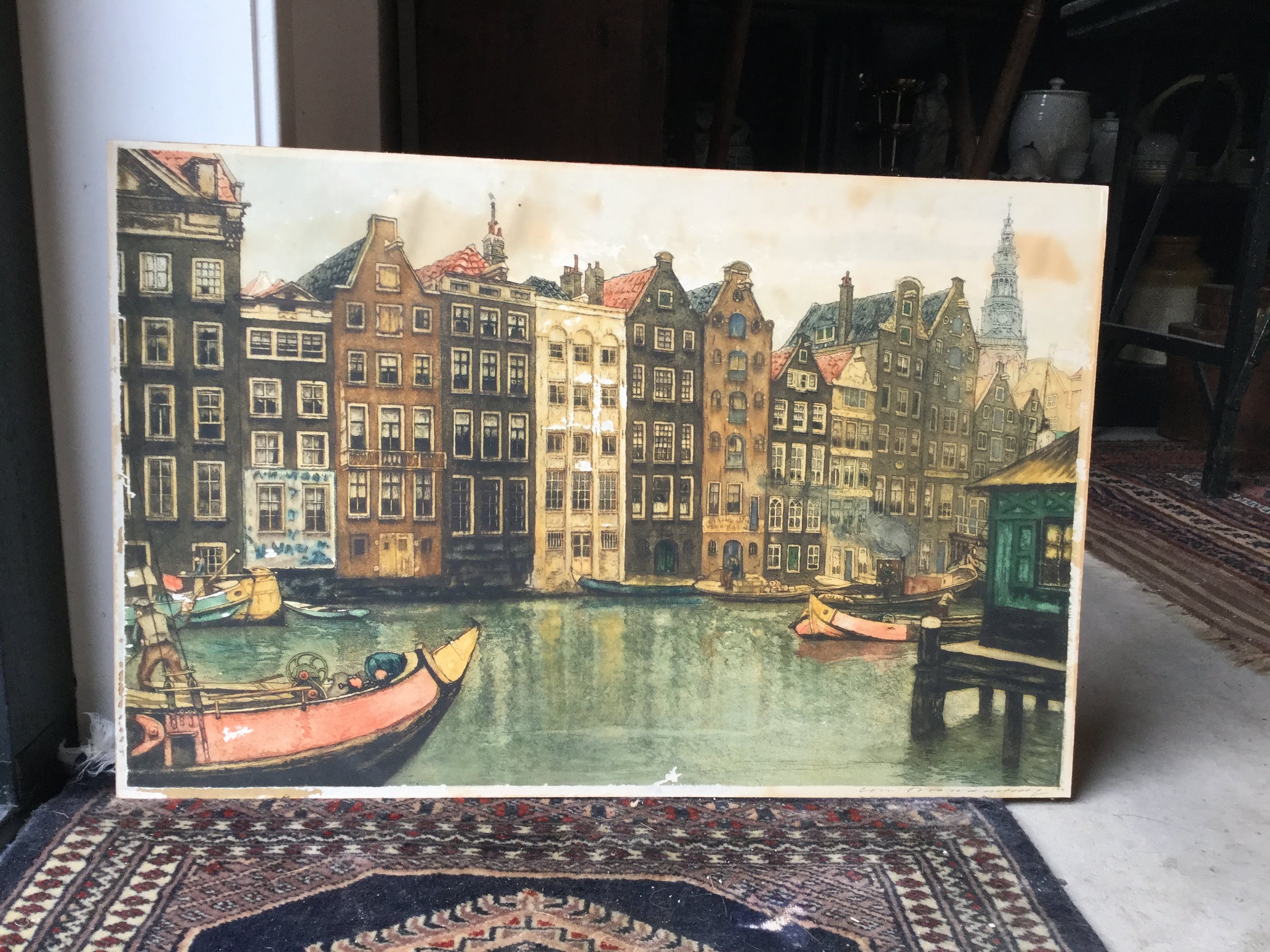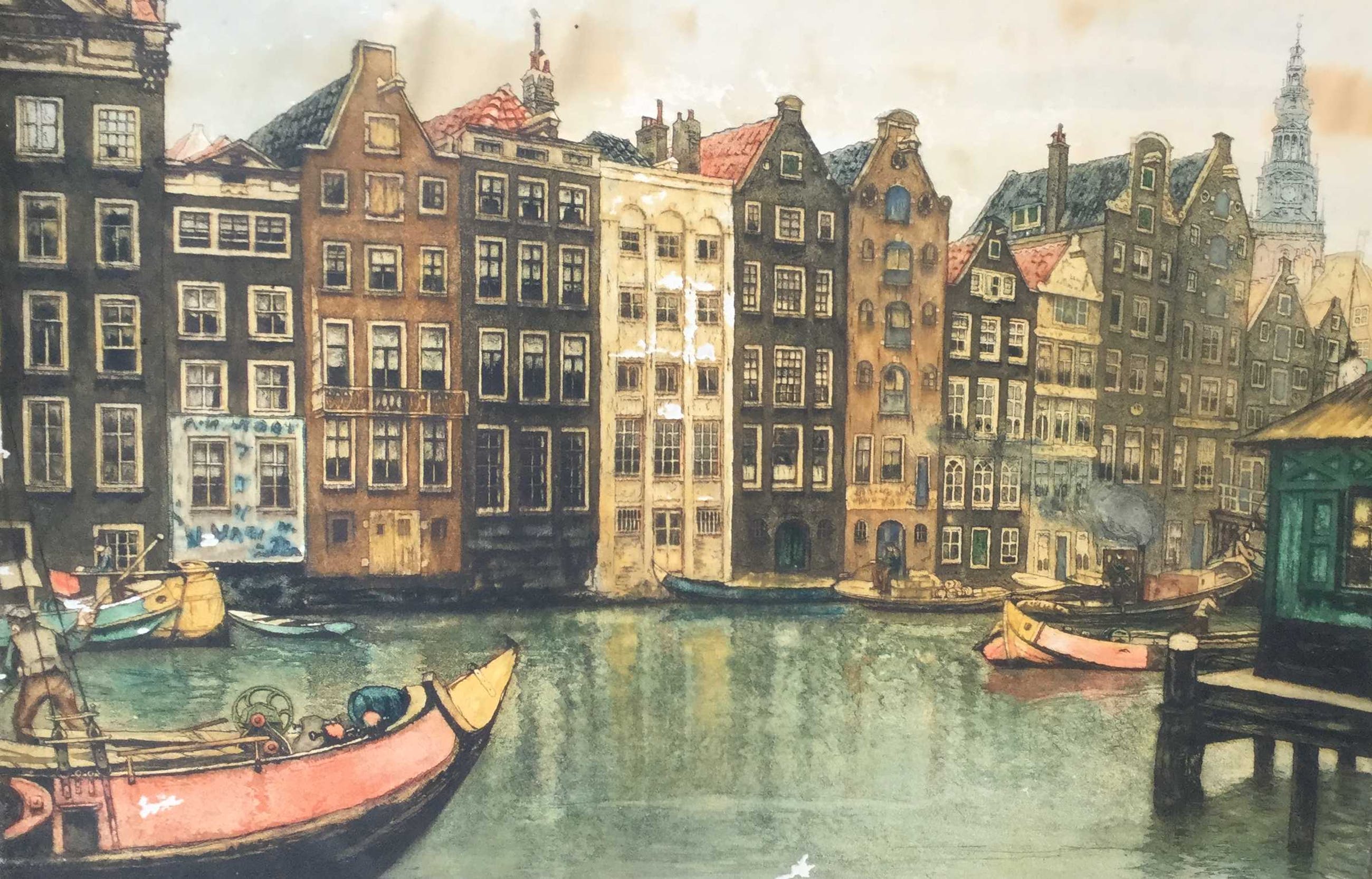 C4871, Cornelis Brandenburg, Boten in stadsgracht, ingekleurde ets, beeldmaat 41 x 62.5 cm, beschadigd.