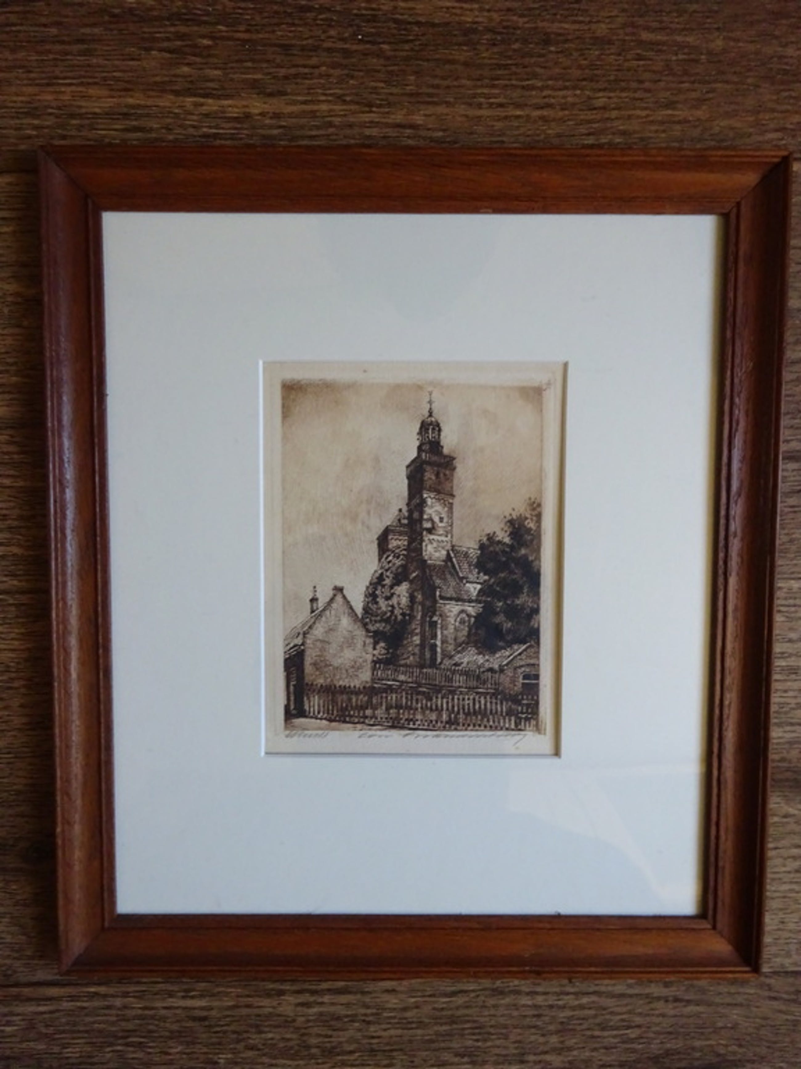 Ets : 17 x 13 cm. met passe-partout en lijst : 38,5 x 34,5 cm.