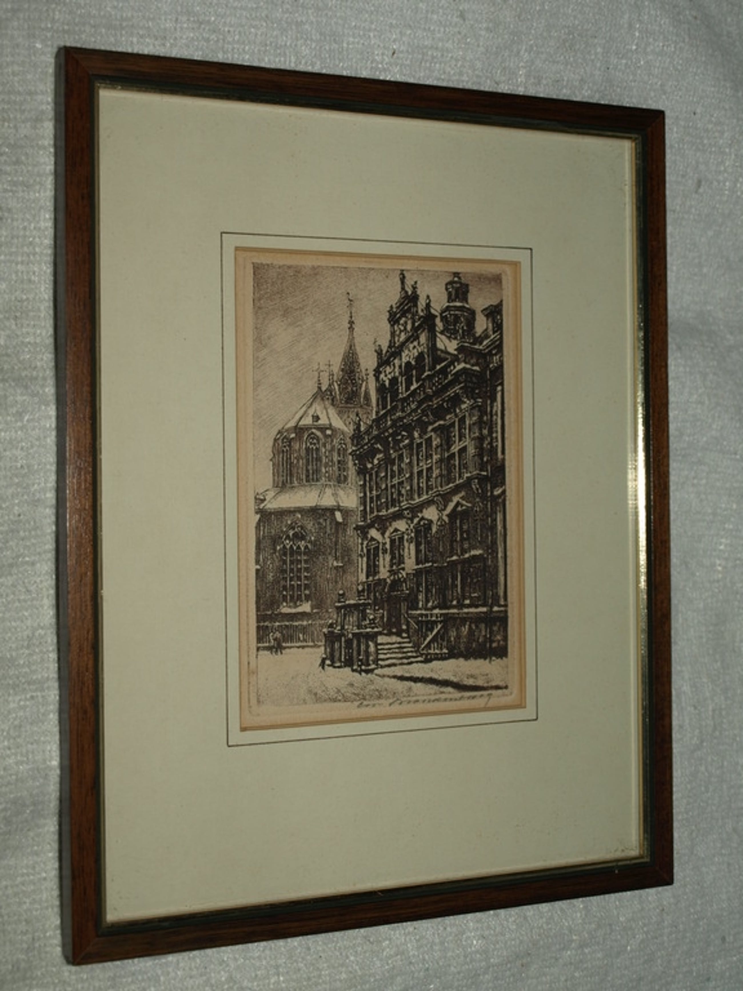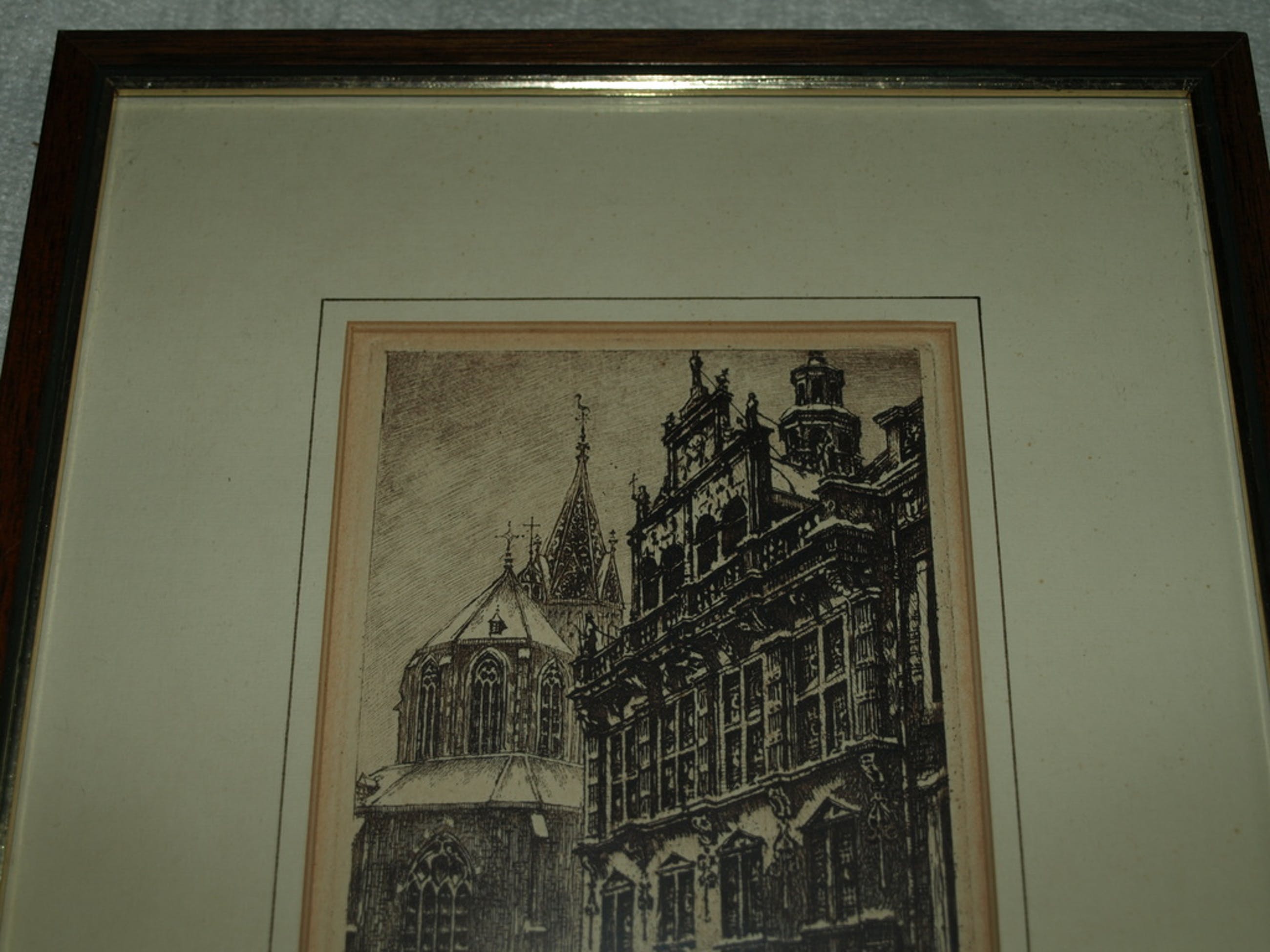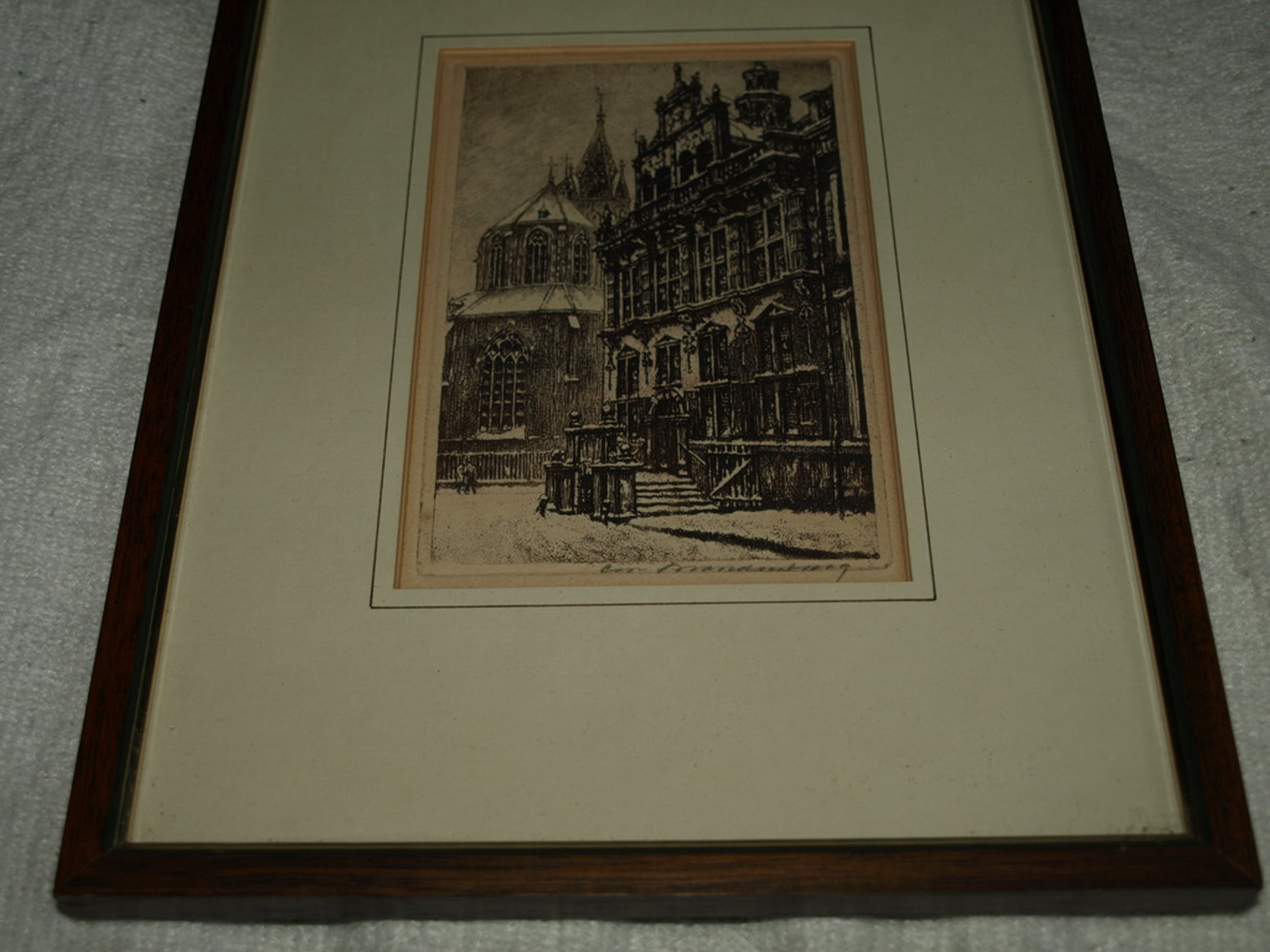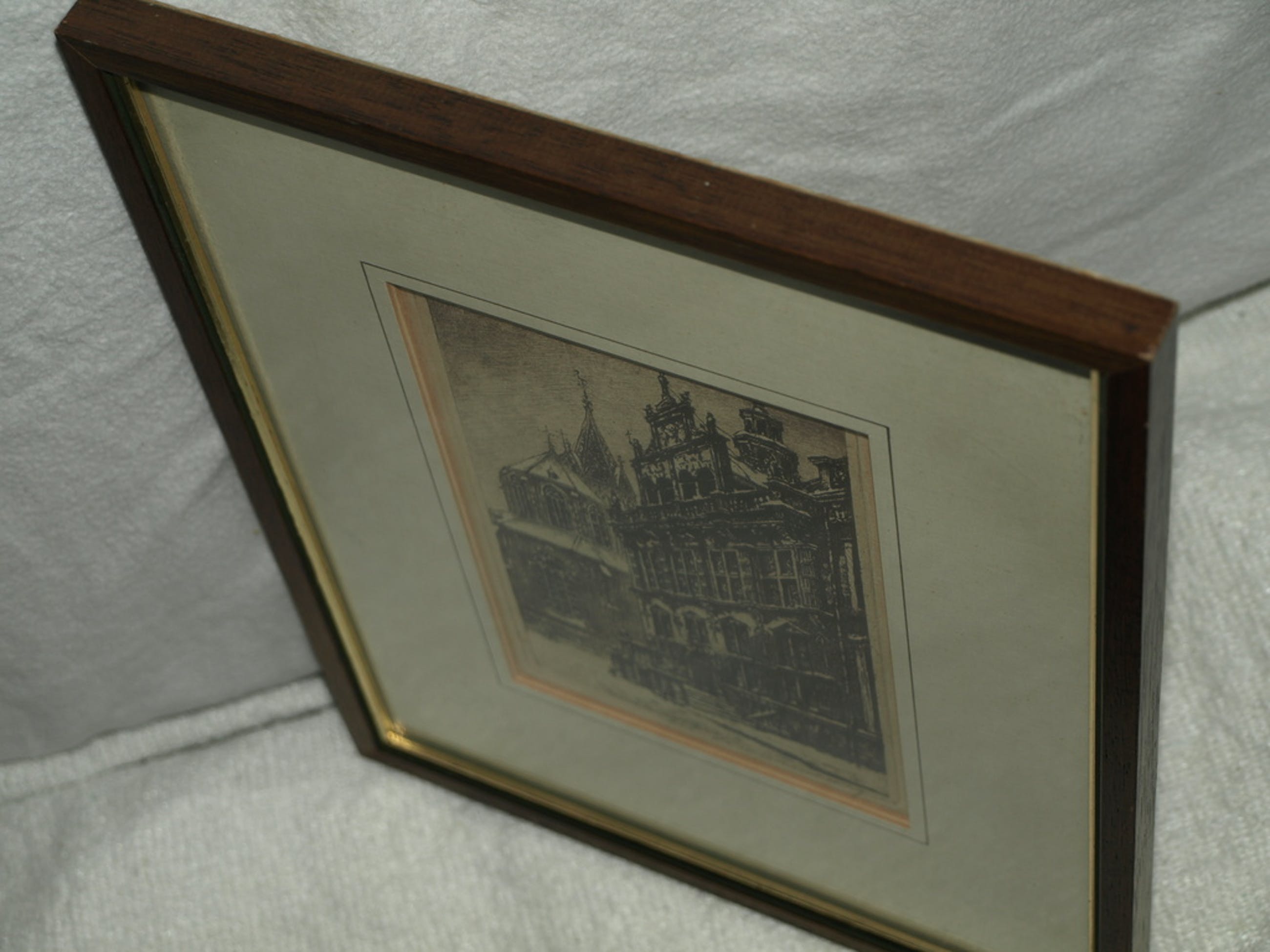 Conditie: Het papier van de ets is ‘vergeeld’. De kartonnen achterplaat heeft vlekjes.