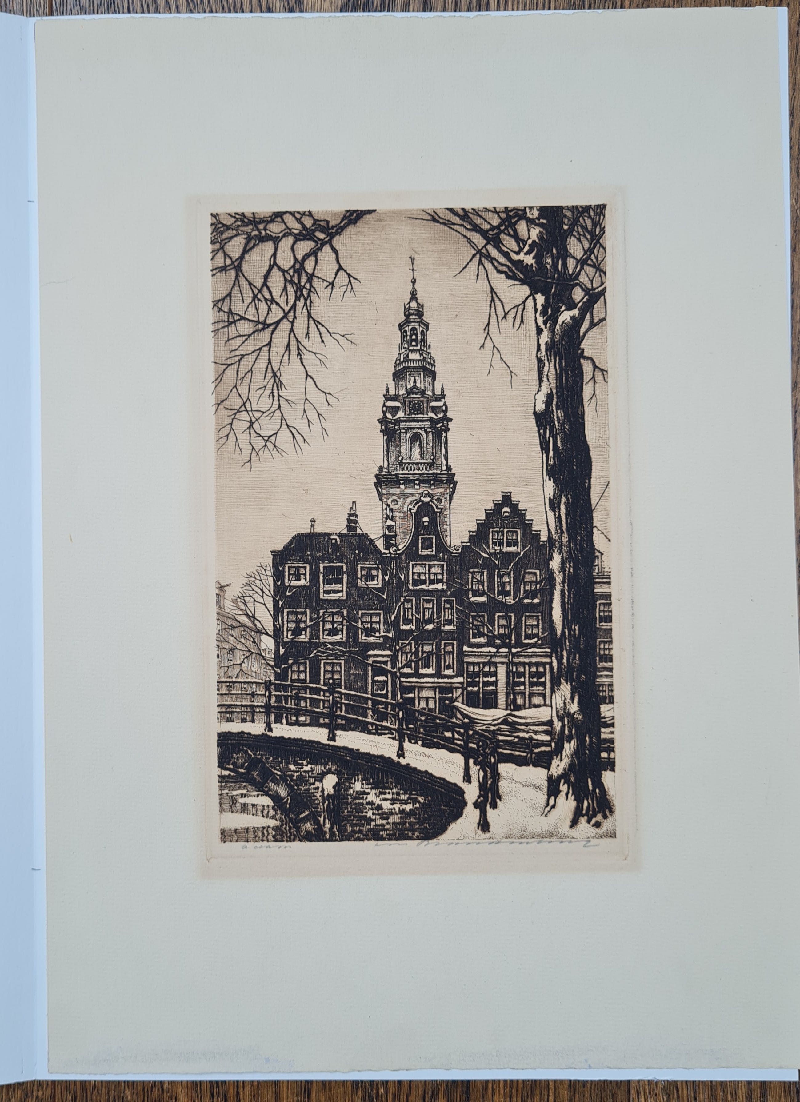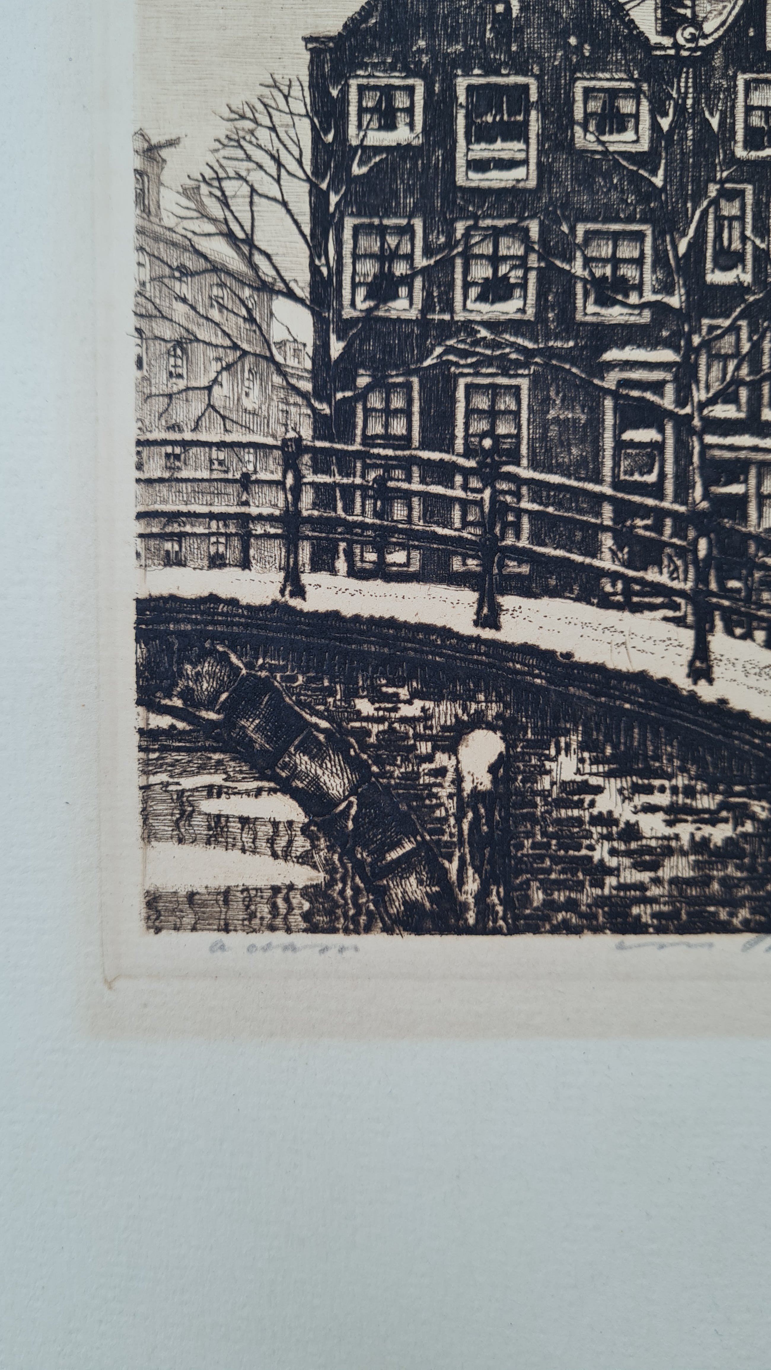 Originele handgesigneerde ets van de Groenburgwal - Amsterdam in de winter.