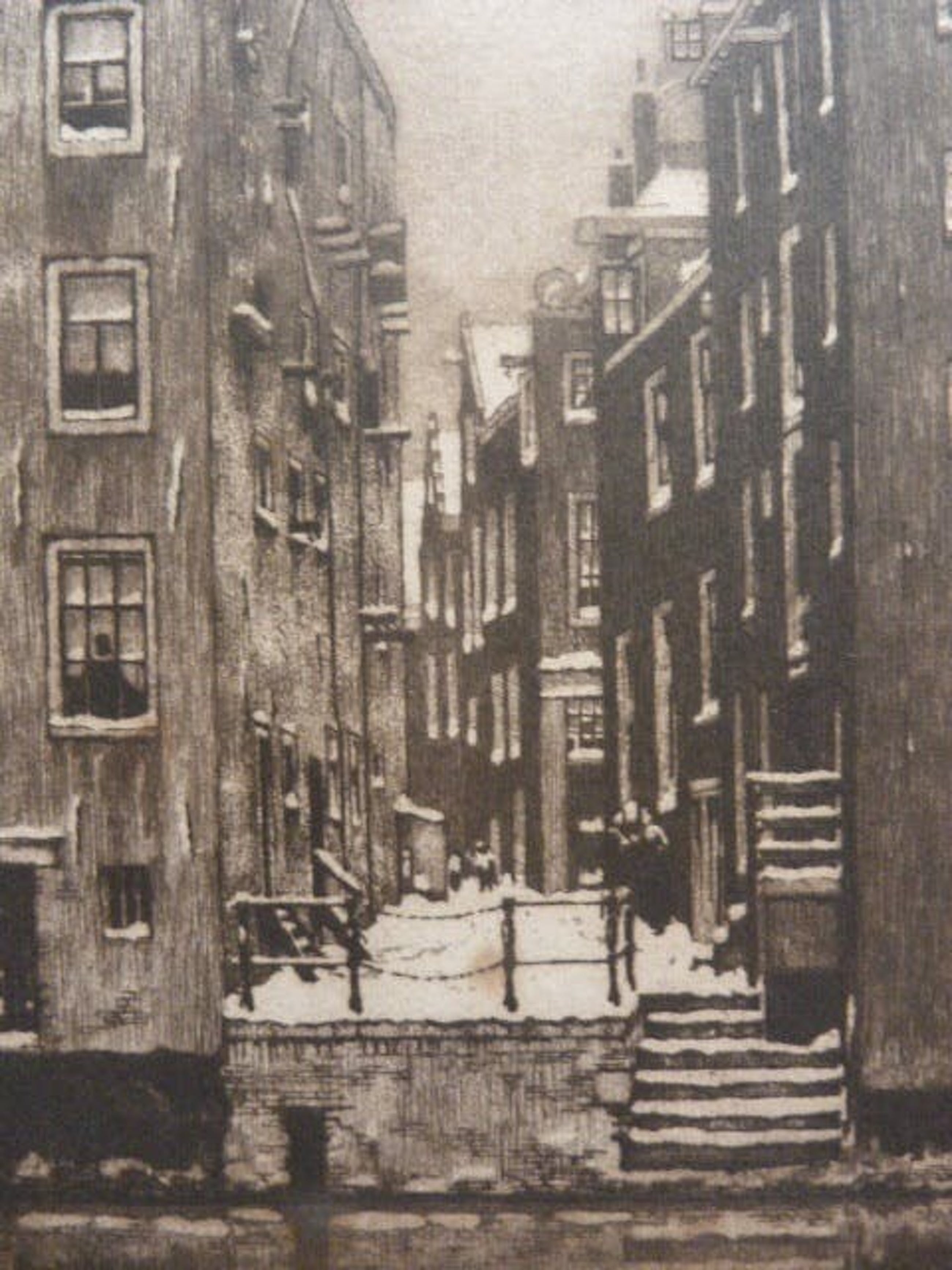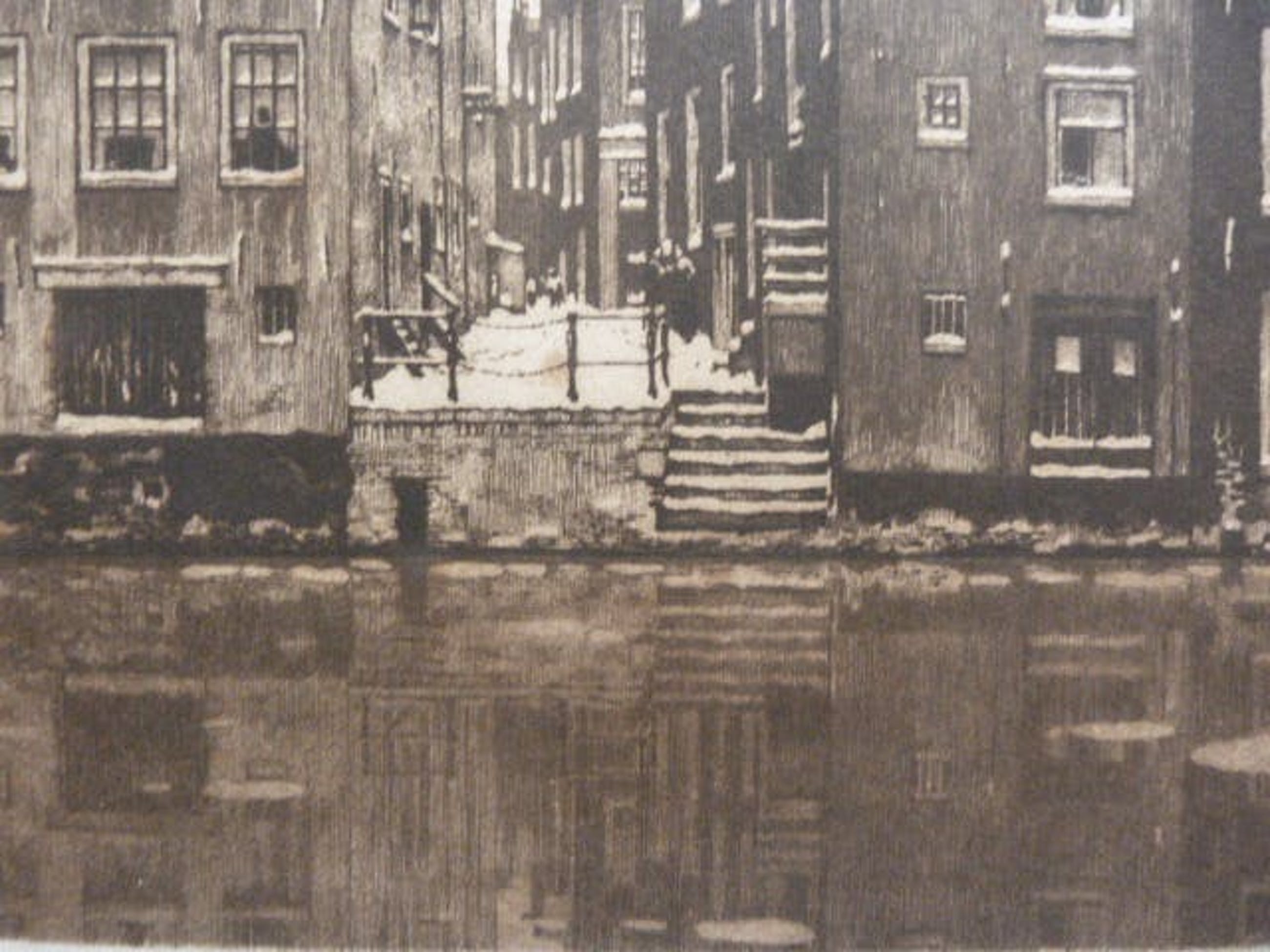 Weer een voorbeeld van twee etsen van hetzelfde punt in de zomer en in de winter. Bij de ets van de O.Z. Kolk is gewezen op de spiegelingin het gladde water. Het water van het druk bevaren Damrak is nooit zo spiegelglad, en dit stelt weer andere eisen aan de vaardigheid van de kunstenaar. Brandenburg toont hier dat hij aan deze eisen kan voldoen.