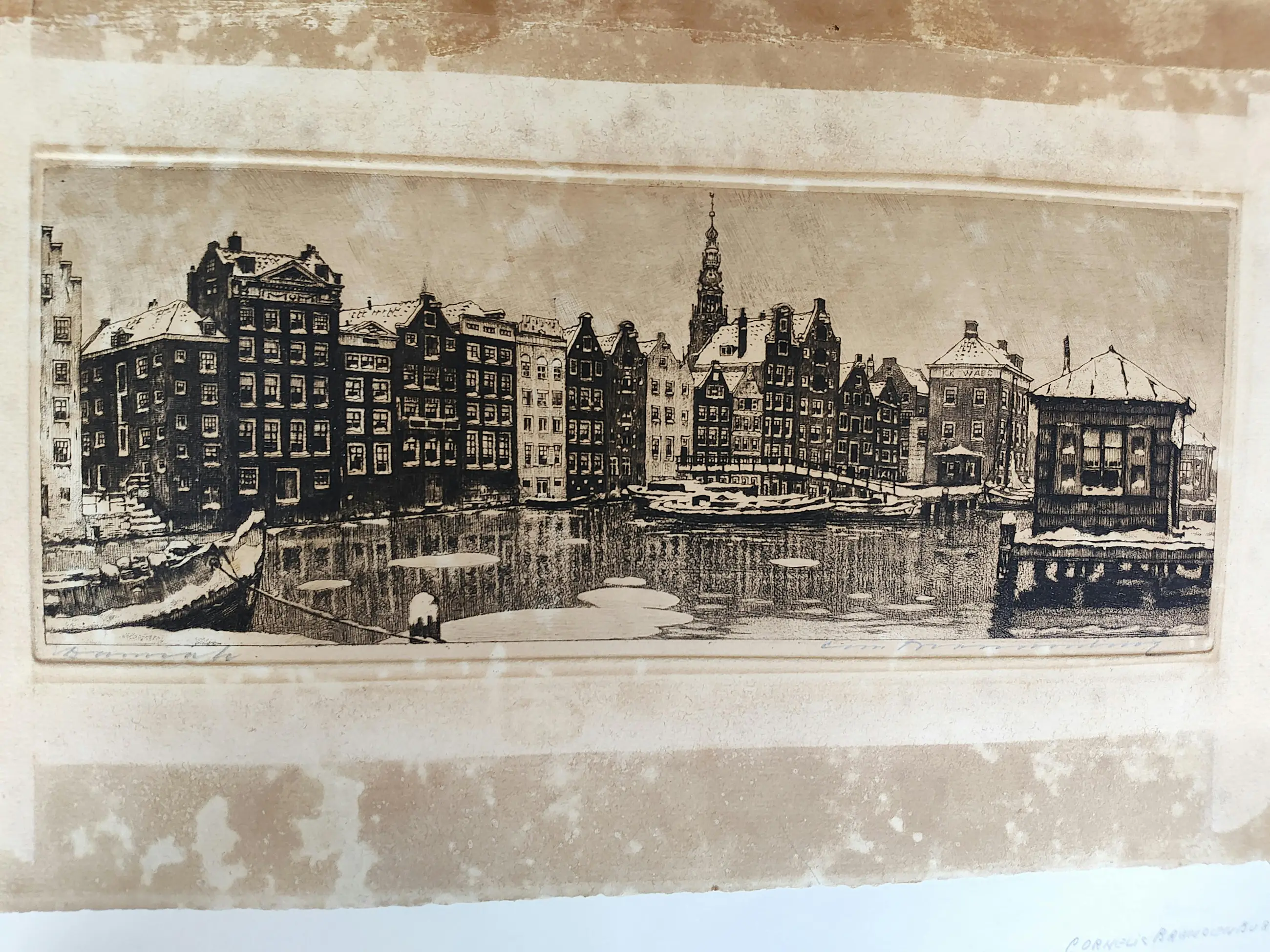Prachtige ets in uitstekende staat van Cornelis Brandenburg, Nederlandse etser, tekenaar, plateelschilder en politiek tekenaar. Cornelis Brandenburg is een van Nederlands grootste etsers van stadsgezichten en dan vooral van Amsterdam.