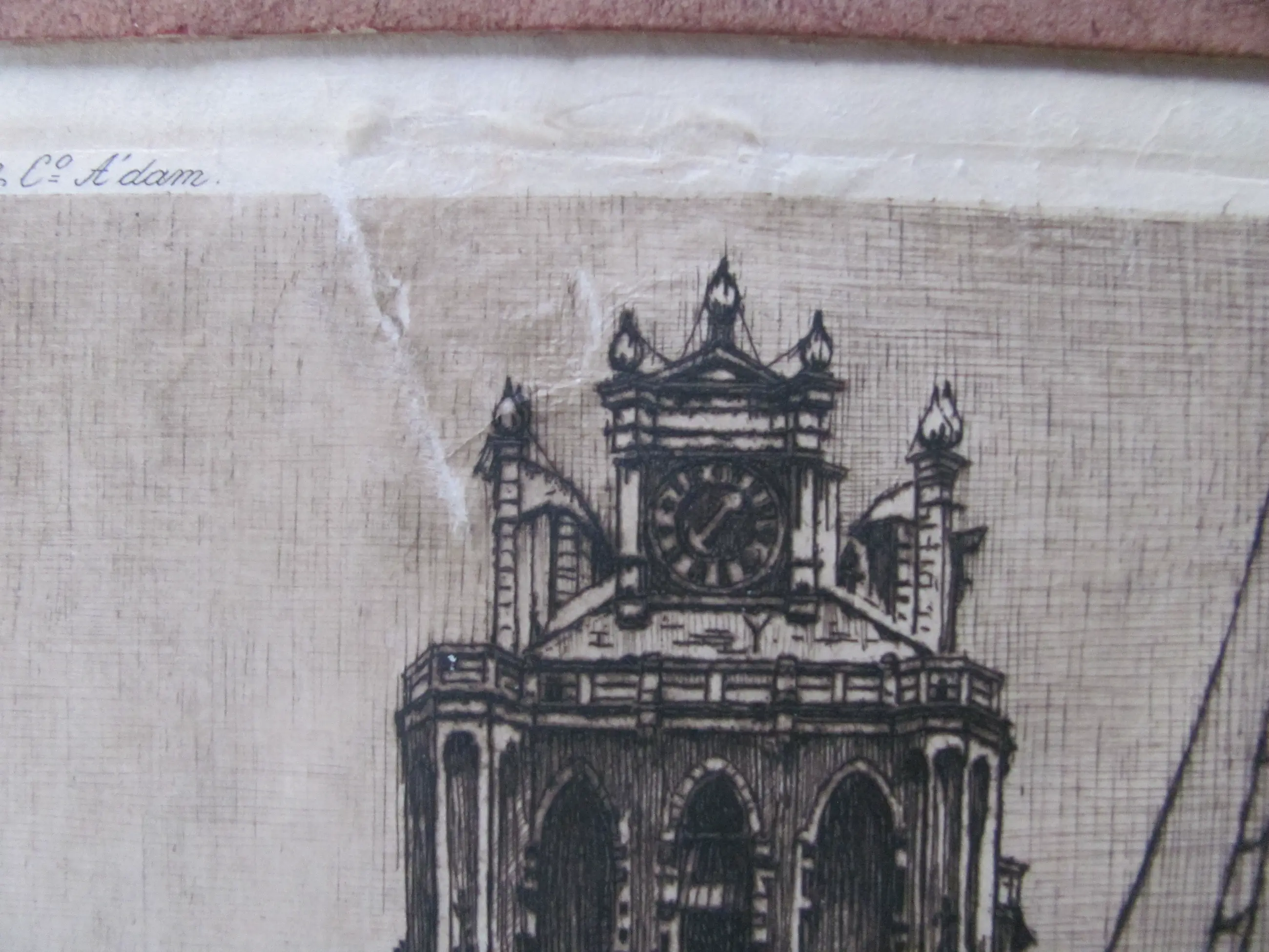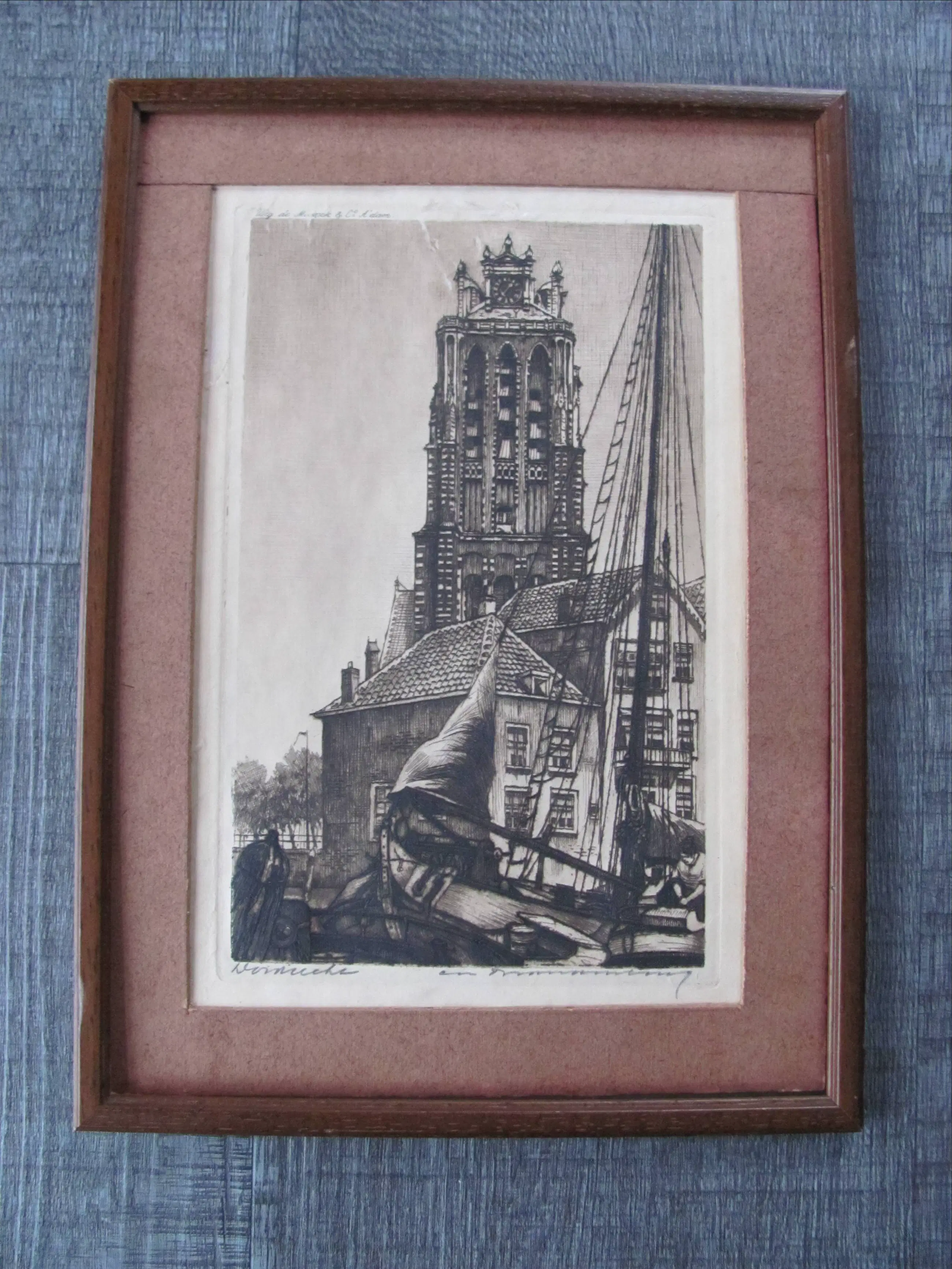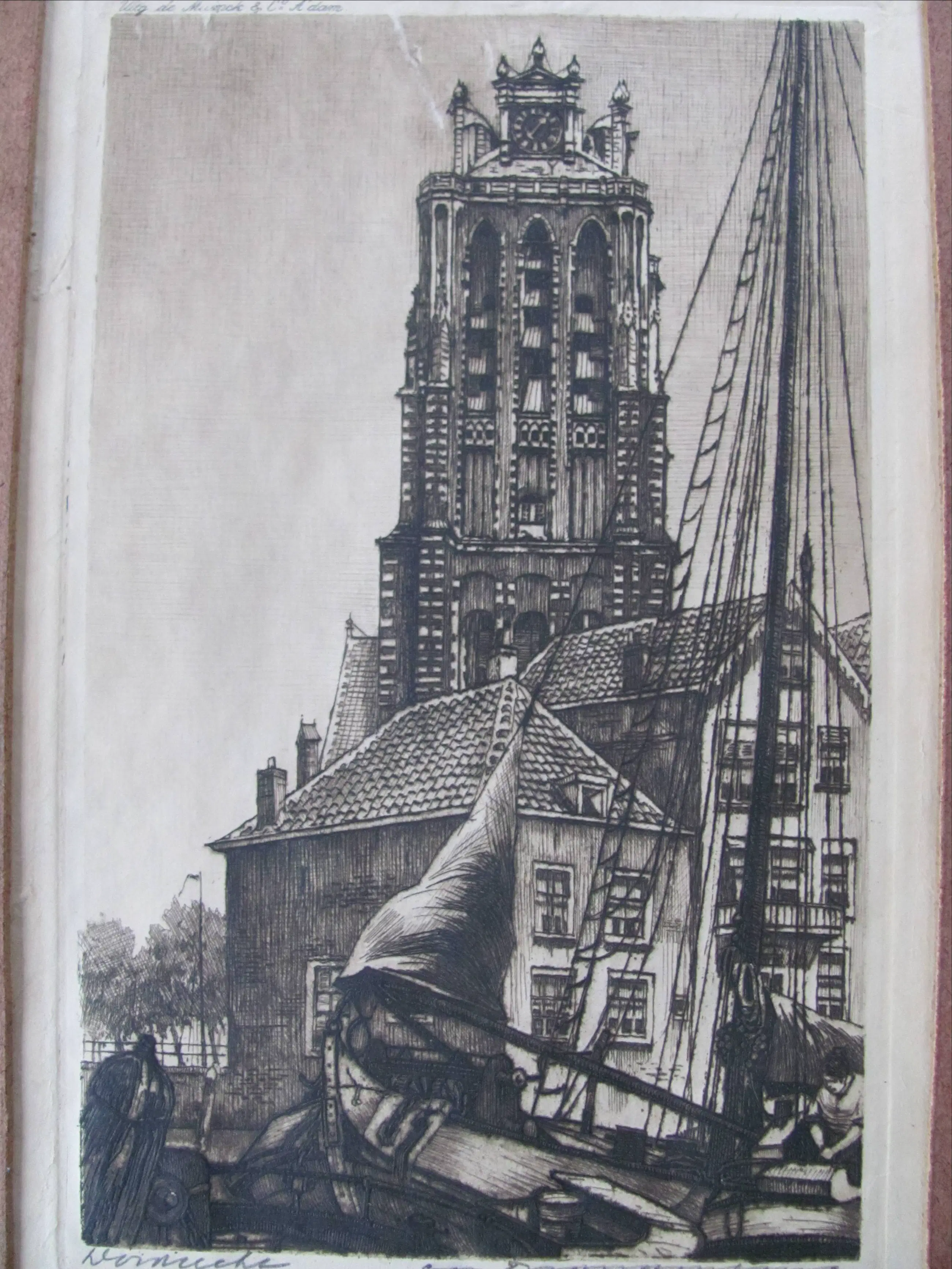 Ets van Corn. Brandenburg van Dordrecht. Een boot in de haven met de kerktoren op de achtergrond. Linksonder met potlood: "Dordrecht" Rechtsonder met potlood: "Corn. Brandenburg"