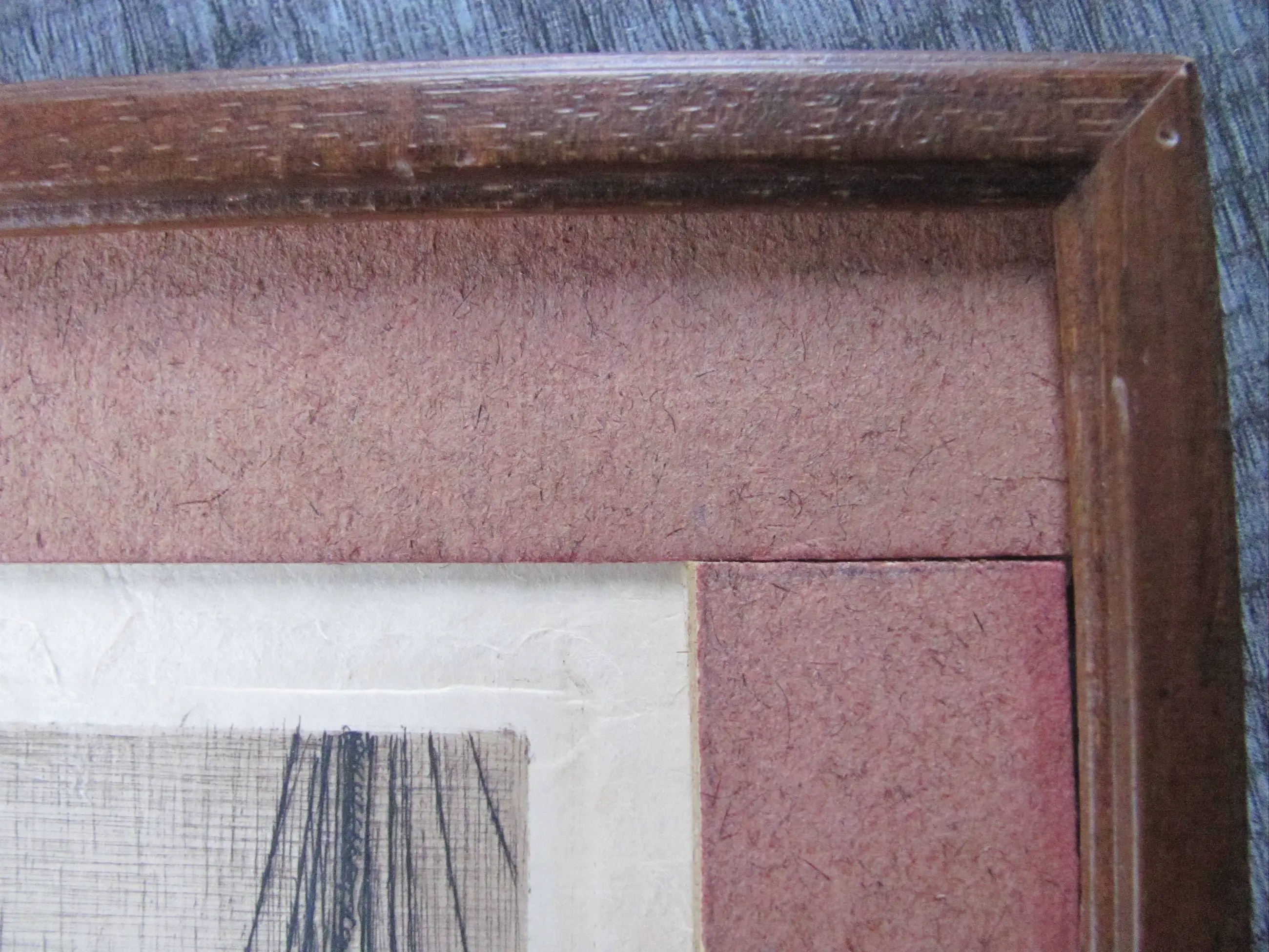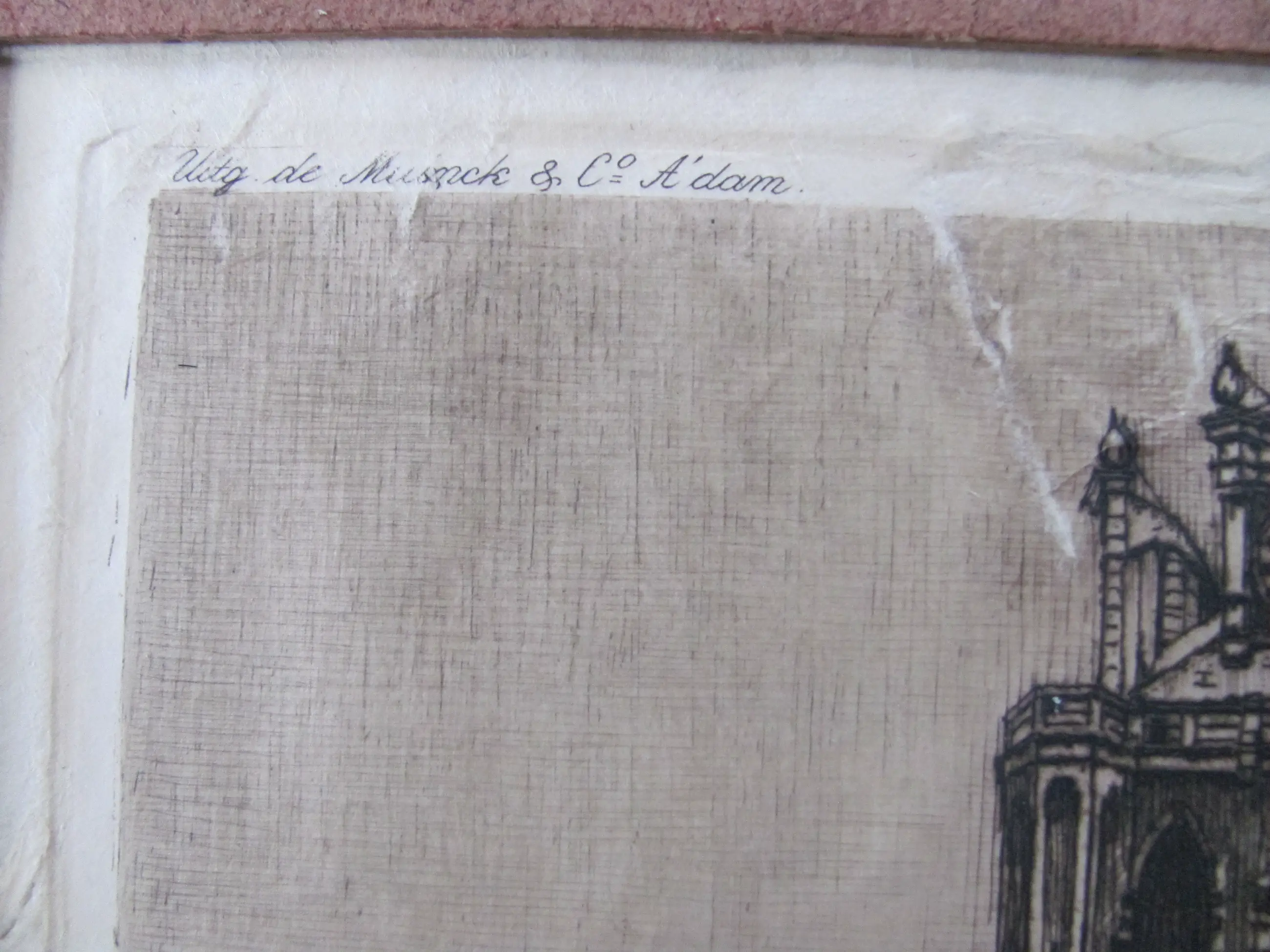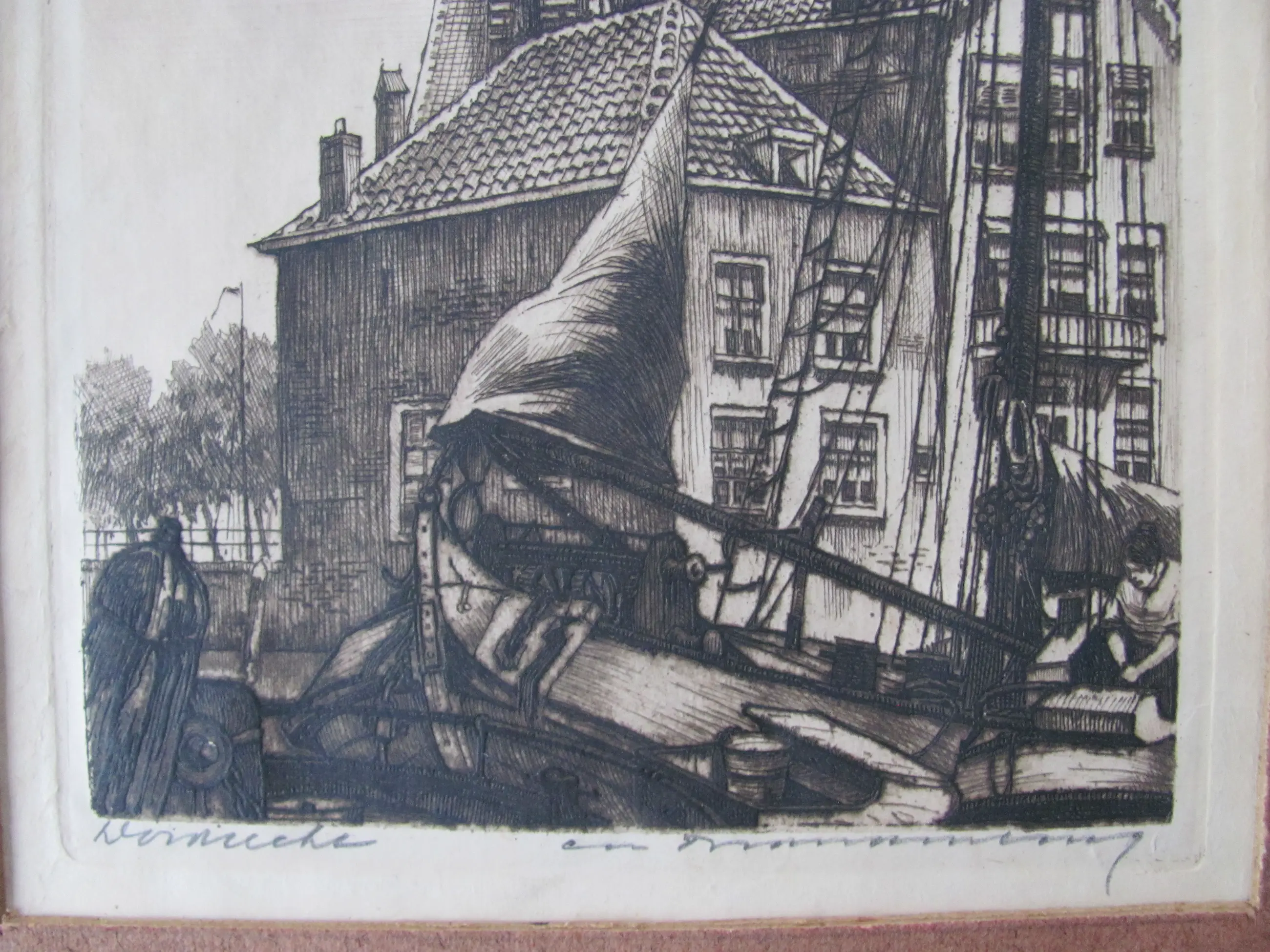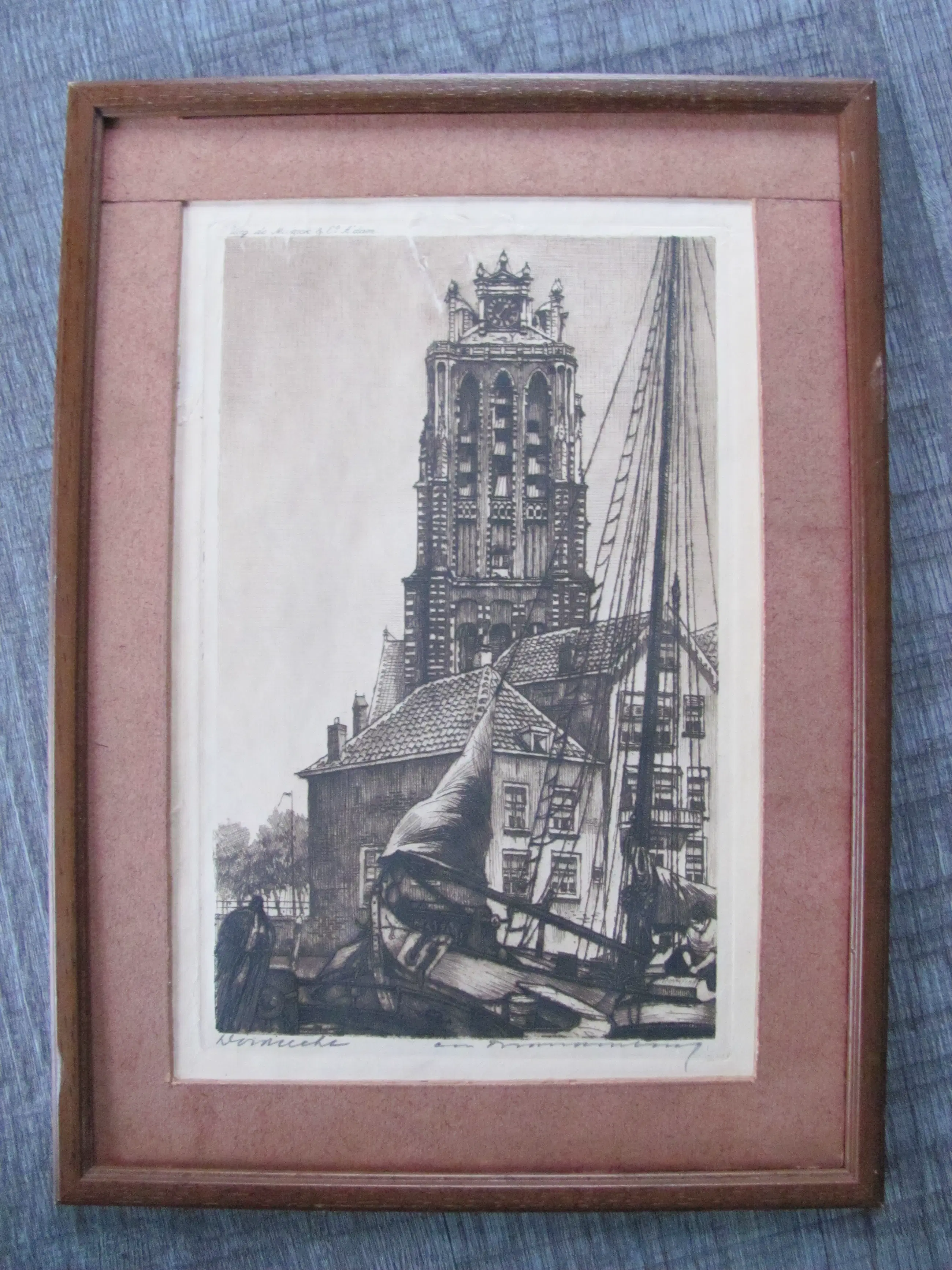Ets van Corn. Brandenburg van Dordrecht. Een boot in de haven met de kerktoren op de achtergrond. Linksonder met potlood: "Dordrecht" Rechtsonder met potlood: "Corn. Brandenburg"