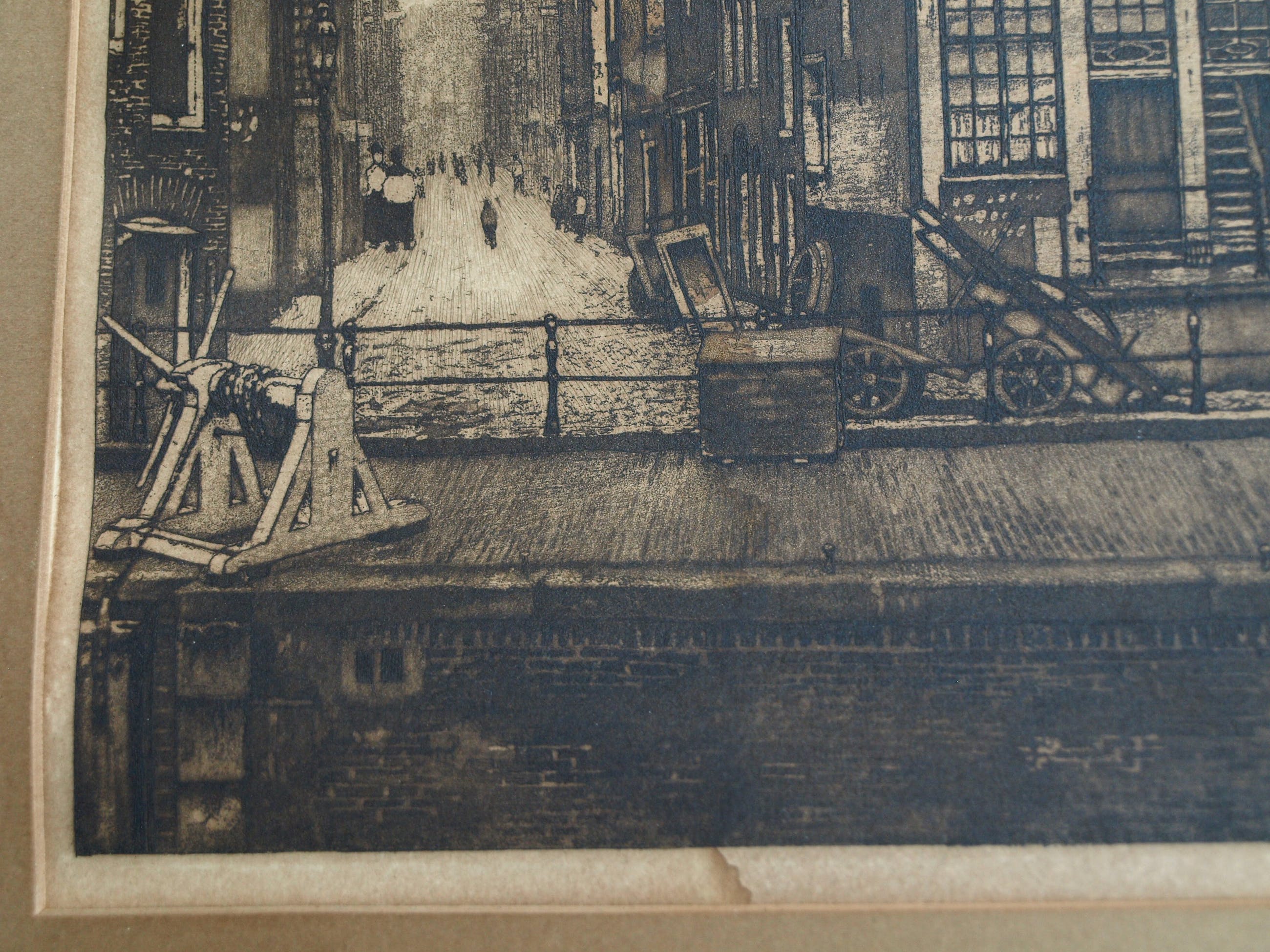 Een ets van de Nederlandse kunstenaar Cornelis Brandenburg (1883-1954) met een voorstelling van een gracht in Amsterdam.