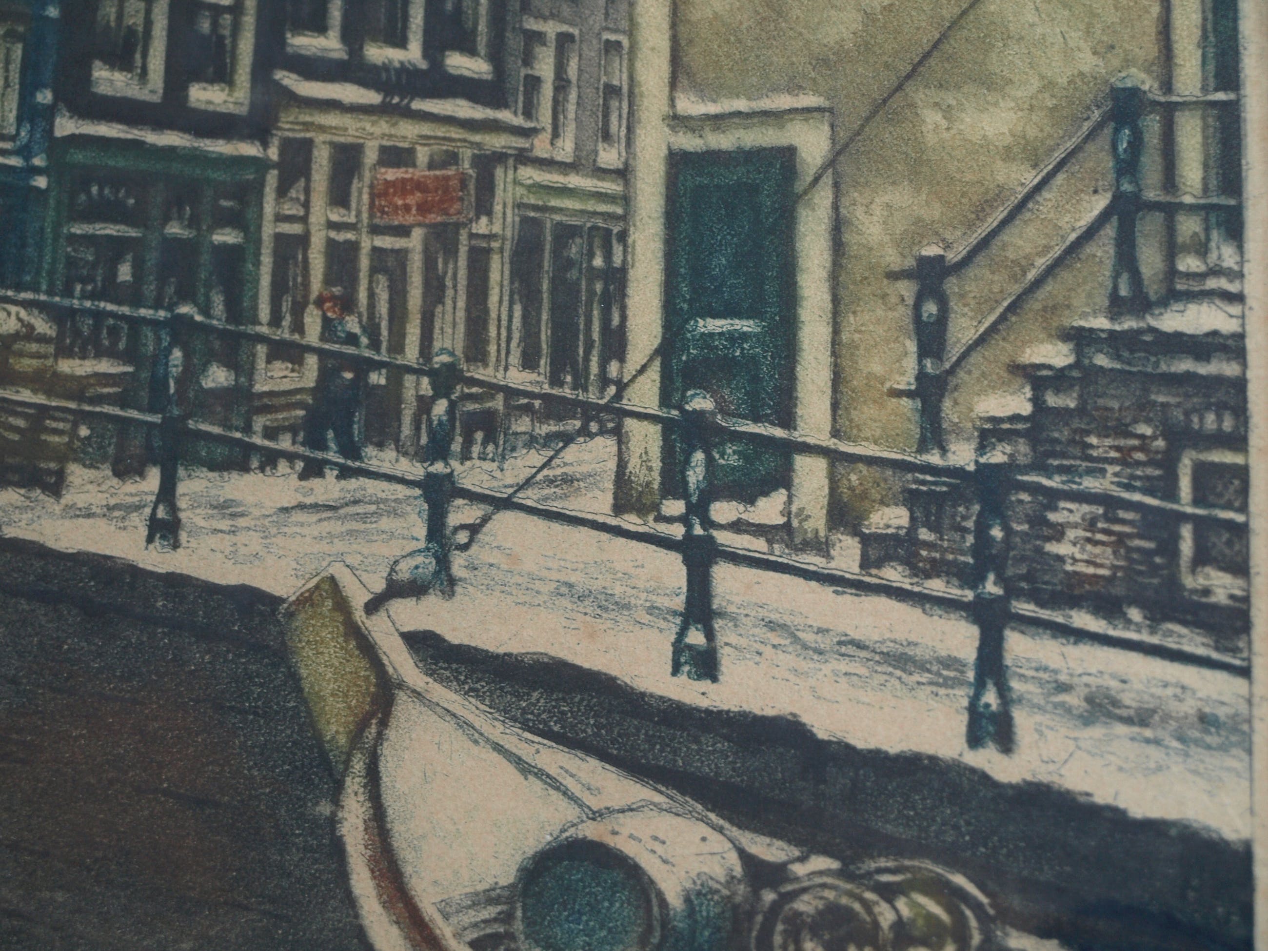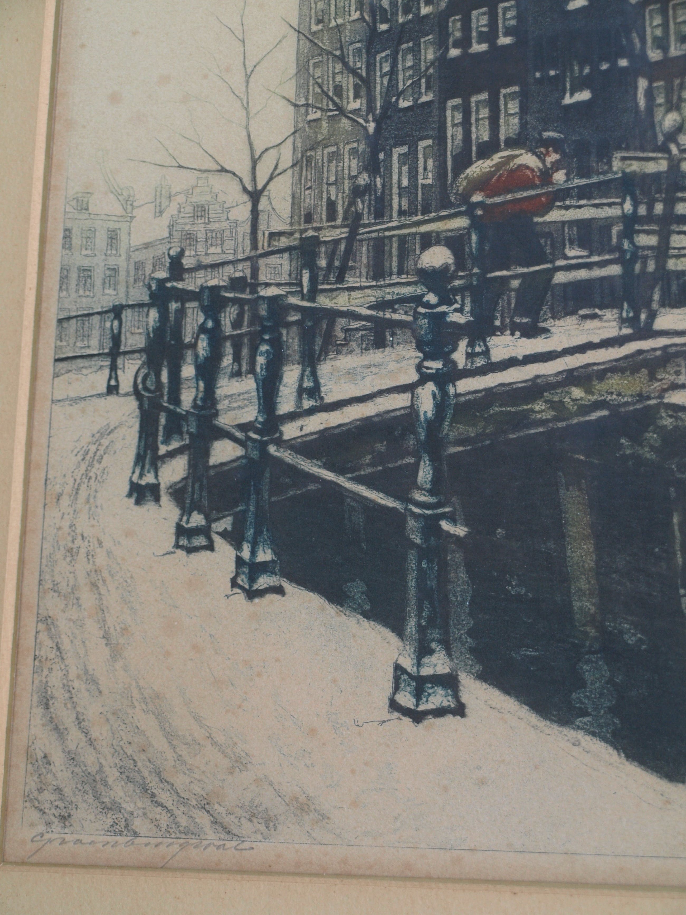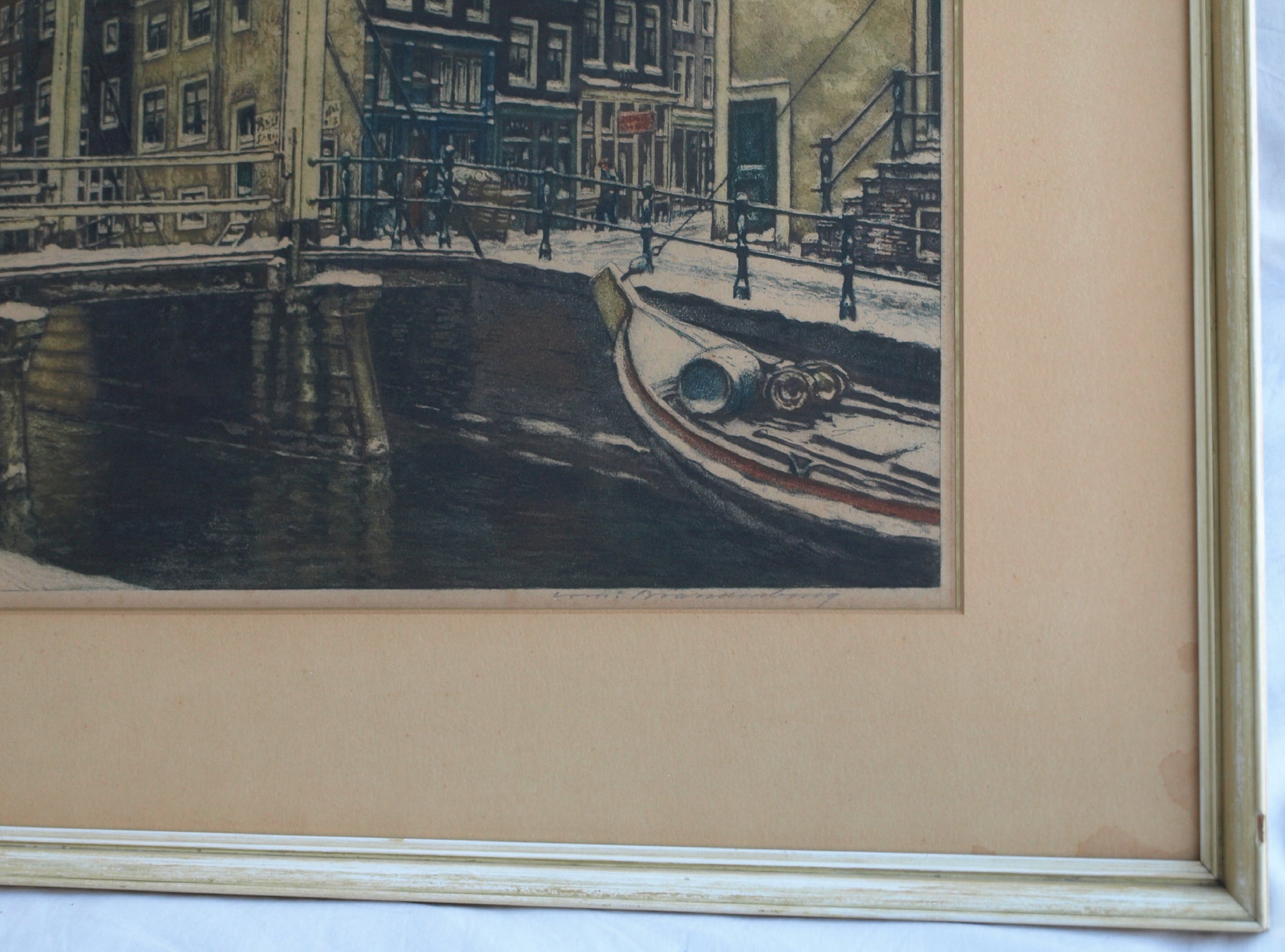 Een grote ingelijste ‘sneeuw-ets’ uit ca. 1925 van de Nederlandse kunstenaar Cornelis Brandenburg (1883-1954) met een voorstelling van de Amsterdamse Groenburgwal in de winter.