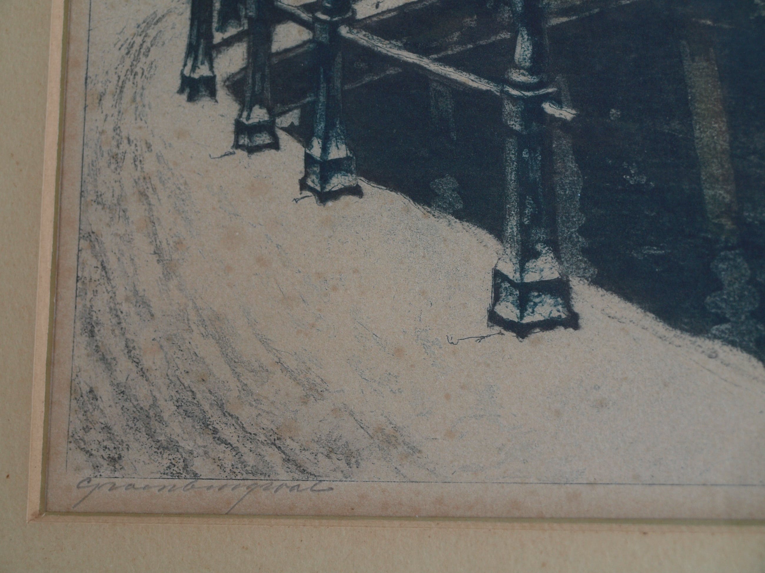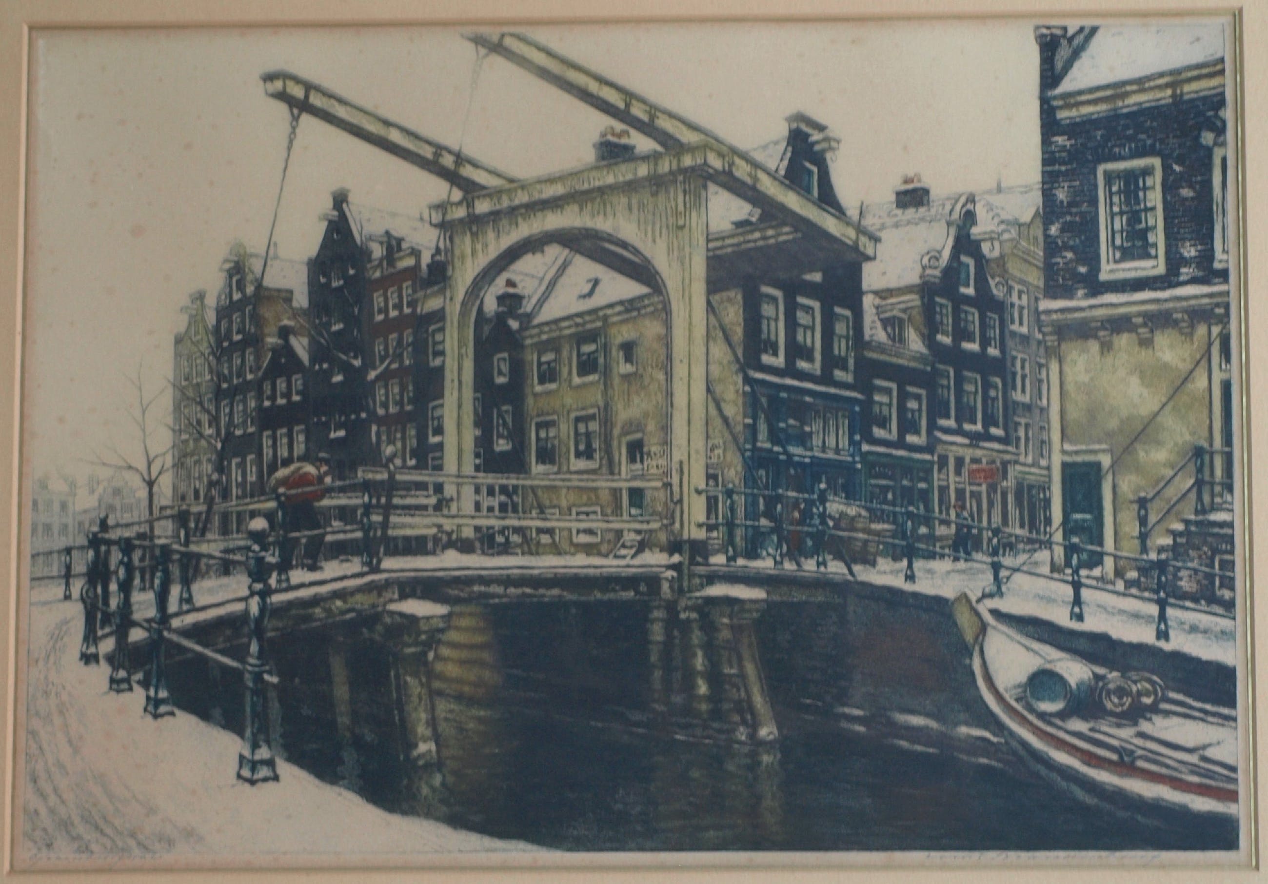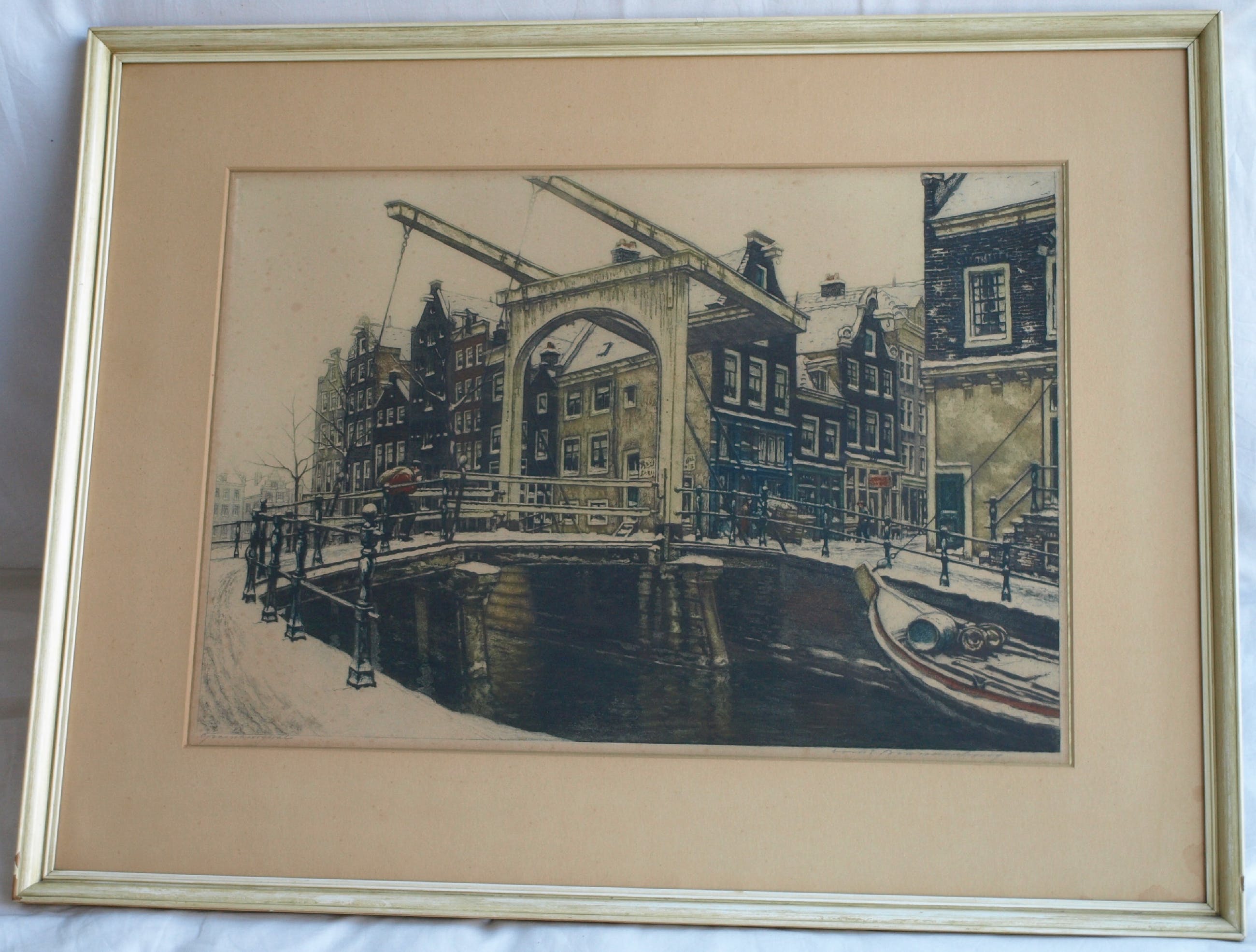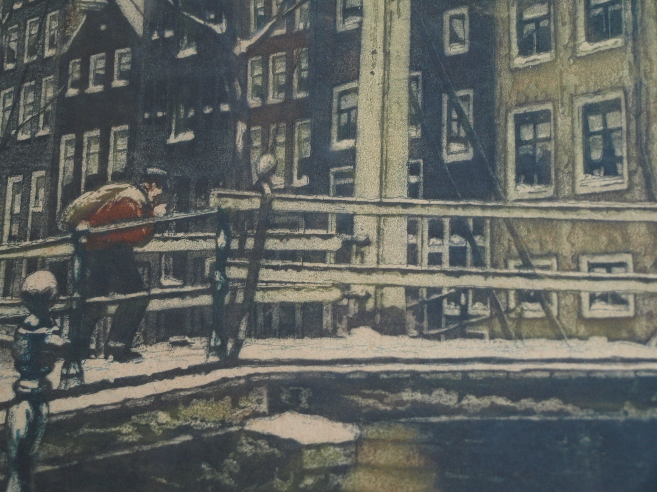 Een grote ingelijste ‘sneeuw-ets’ uit ca. 1925 van de Nederlandse kunstenaar Cornelis Brandenburg (1883-1954) met een voorstelling van de Amsterdamse Groenburgwal in de winter.