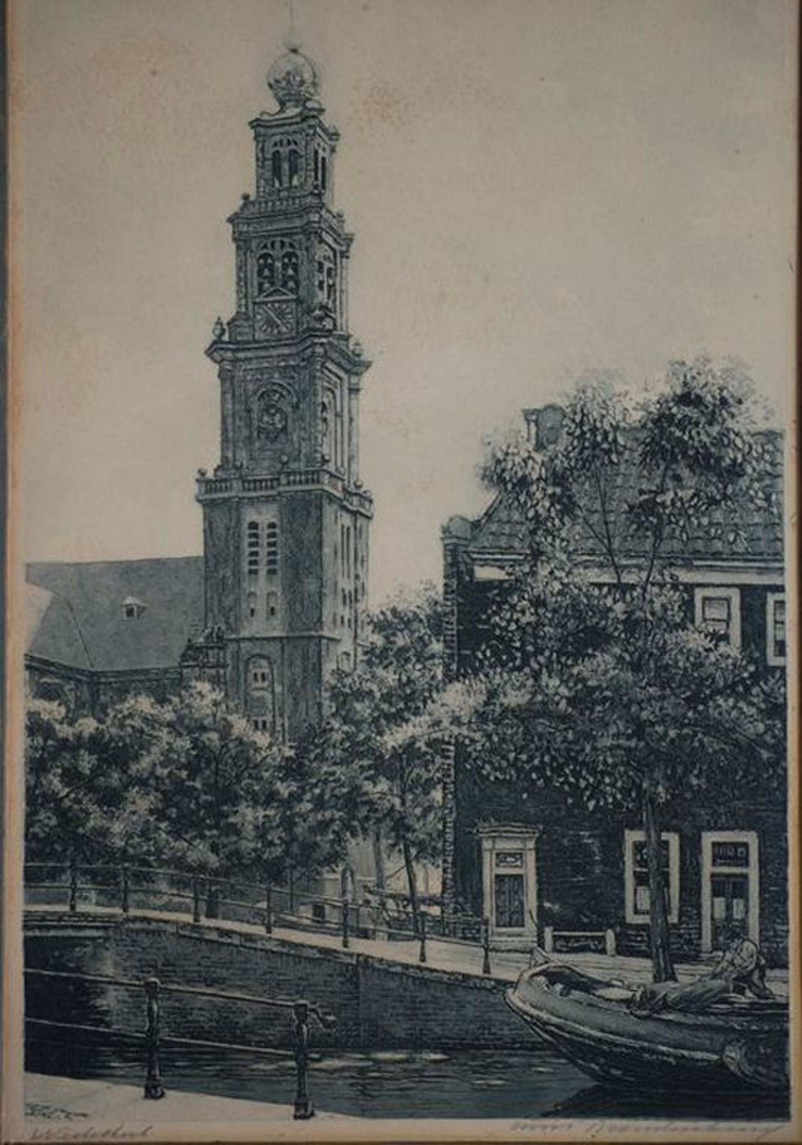 Cornelis Brandenburg is geboren in het jaar 1884 te Wormerveer. In het jaar 1902 verhuisde hij naar Amsterdam en studeerde aan de tekenschool voor kunstambachten. Als plateelschilder werkte hij bij de distel in Amsterdam. Hierna concentreerde hij zich volledig op het etsen en is de belangrijkste etser van de Amsterdamse grachten. Meer dan 100 etsen van Amsterdam en hiervan heeft het archief van Amsterdam meer dan 60 etsen. In het jaar 1954 overleed hij in Amsterdam. Van zijn werk is een boek verschenen met al zijn etsen. De Westerkerk gezien vanaf de overkant van de bloemgracht.
