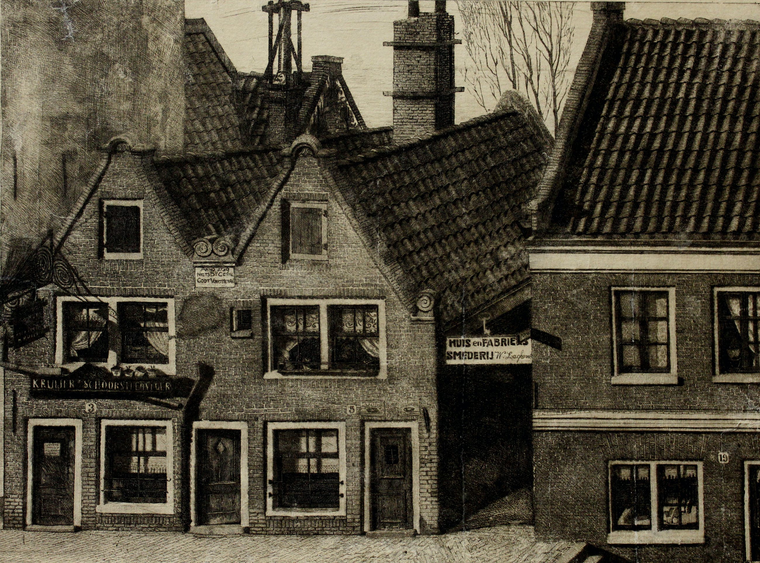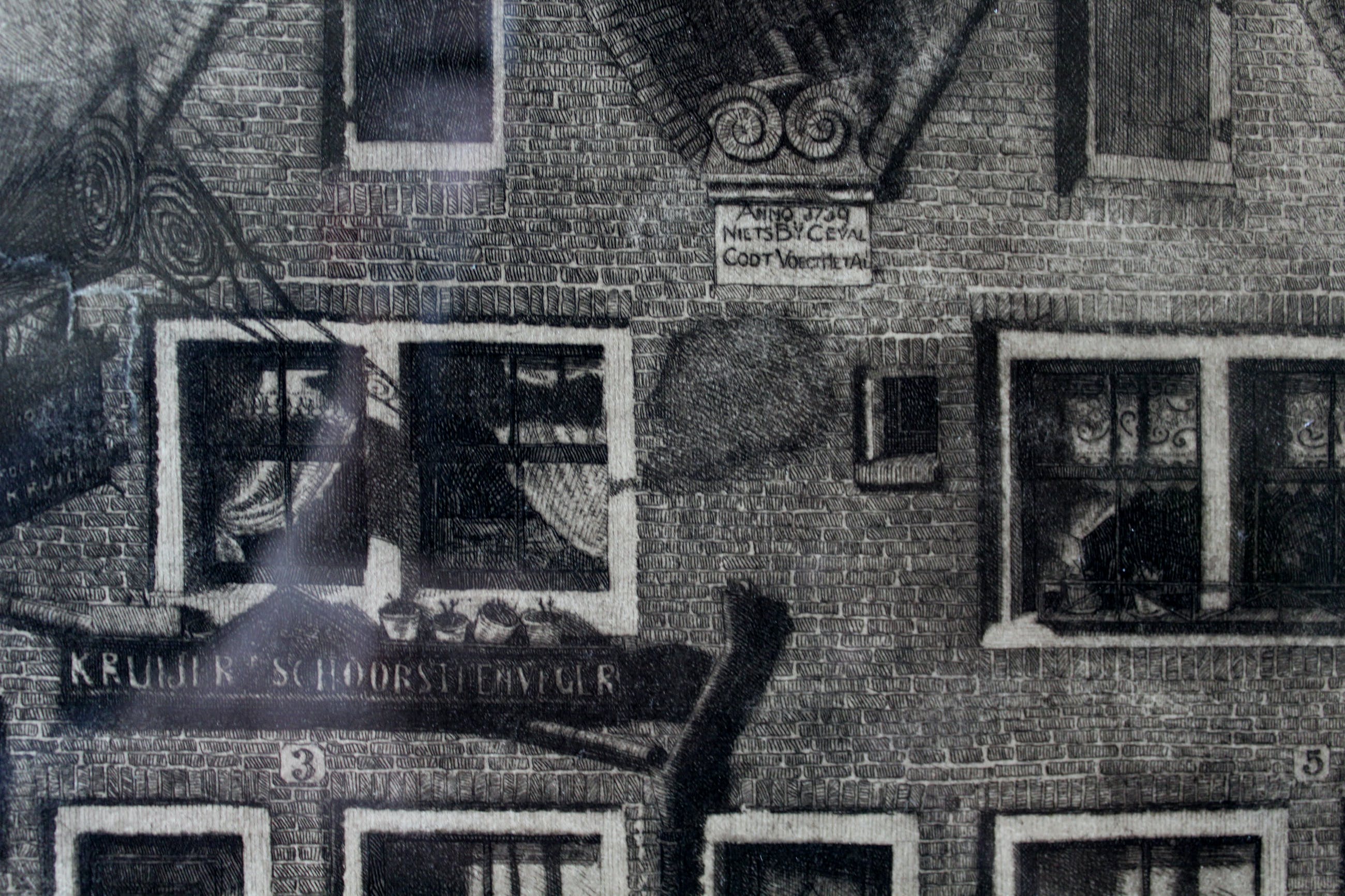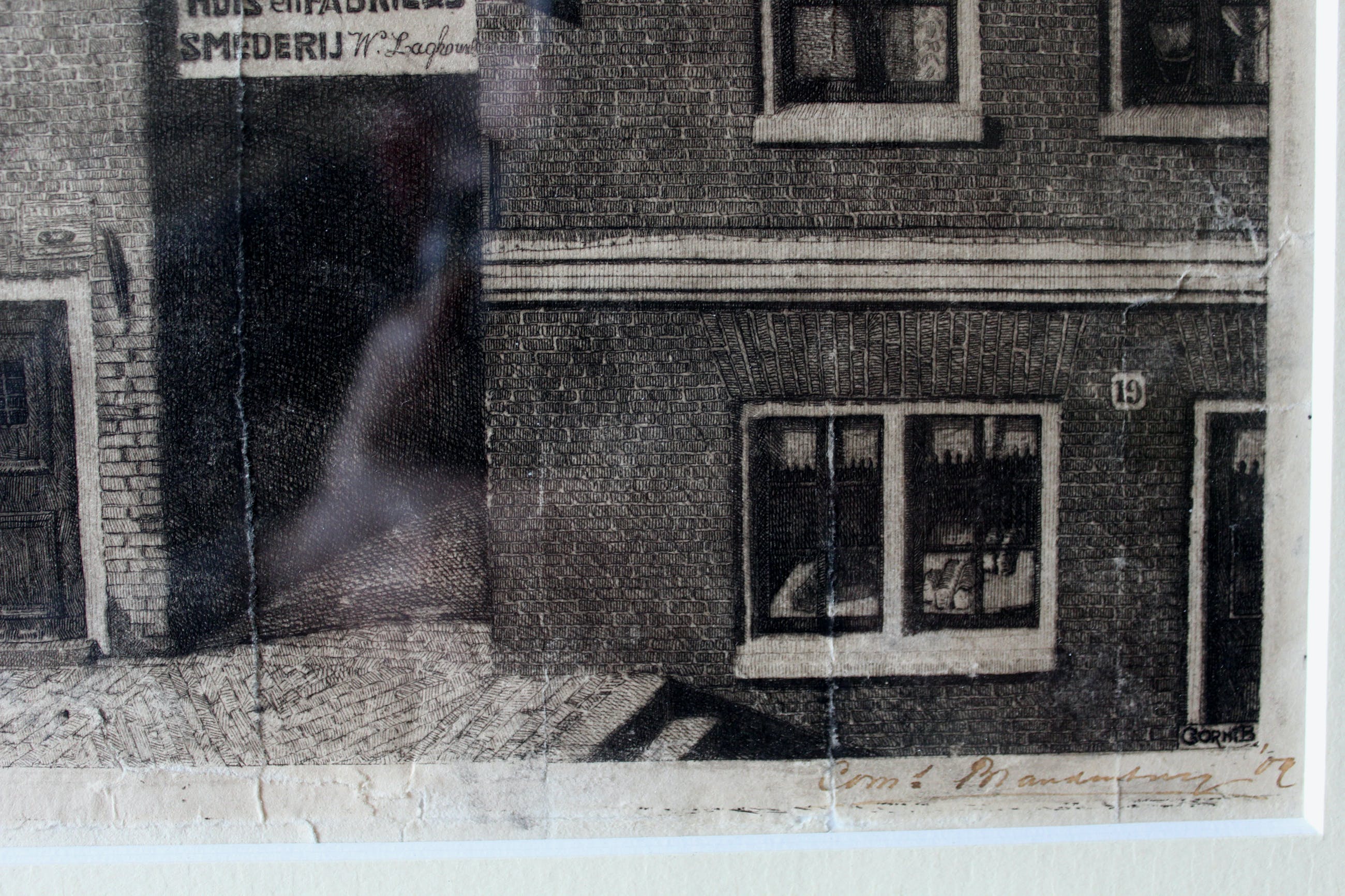 Vroeg werk van Cornelis Brandenburg. Lokatie onbekend. De prent is gerestaureerd (vergeling verwijderd, papier verstevigd, geretoucheerd) Beeldmaat: 22 x 30,5 cm. Bladmaat: 25 x 34 cm. Lijstmaat: 40 x 46 cm. Gesigneerd; Rechtsonder met potlood.