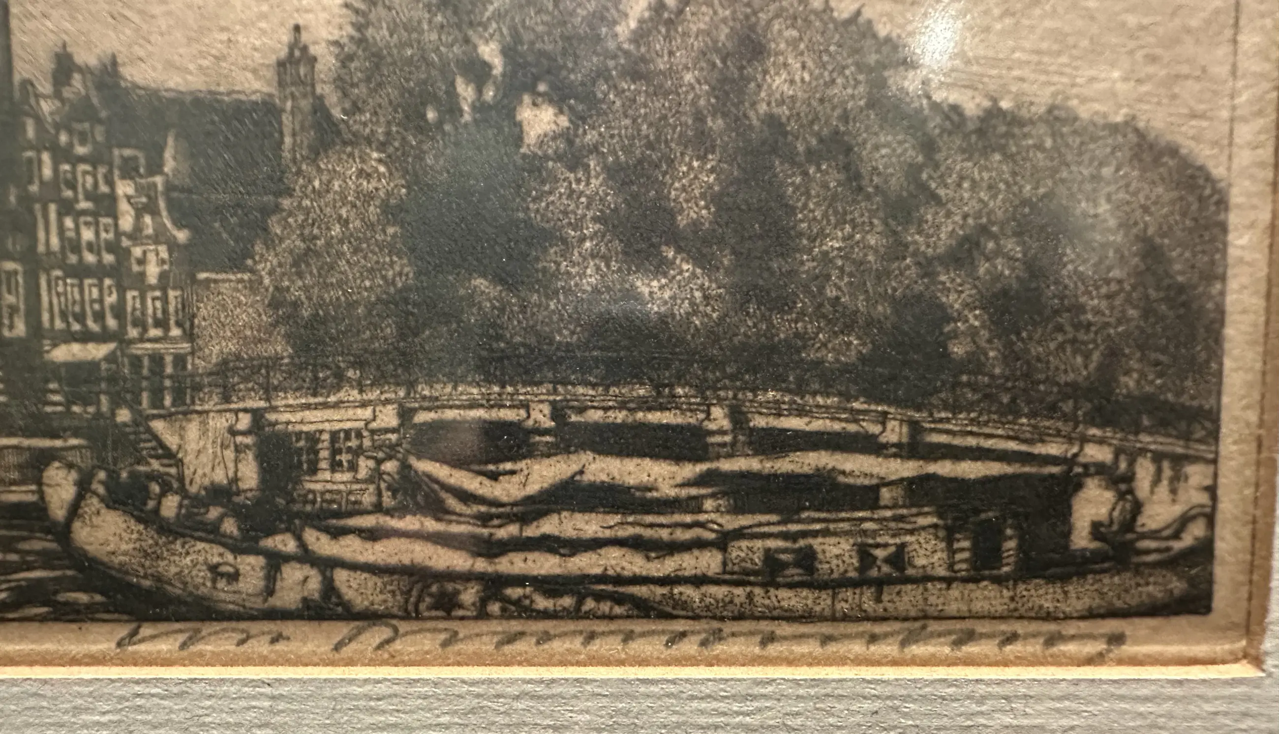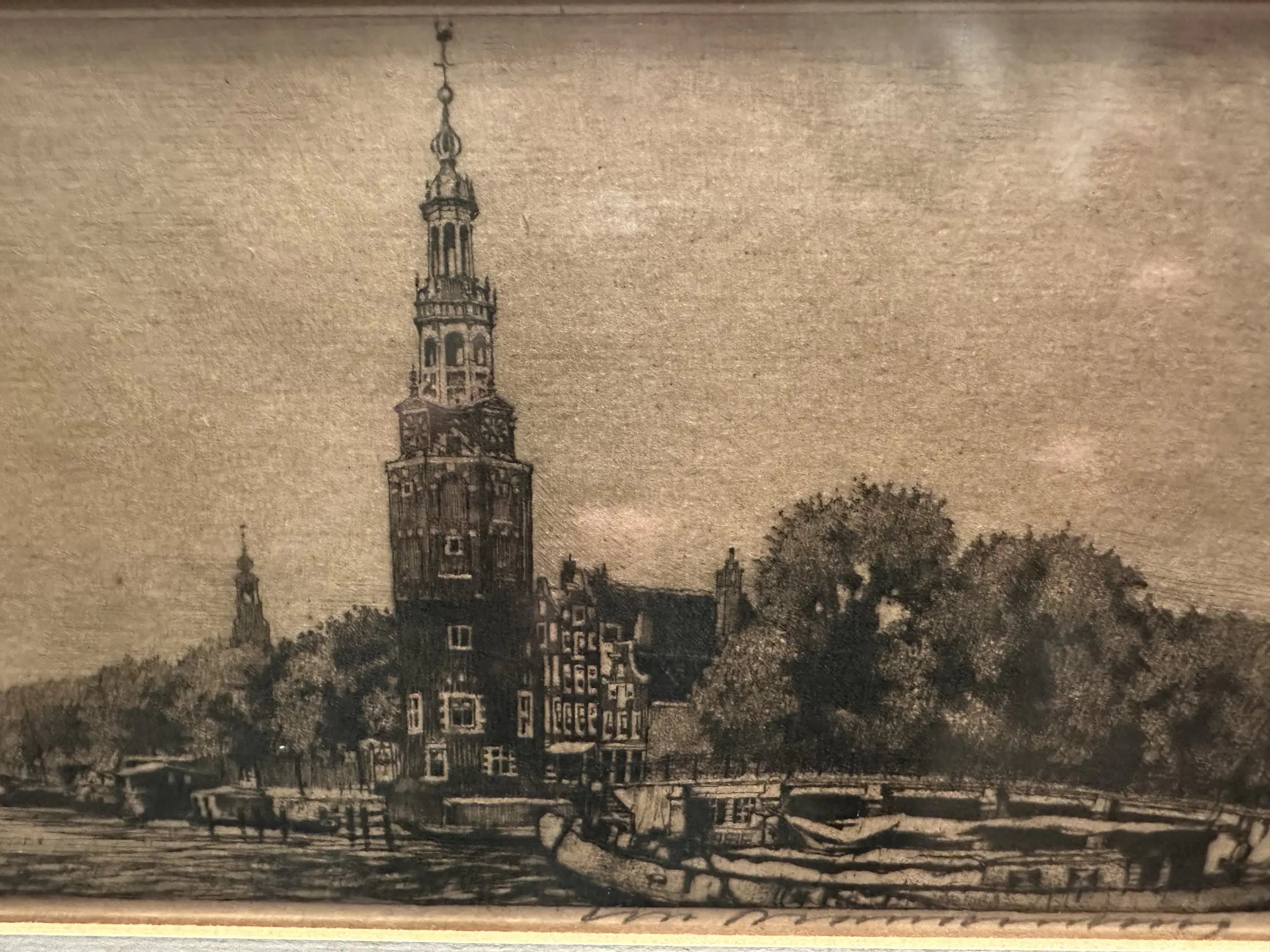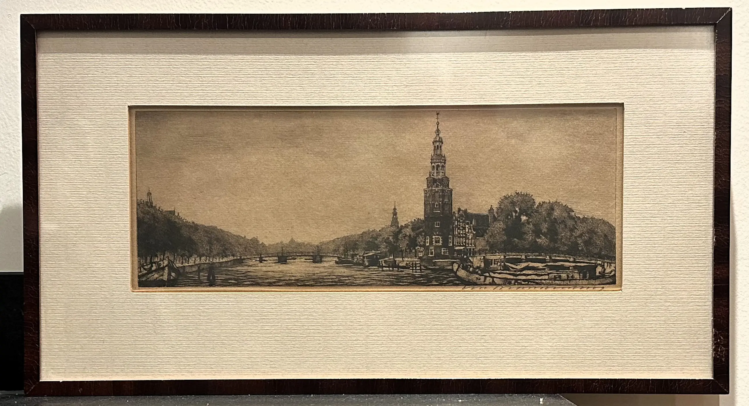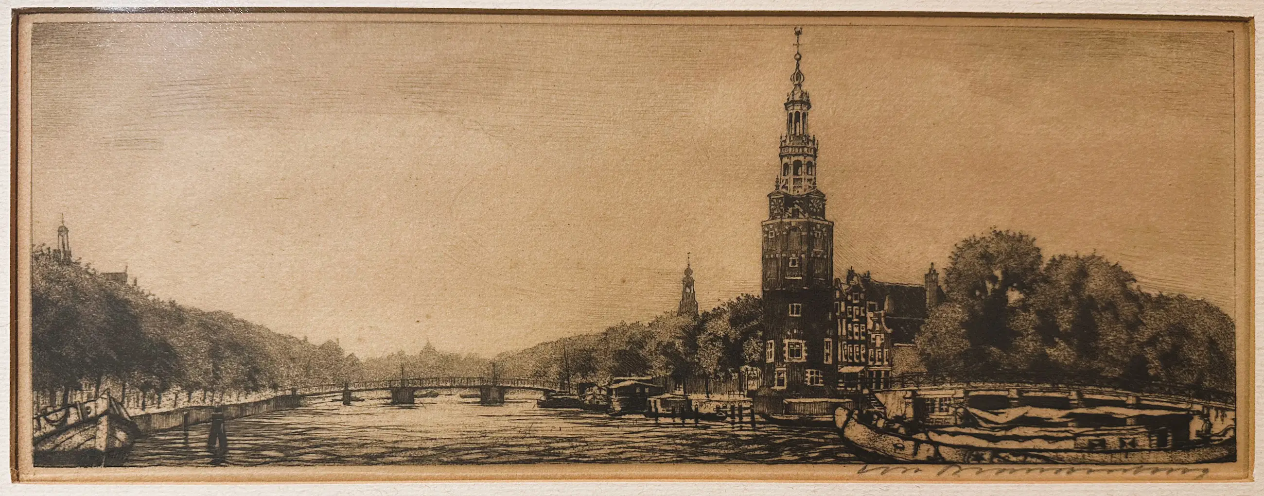 Ets van de Oude Schans in Amsterdam. Op de voorgrond de Montelbaanstoren. Beschreven in het boek Cornelis Brandenburg Oeuvre-overzicht (CB 003 M - pagina 42). Met potlood gesigneerd.