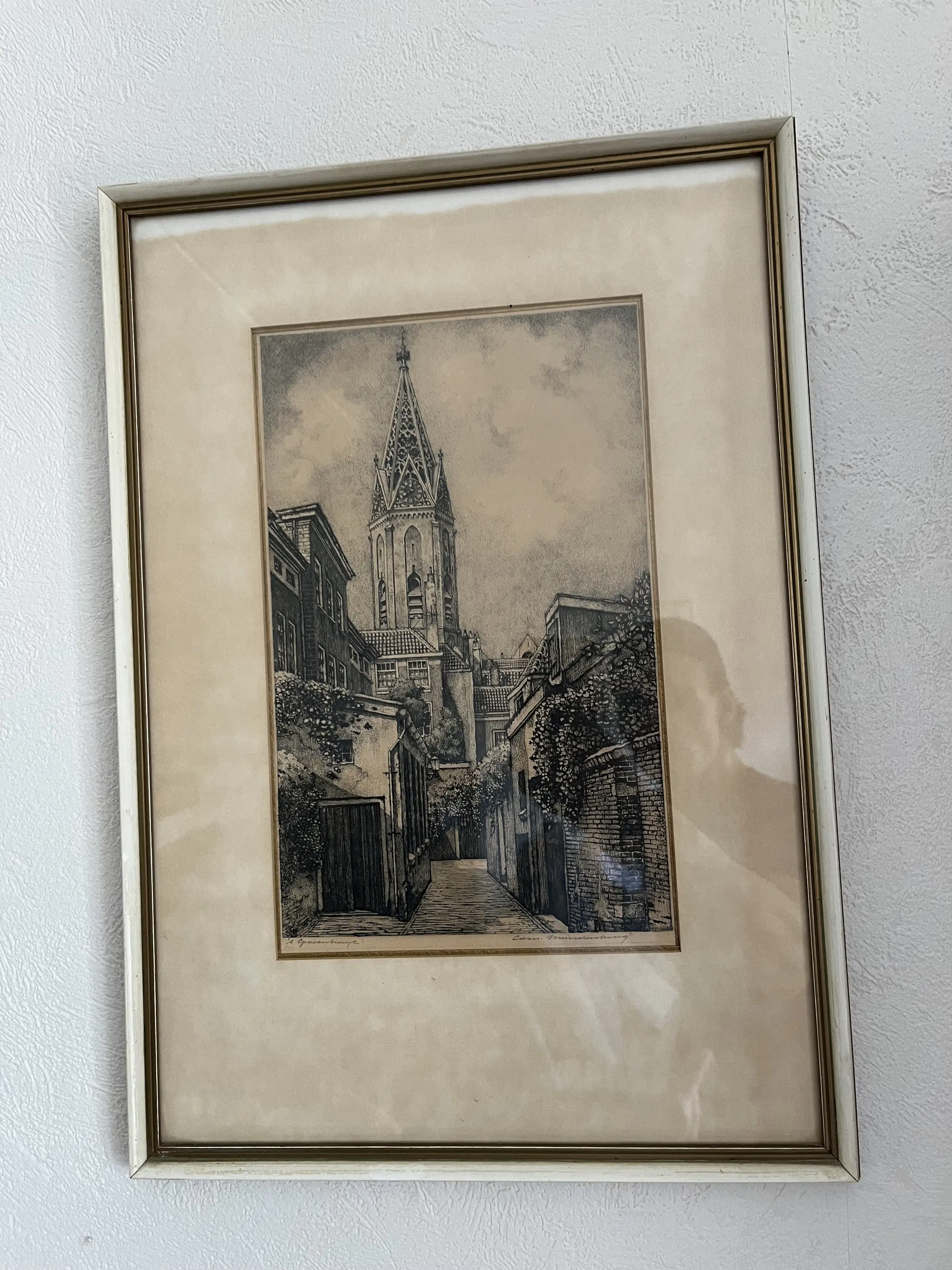 De ets is met de hand gesigneerd door de kunstenaar rechtsonder en draagt links onderin een titel (mogelijk de naam van de stad of kerk), wat typerend is voor zijn werken. De ets is ingelijst achter glas, in een eenvoudige maar passende lijst.