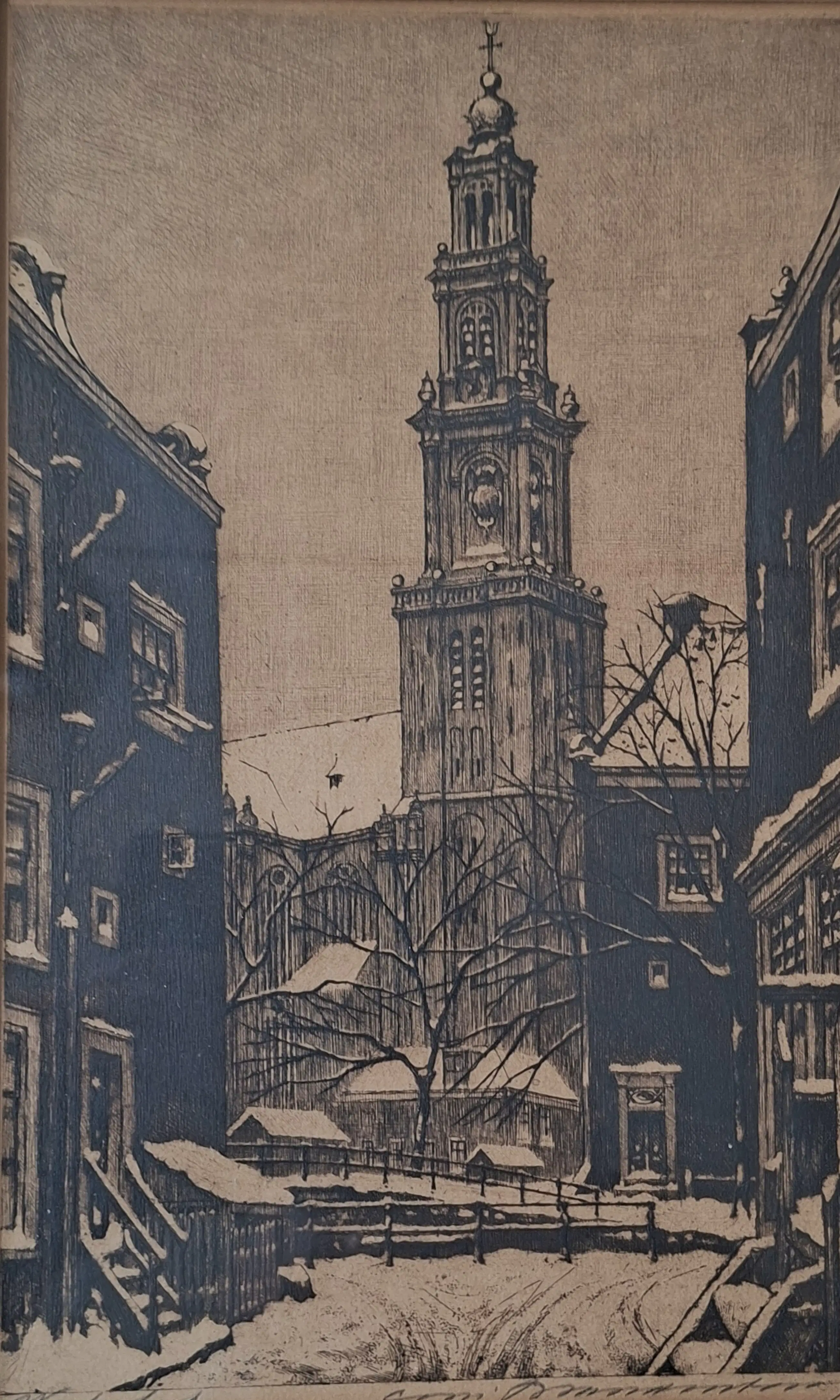 Blik op de Westerkerk in de winter.