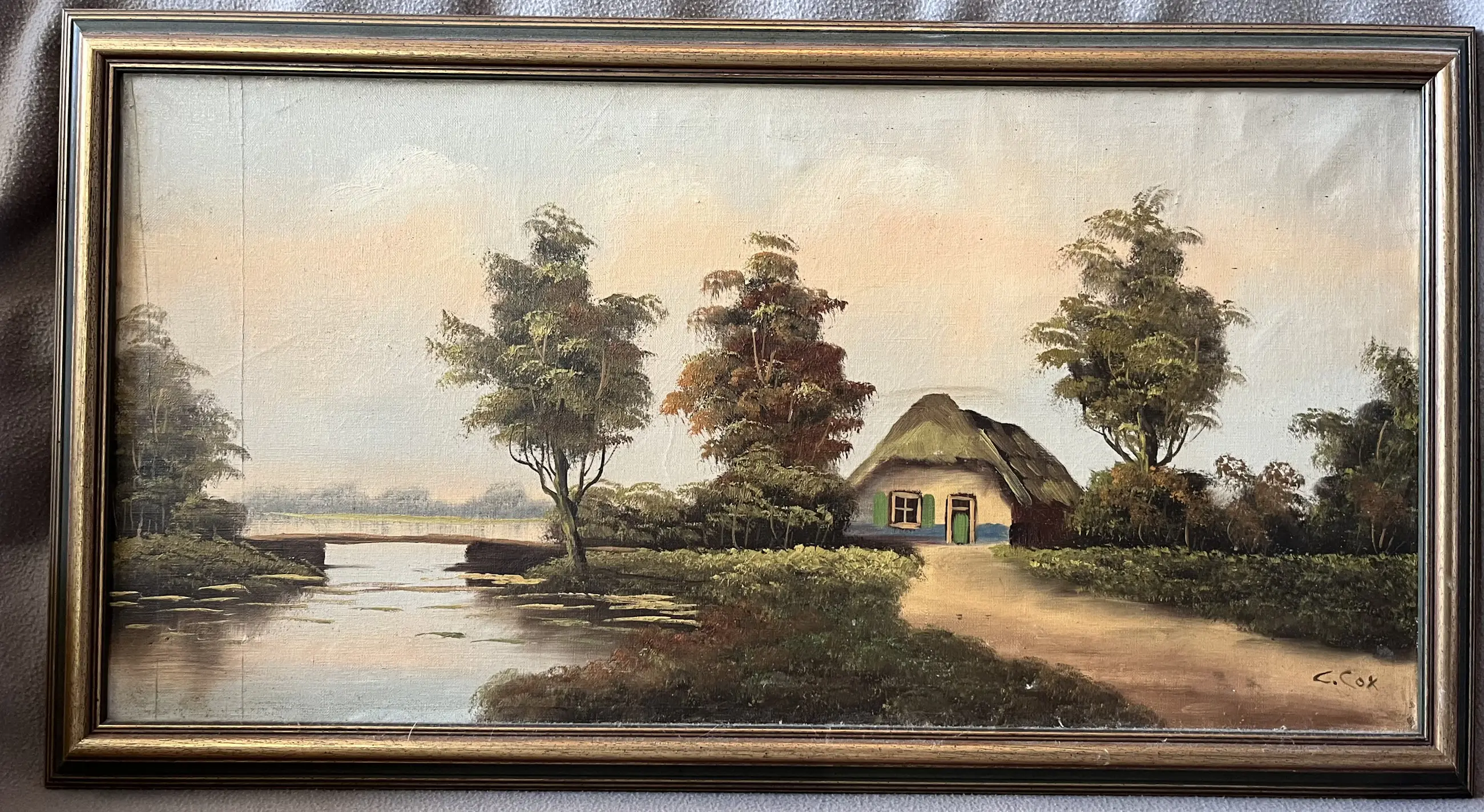 Boerderij/huis met bomen, landweg en water Professioneel ingelijst met brede groen met gouden lijst, zeer stijlvol Zeer waarschijnlijk werk van Cornelis Cox geboren 1 april 1875 te Batavia (Jakarta) overleden 17 april 1956 Laren. Hij schilderde landschappen.