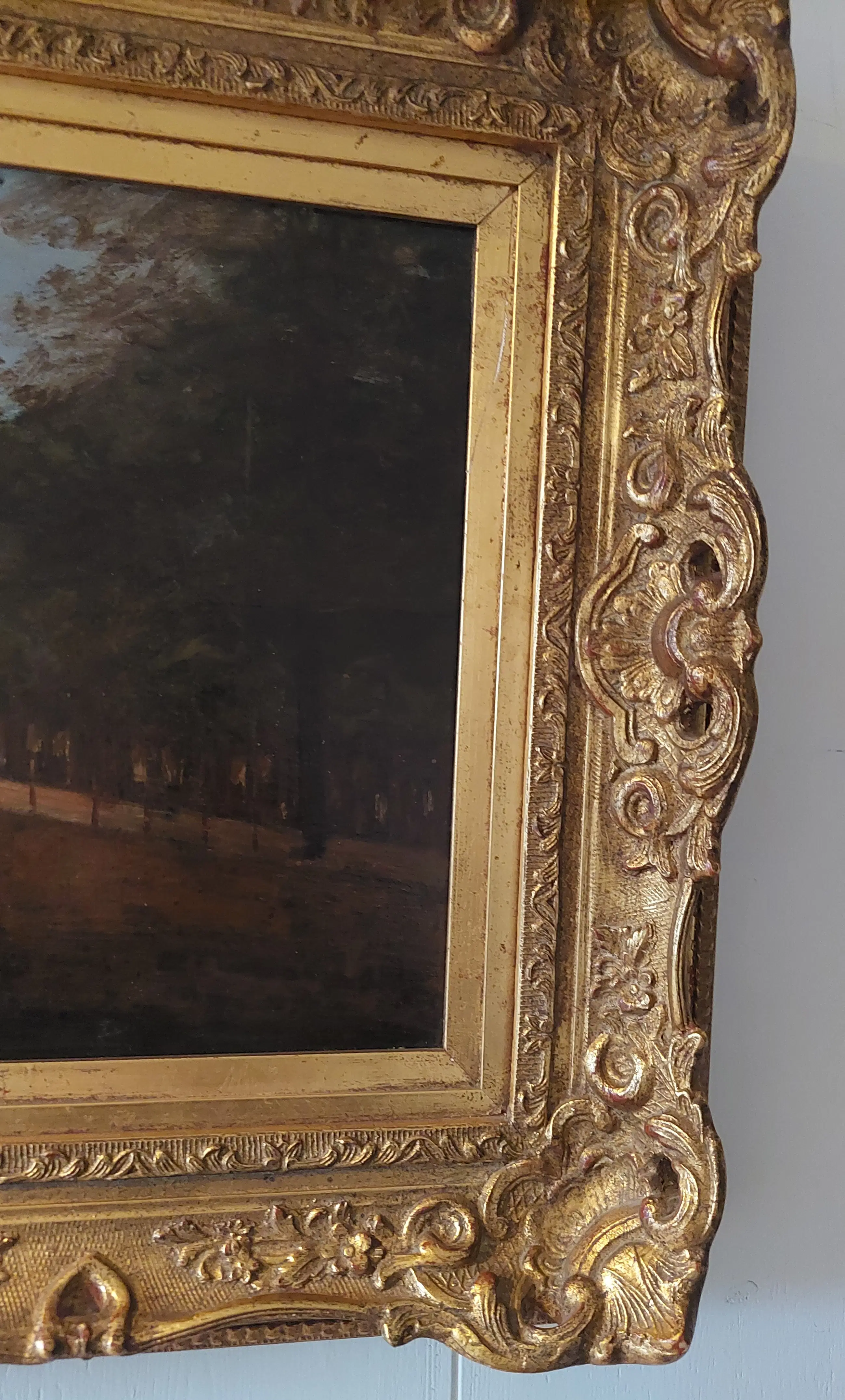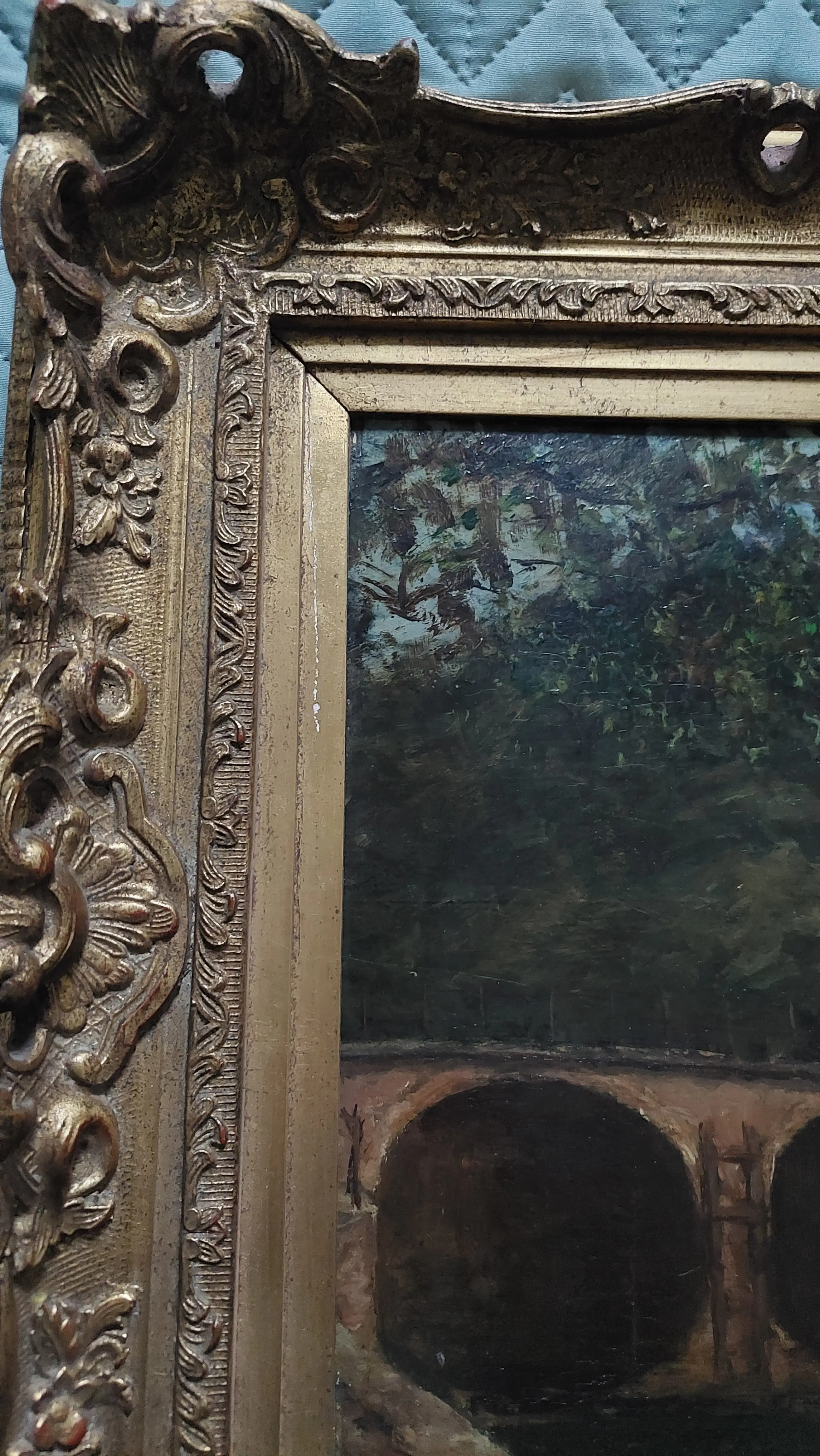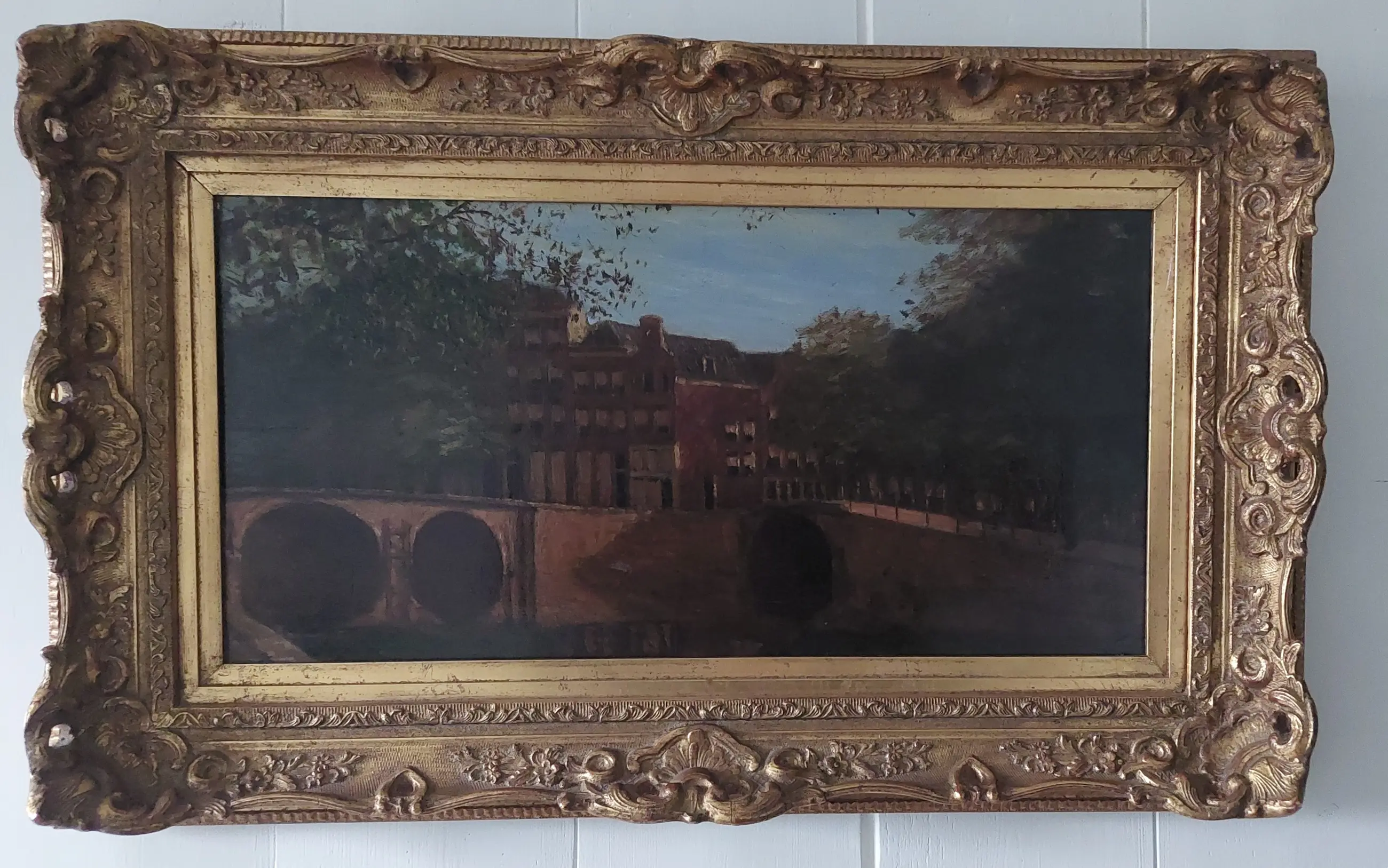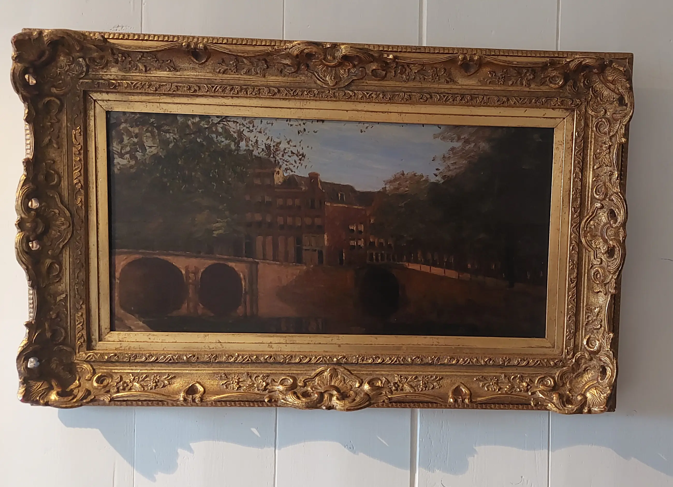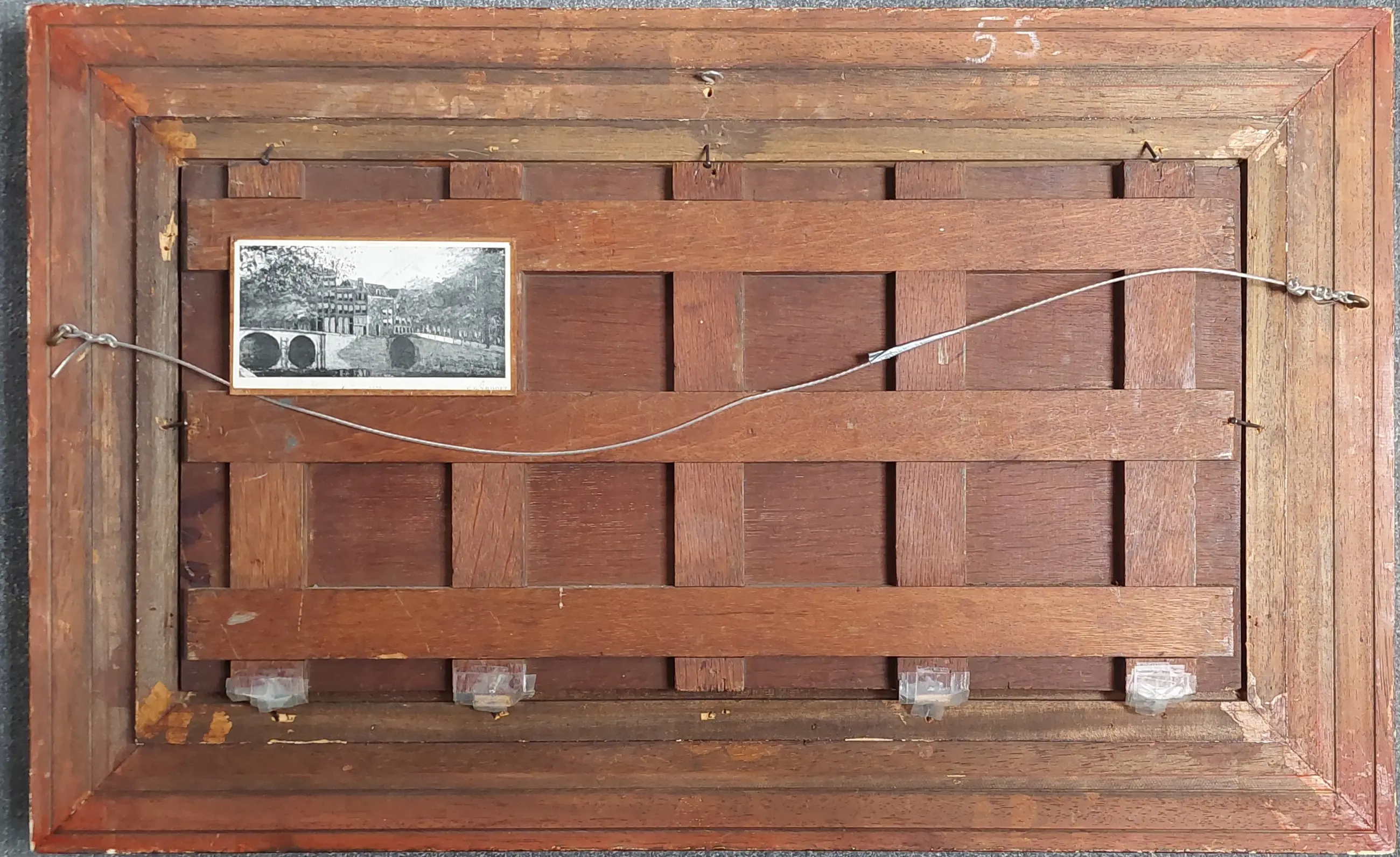 | Het werk verkeert in goede conditie en is in de originele lijst geplaatst. Op de achterkant is een foto aangebracht uit een veilingcatalogus met daarop de vermelding waaruit blijkt dat het werk van Van 't Hooft is. De fraaie lijst verkeert in goede staat. Op 2 plaatsen is de verf gebarsten - zie laatste foto -. Dit is gemakkelijk te restaureren. | |