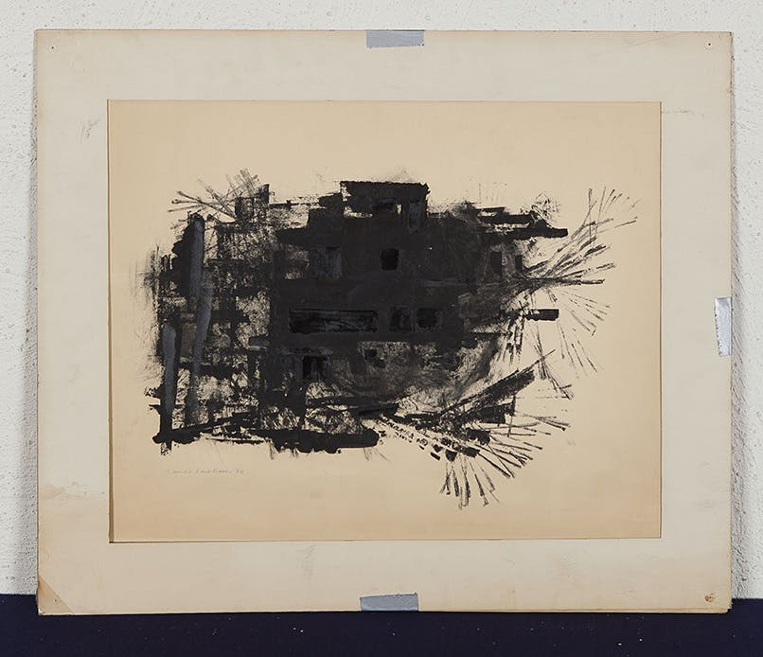Het kunstwerk heeft geen lijst en is dus een los blad in een passe-partout.