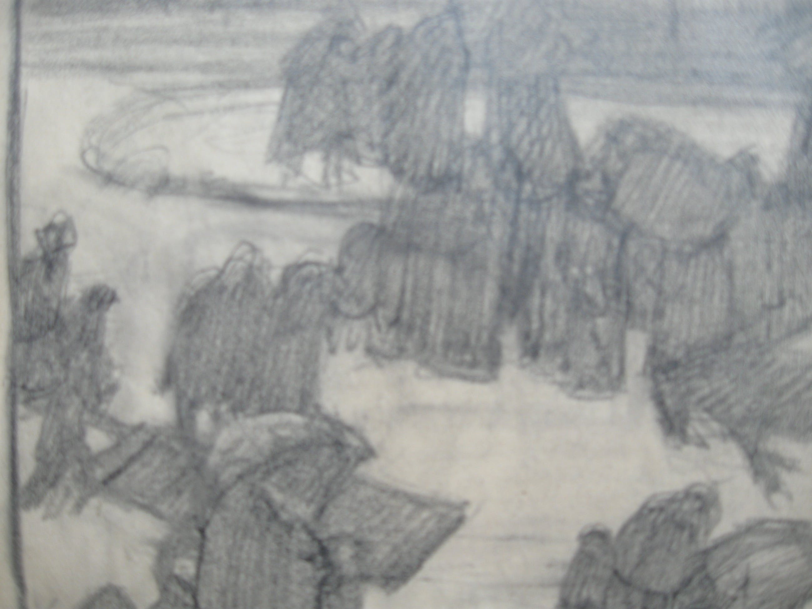 Vroege potloodtekening van Cornelis Koning (Zaandijk 1893 - Amsterdam 1951). Figuren en karren op straat getekend in Amsterdam. Vermoedelijk rond 1920.