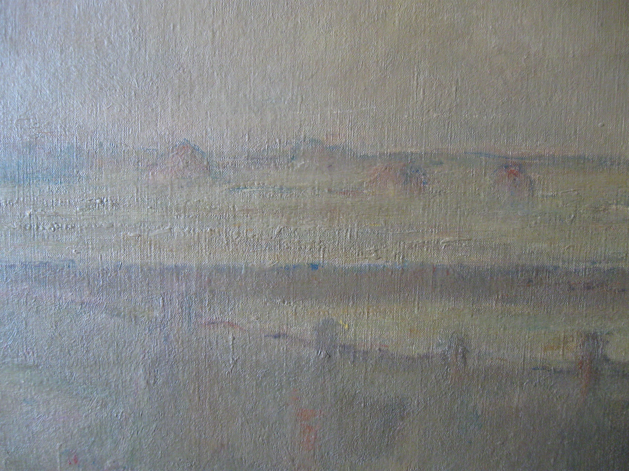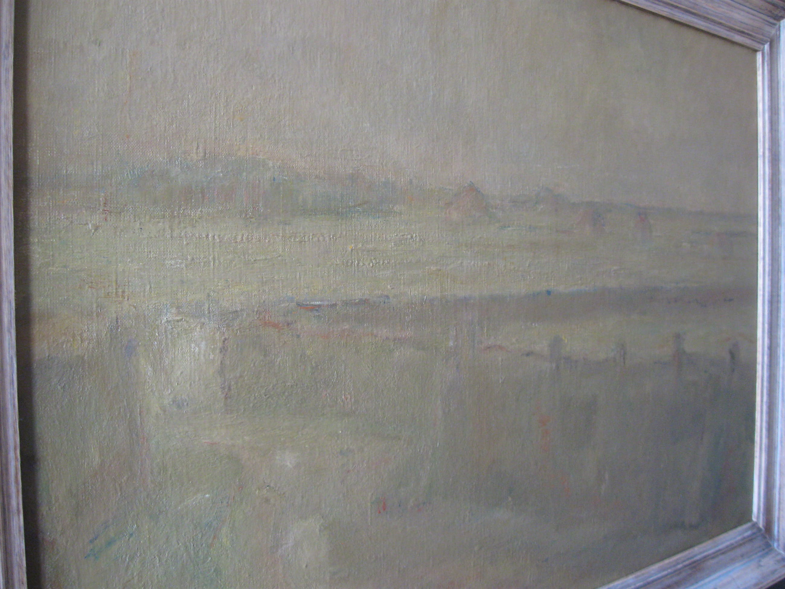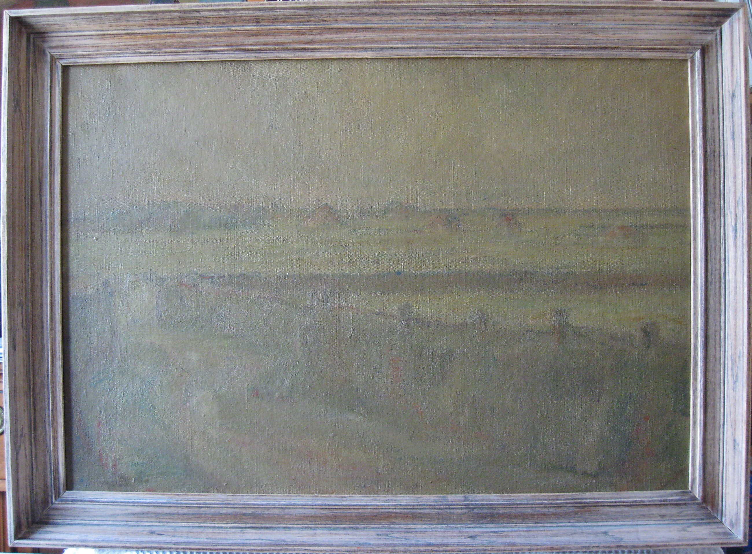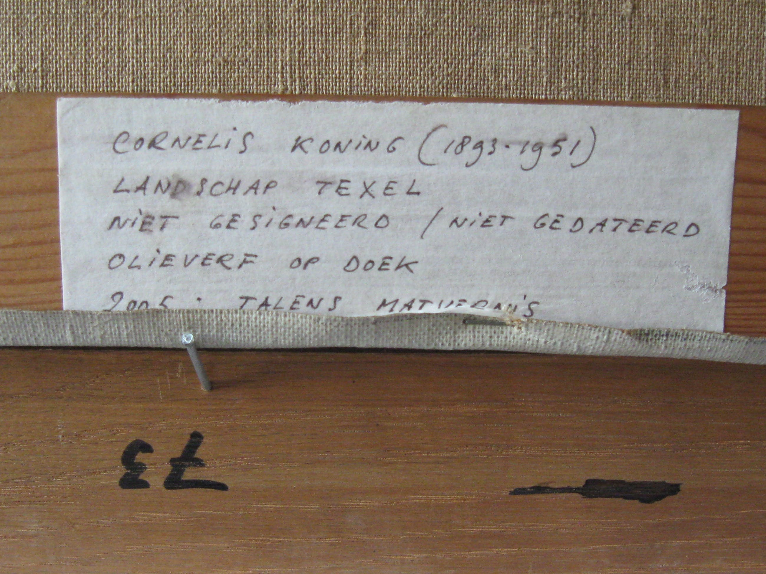 Schilderij van de kunstenaar Cornelis Koning (1893 - 1951). Landschap Texel. Koning had in Oosterend familie en van tijd tot tijd kwam hij op het eiland om er te tekenen en te schilderen. Dit werk is niet gesigneerd of gedateerd. Vermoedelijk gemaakt eind jaren '40 in 1947 of 1948. In de oorspronkelijke, originele profiellijst.