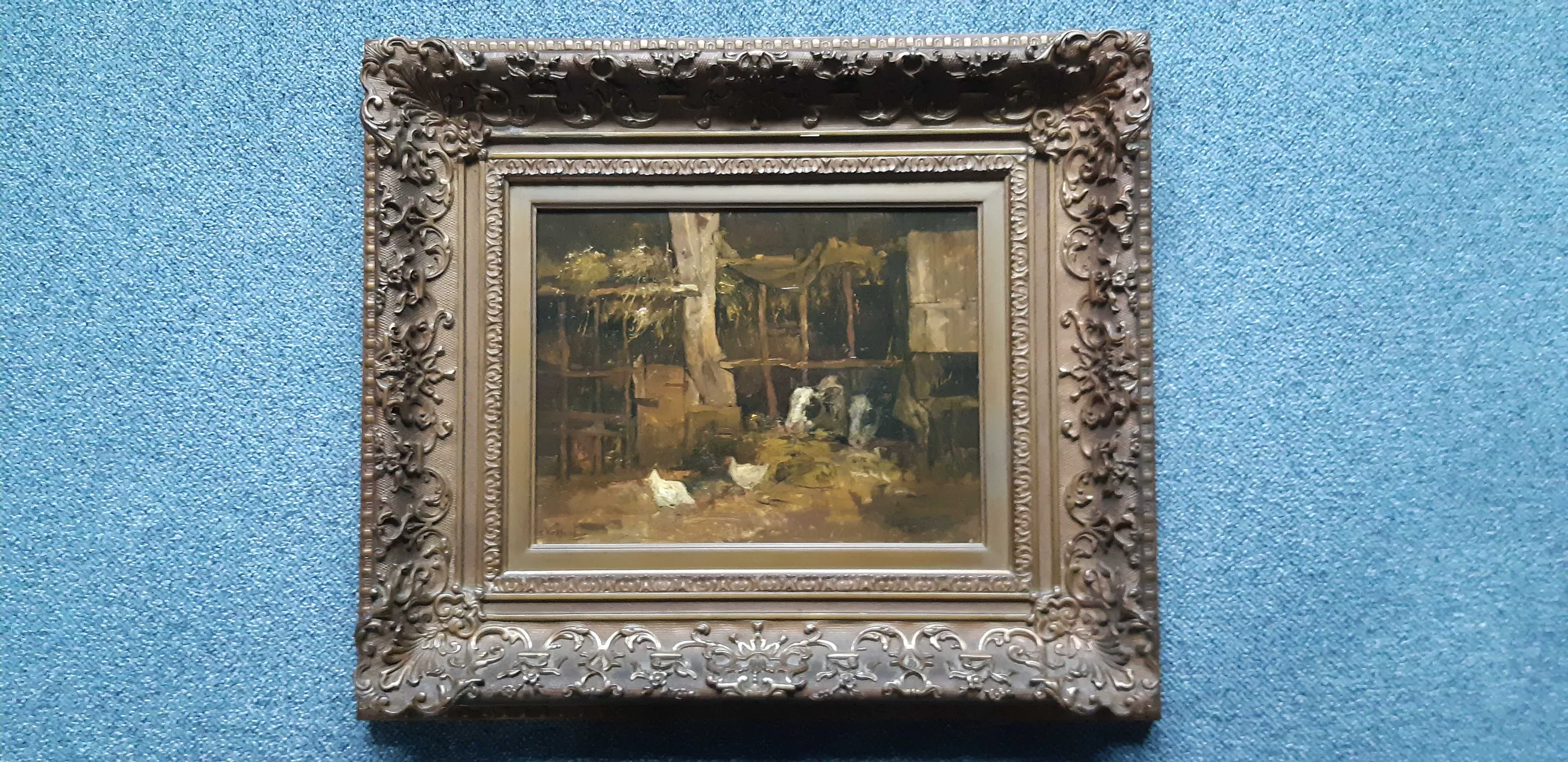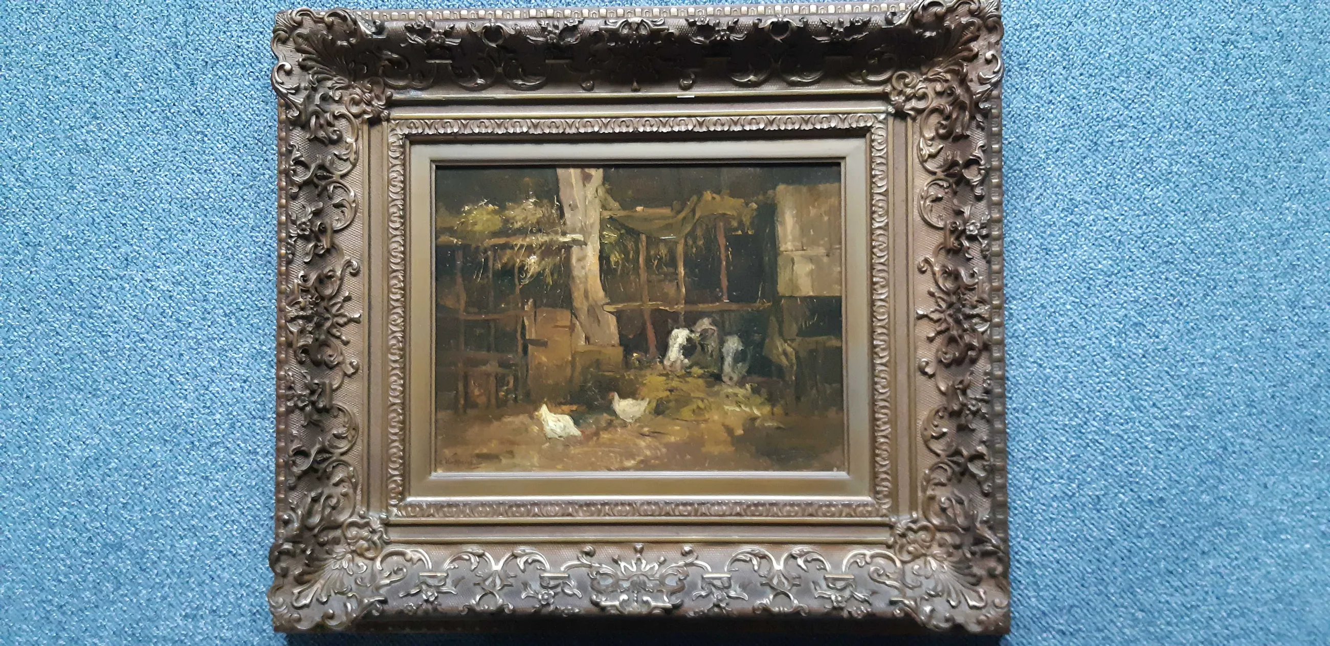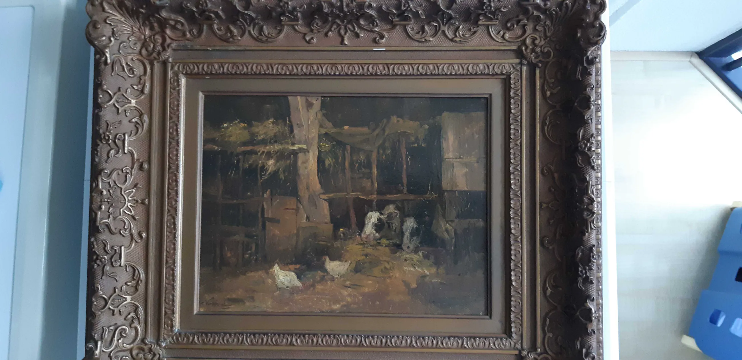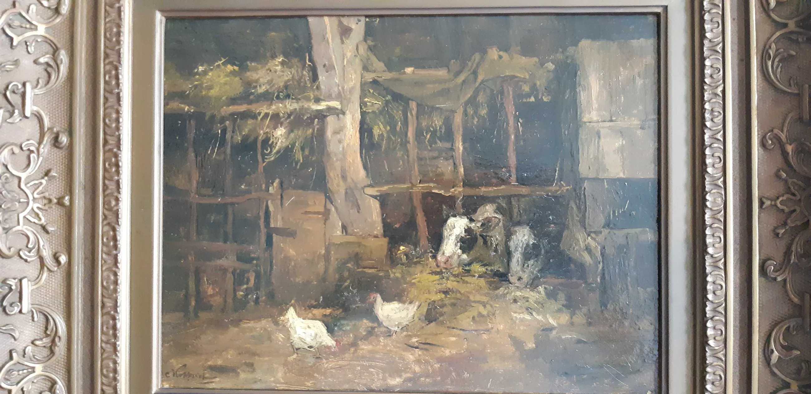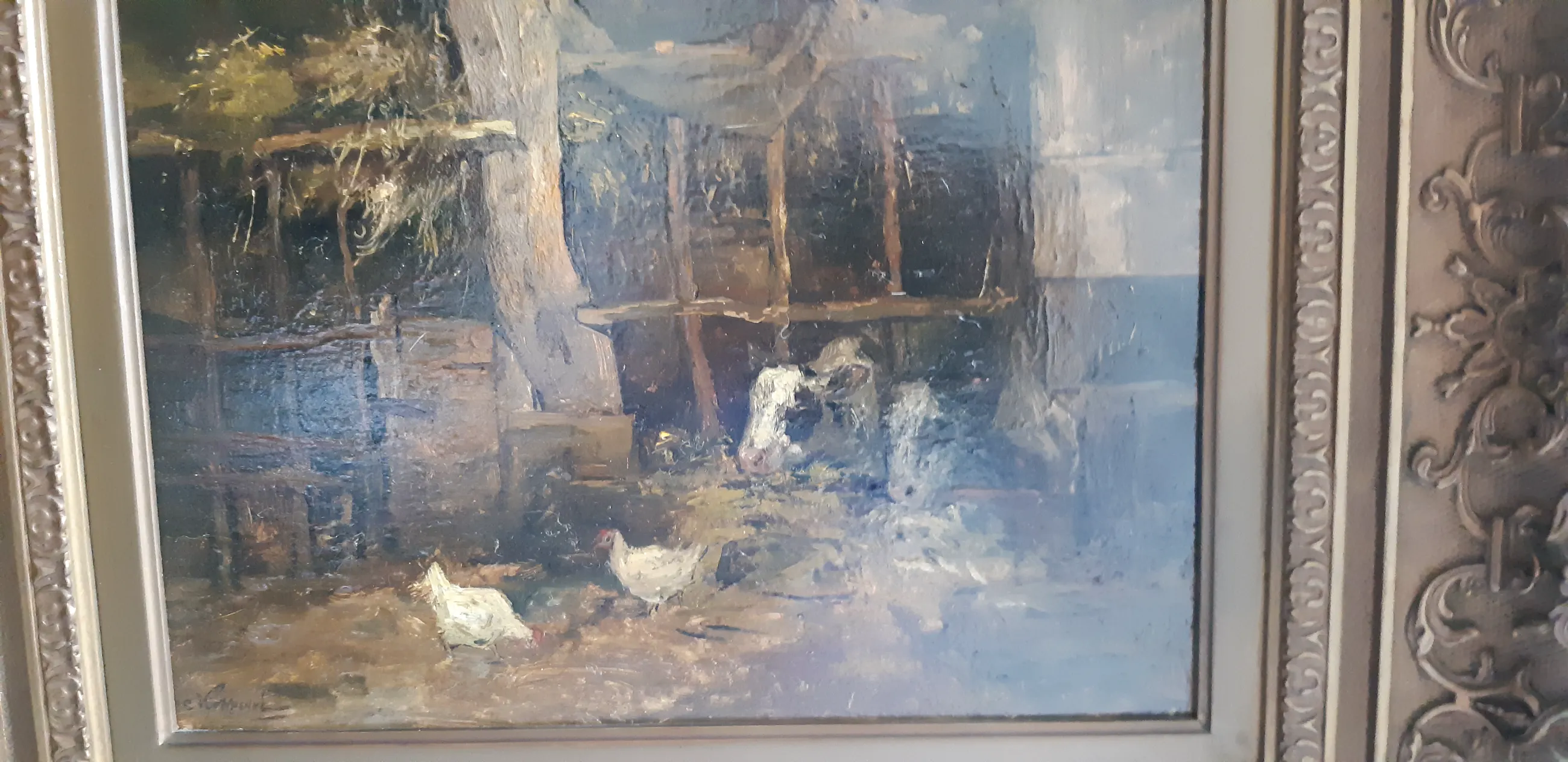 Schilderij uit nalatenschap. Paneel. Boereninterieur van boerenstal, koeien met kippen.