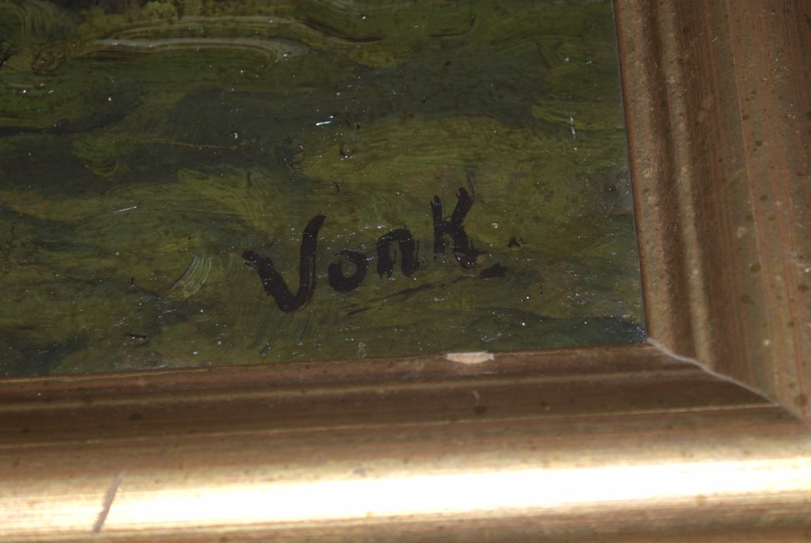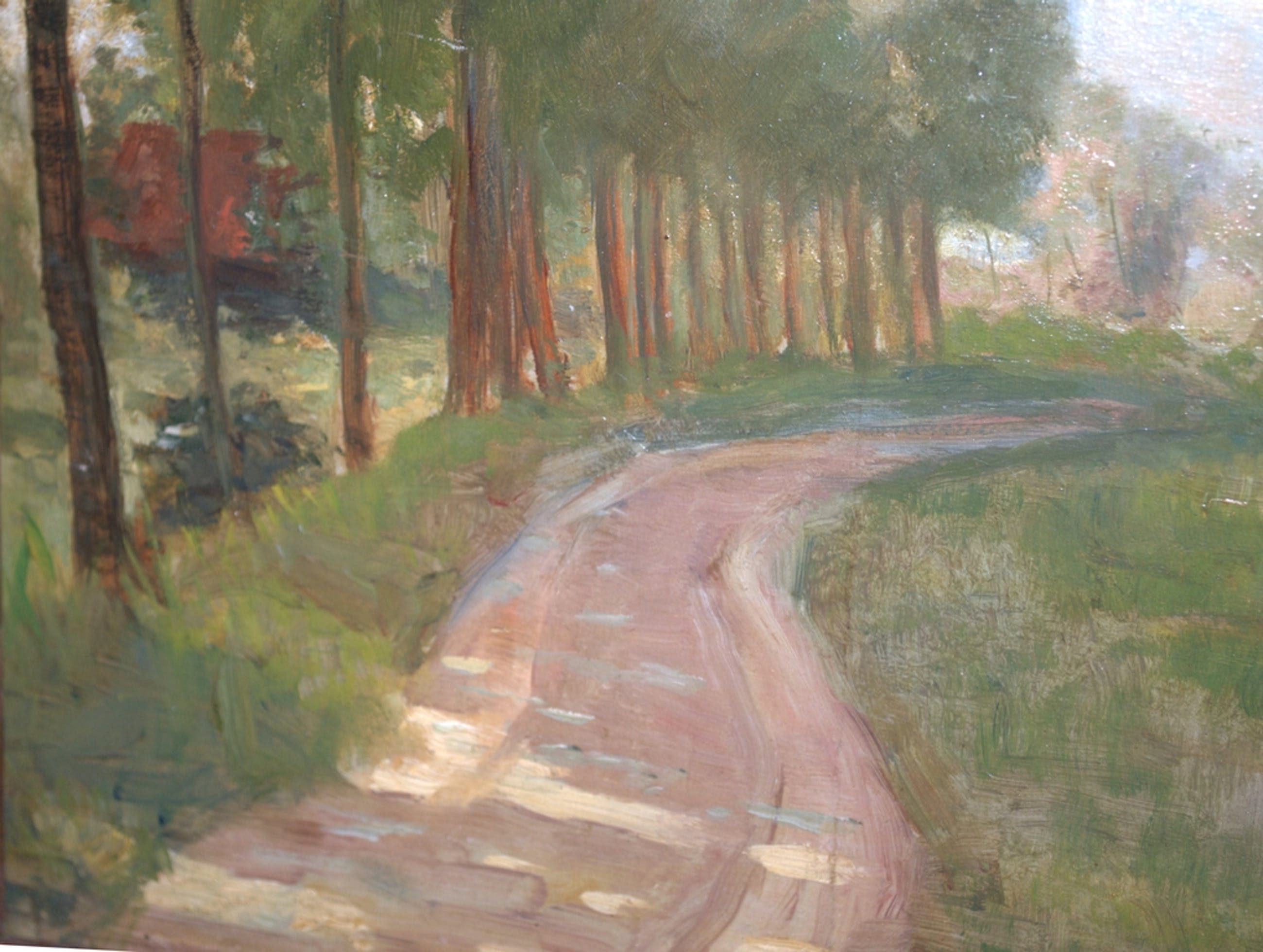 Daarbij een olieverf op karton (1e en 2e foto) van een onbekende kunstenaar,een zonnig pad langs een weiland, 23x31 cm, in goede gebruikte staat. Ongesigneerd. In een fraaie eikenhouten lijst in goede staat, 33x41 cm. Herkomst de gerenommeerde kunsthandel J.H.Brugman, Noordeinde, Den Haag.