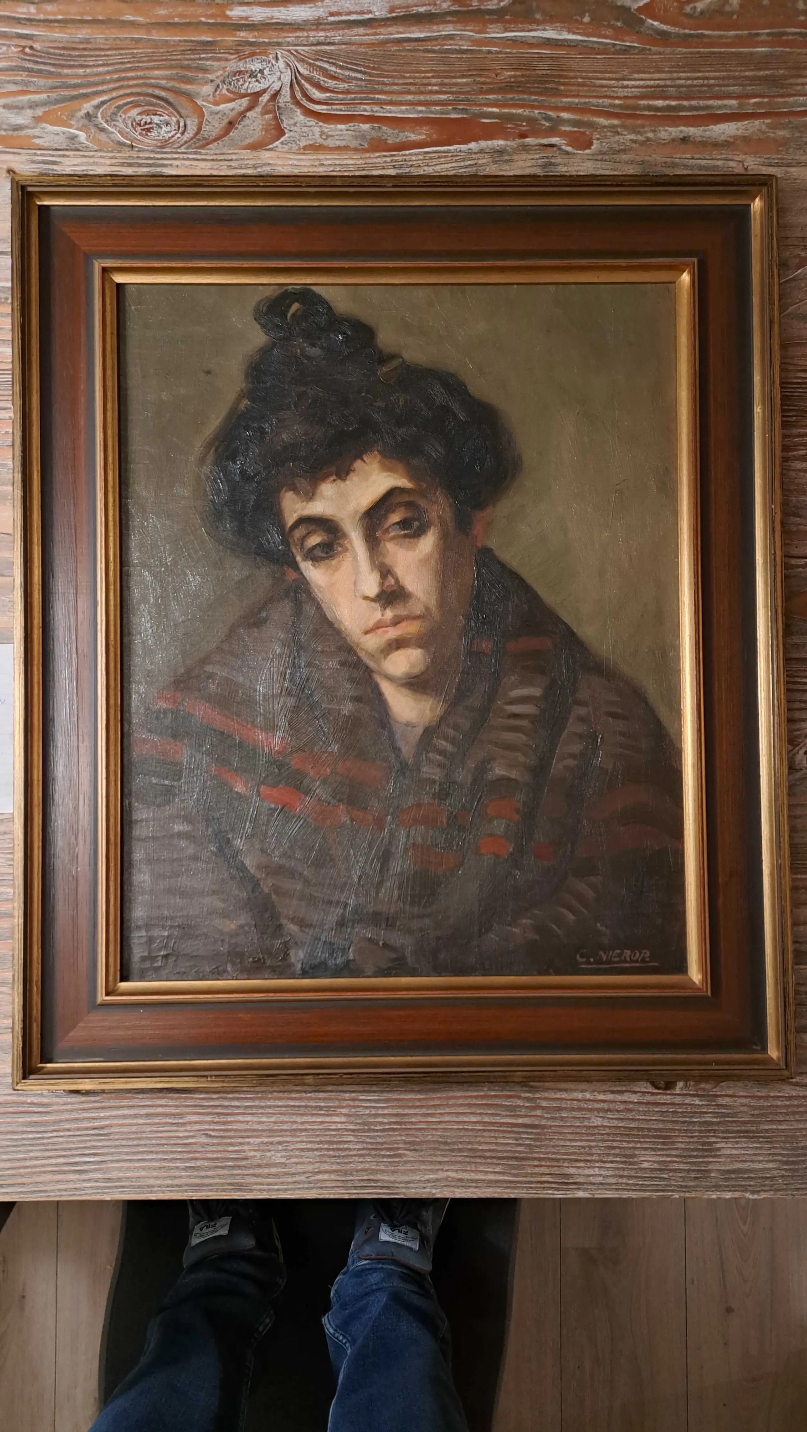 Het betreft een olieverfschilderij op doek. De lijst is nog goed in orde. Het betreft een peinzend persoon