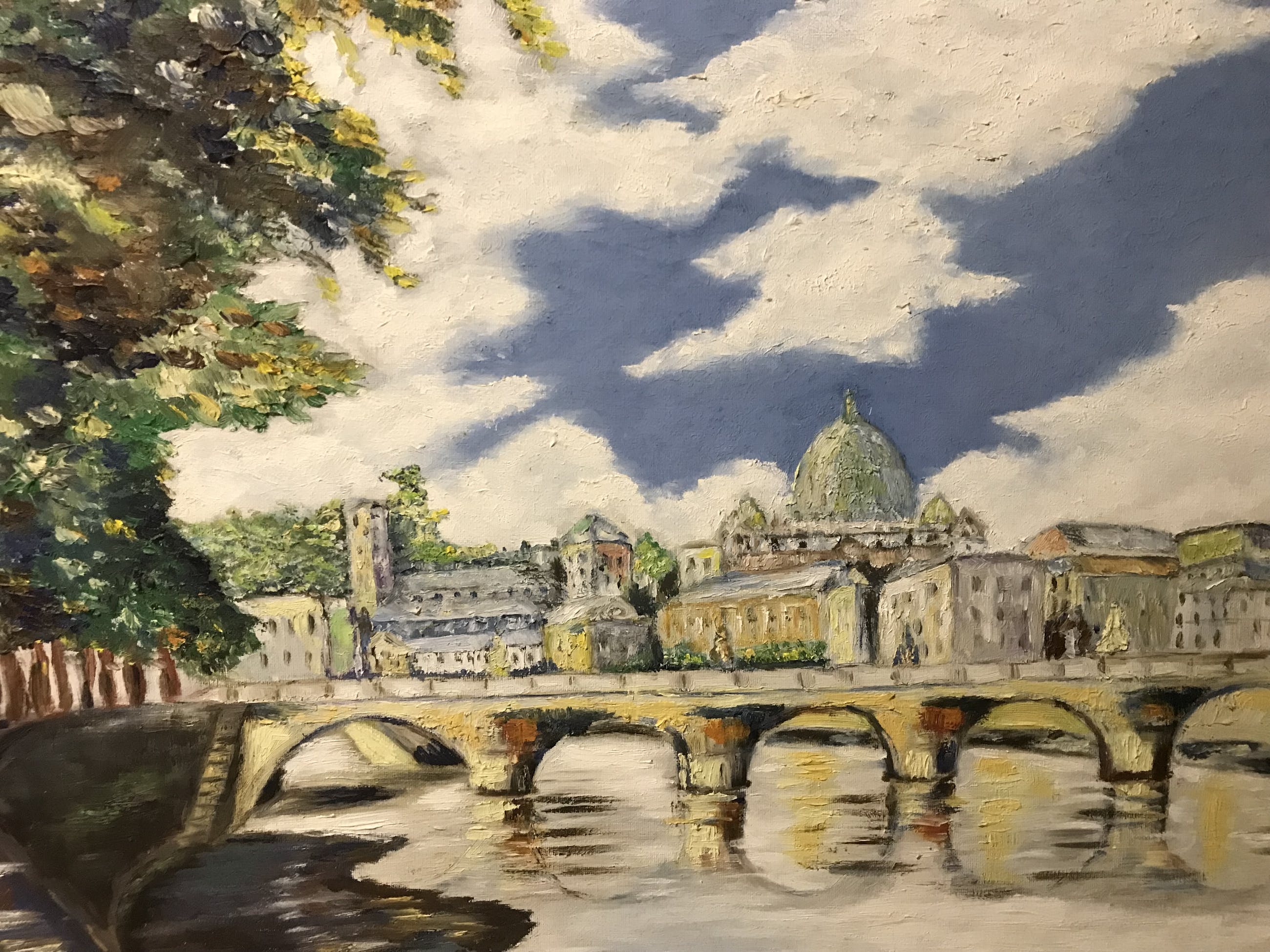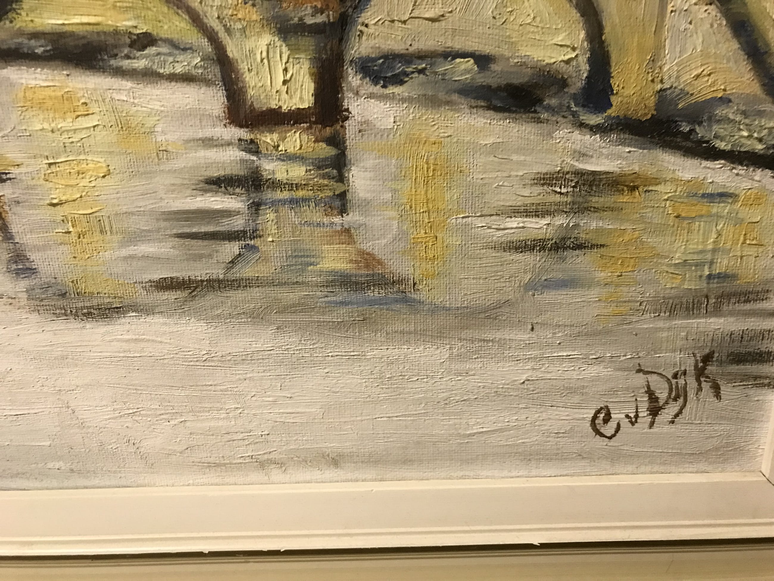 Een mooi schilderij op doek met een stadgezicht van Parijs aan de Seine Maat is met lijst 62 bij 82 Doekmaat is 50 bij 70 Schilderij en lijst verkeren in goede staat Gesigneerd C v Dijk
