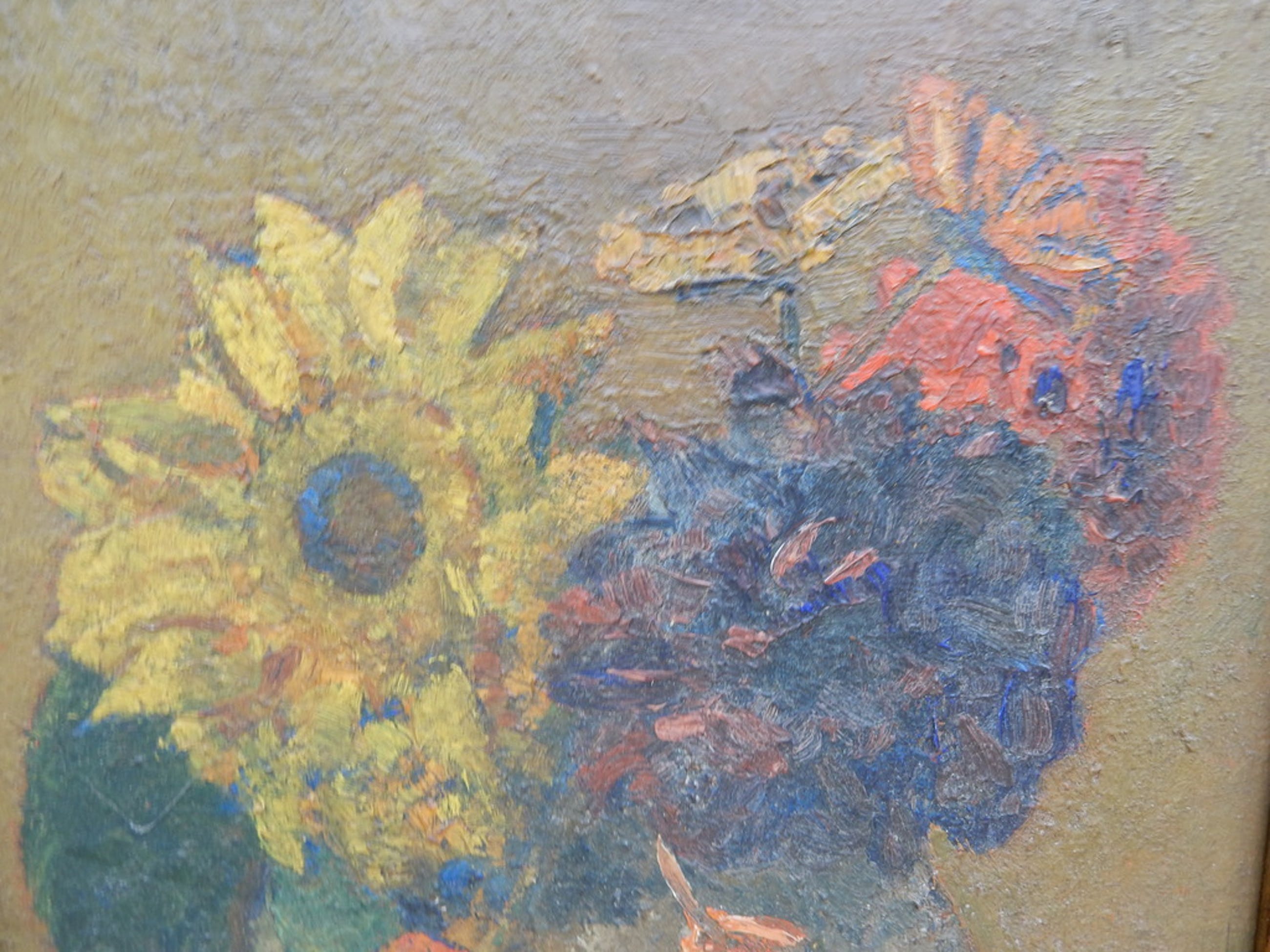 Dit werk; stilleven, met bloemen in vaas, olieverf op paneel, l.o. gesigneerd