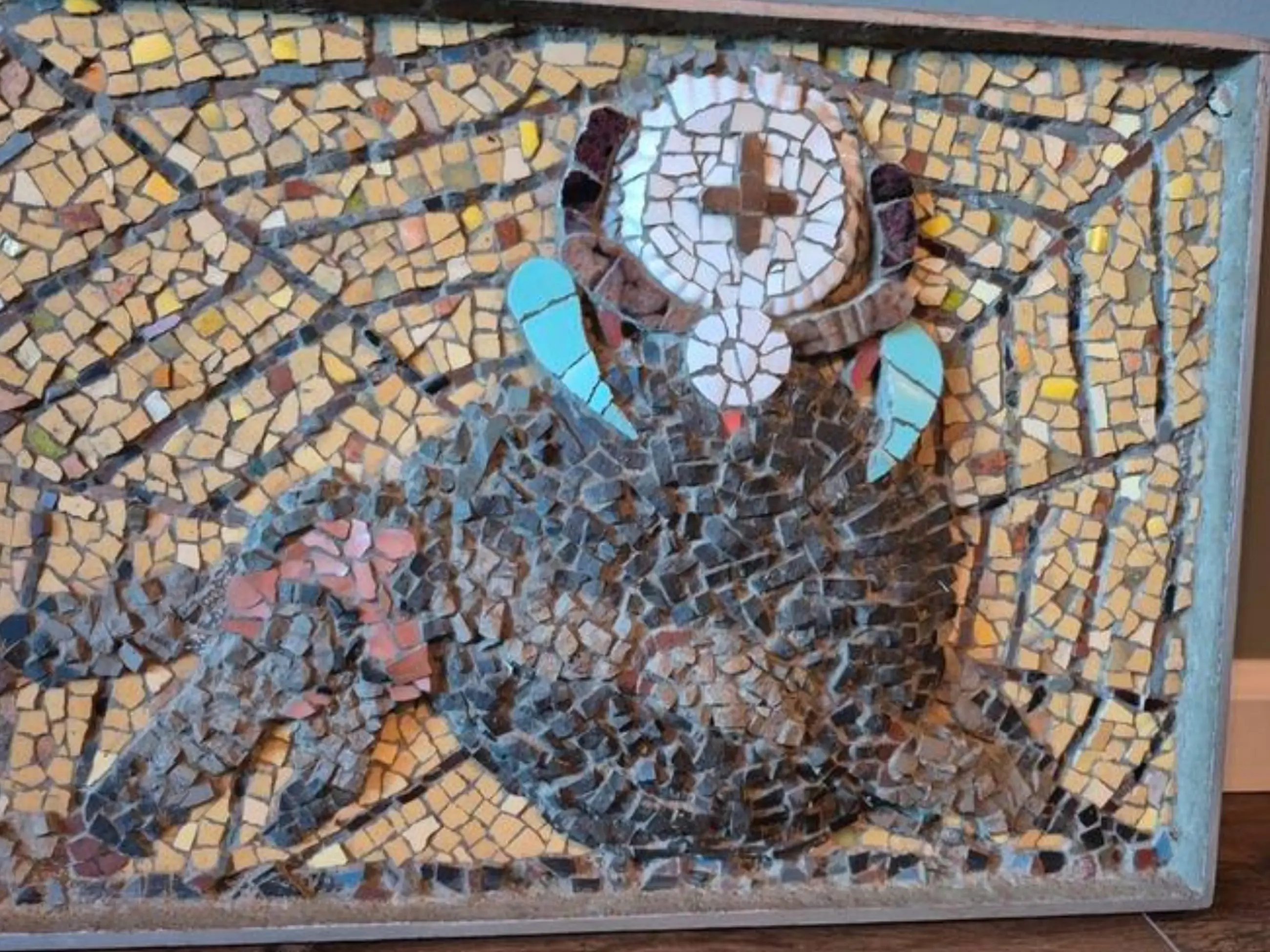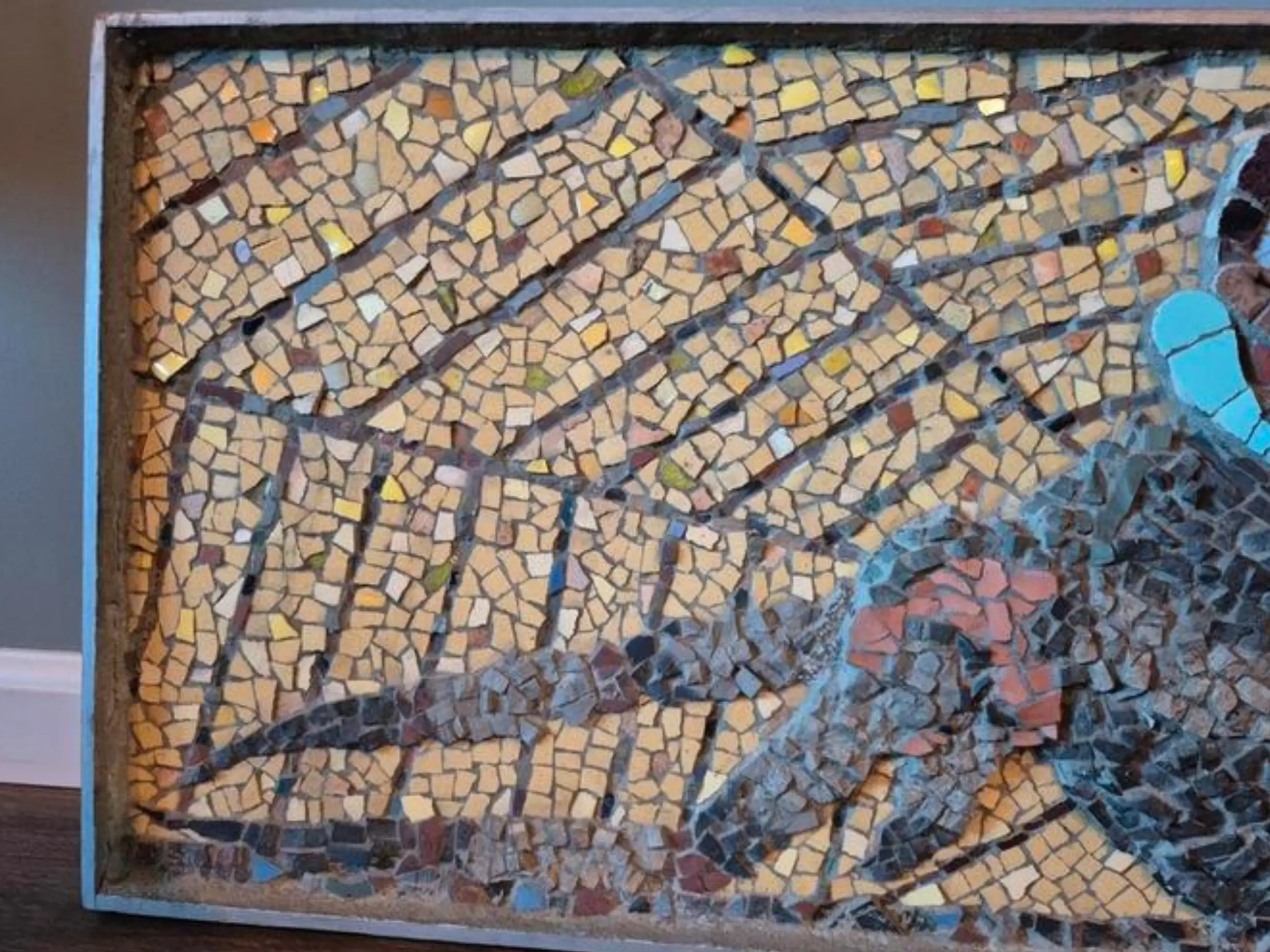 Het mozaïek is onbeschadigd, de lijst ziet er gebruikt uit.