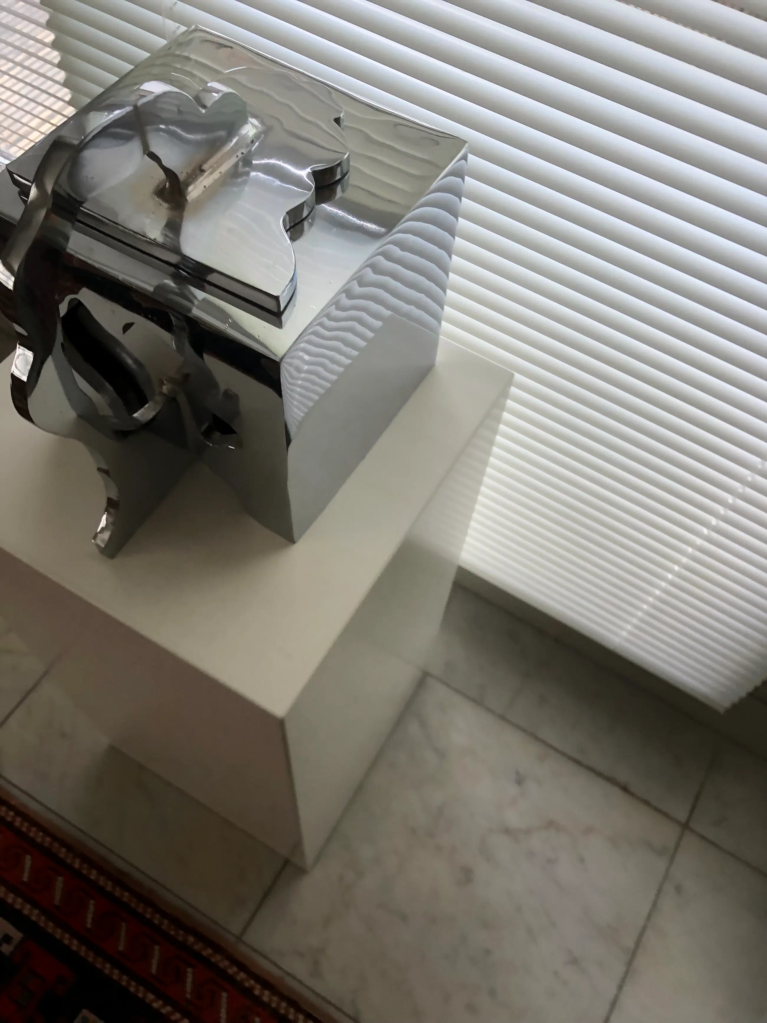 Tweedelig verchroomd metalen object of Open kubus met één handgreep. Datering 1968. Oplagenummer 3/20.