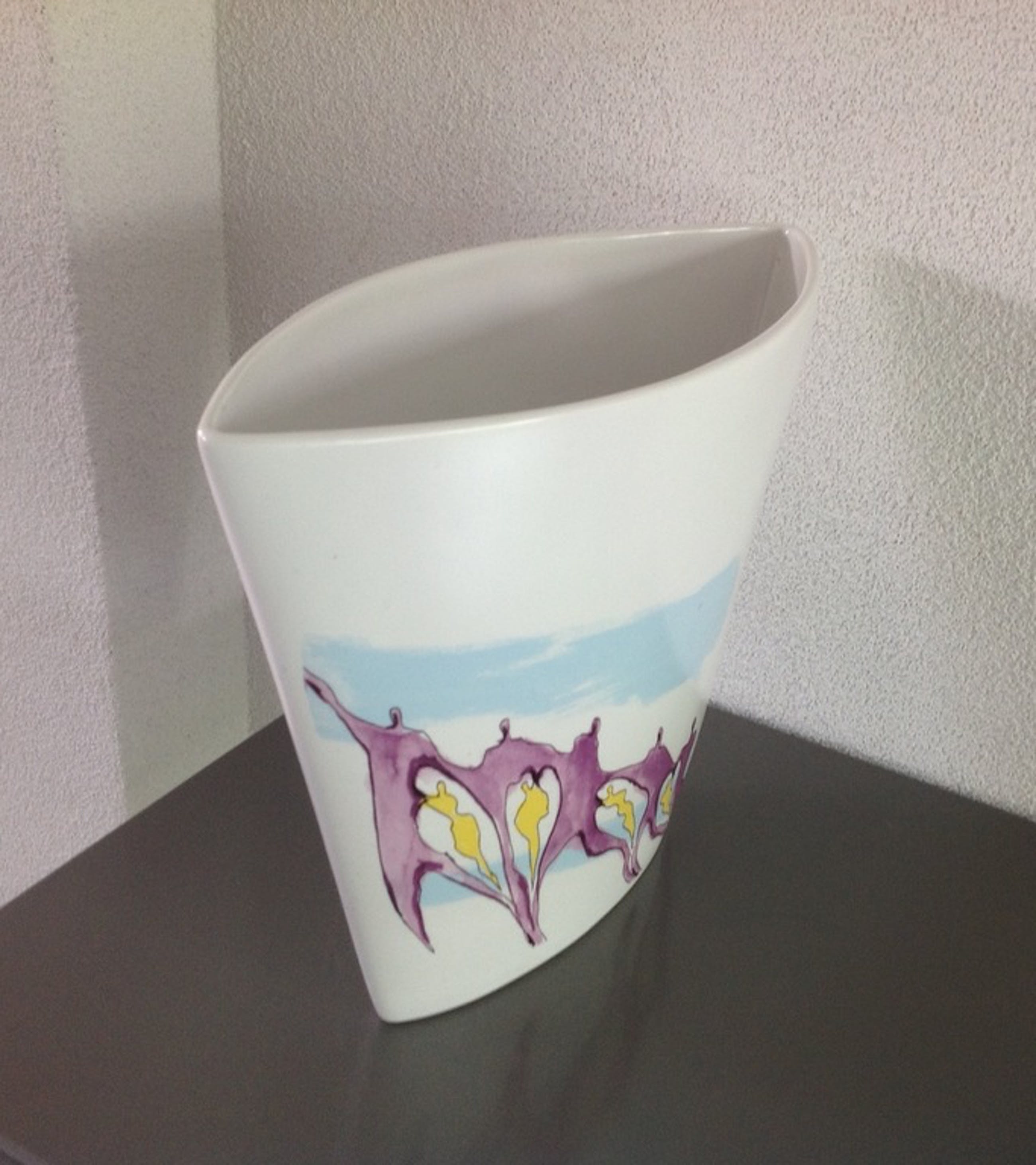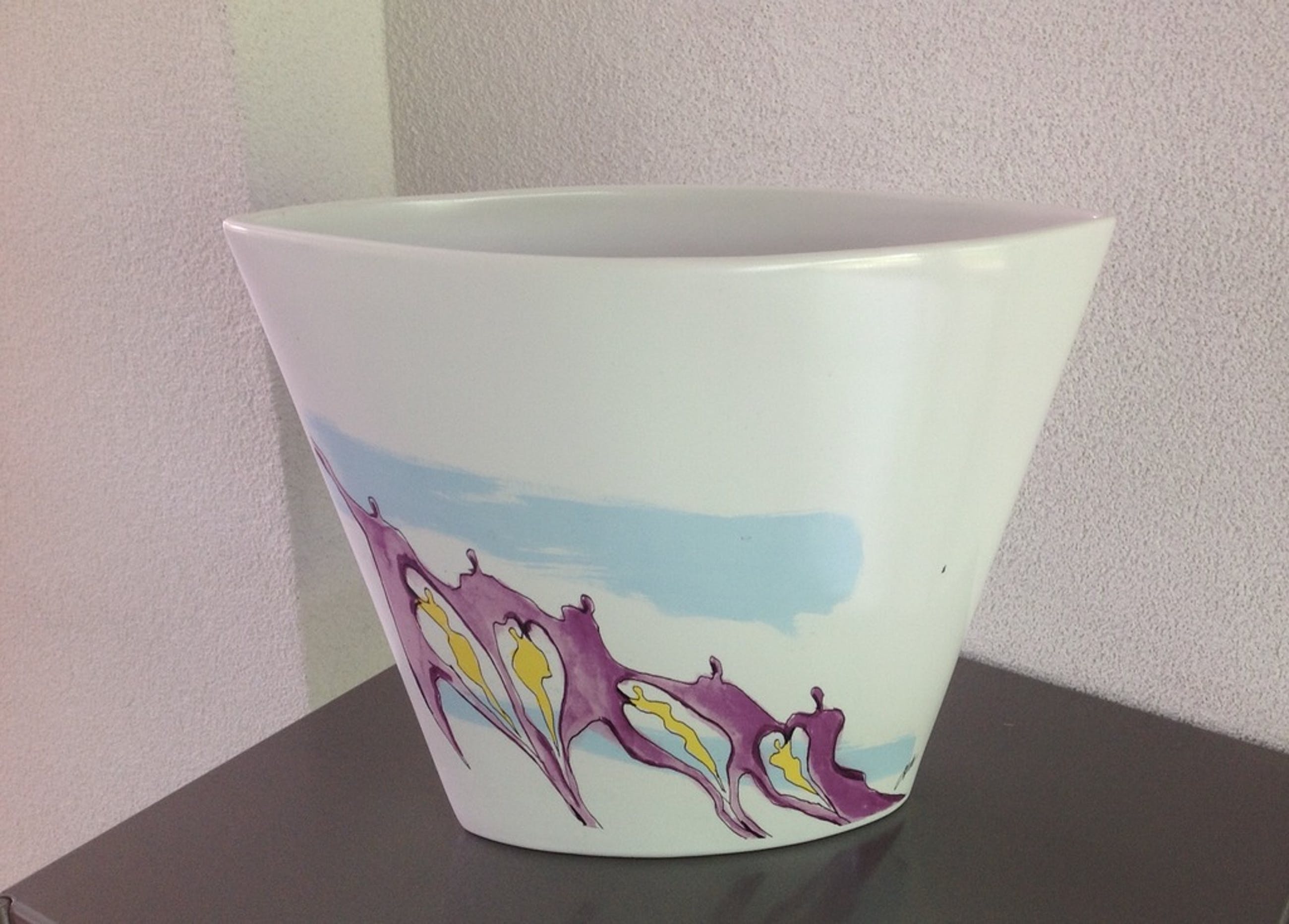 Een mooie, grote, witte vaas met een voor Ammerlaan kenmerkende beschildering van mensachtige figuren in paars en geel op een achtergrond van twee lichtblauwe streken. Voorzien van signatuur.