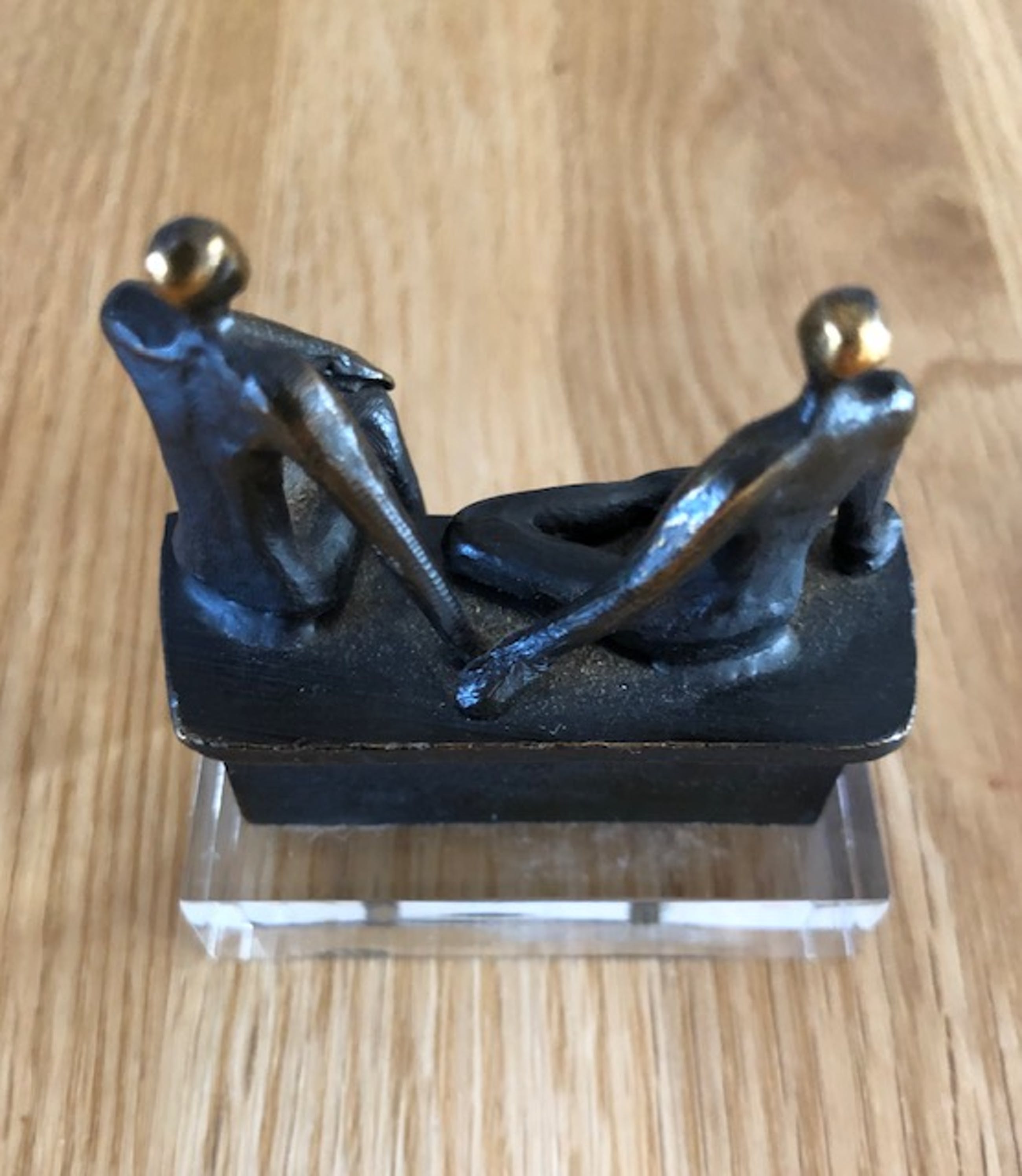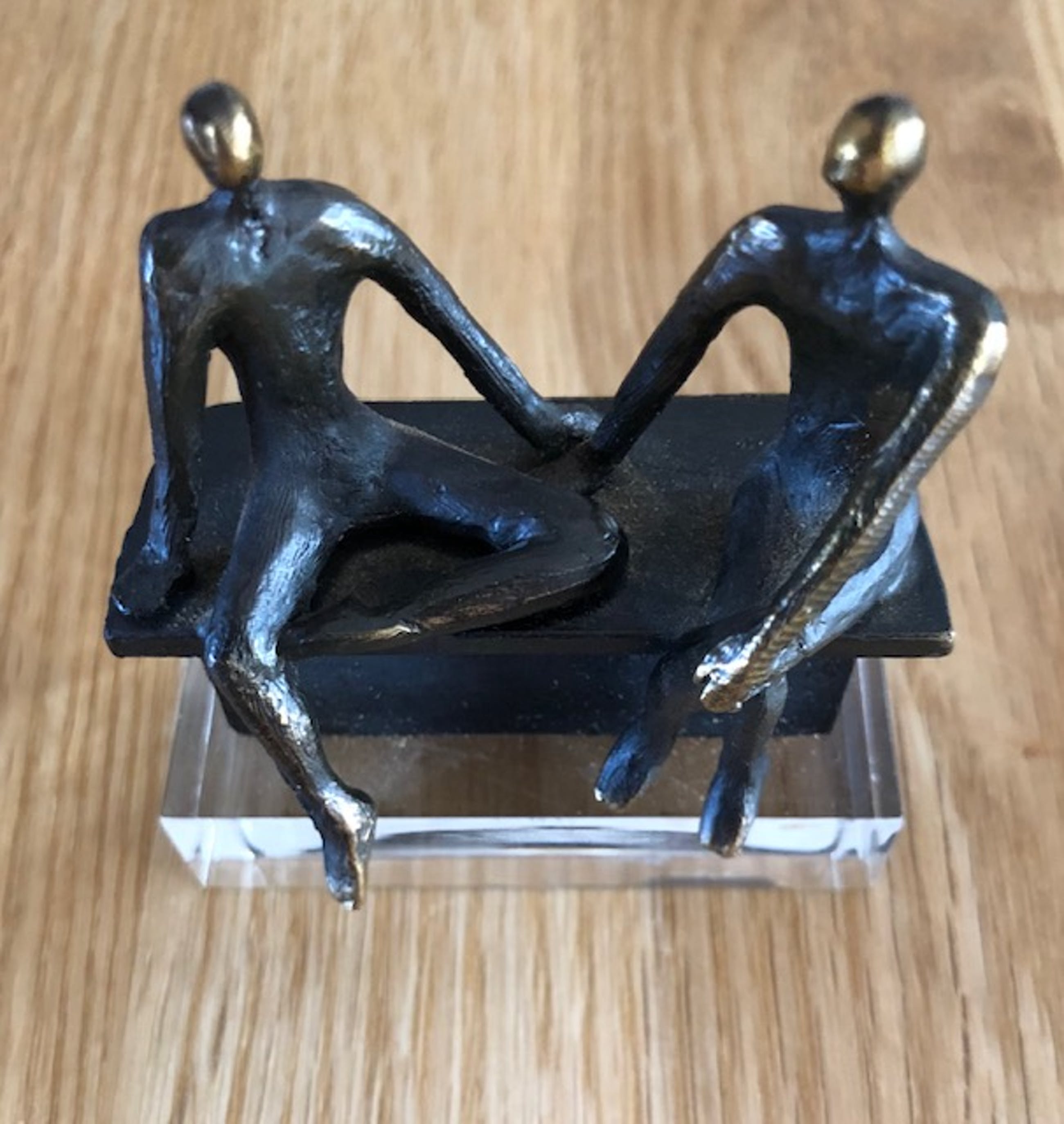 2 mooie kleine beeldjes. ( Artihove ) 1 x voorstelling twee mensen op een bankje geplaatst op kunststof voet. 1 x voorstelling twee mensen in een ronde kuip geplaatst op hardstenen voet. Beelden zijn niet gesigneerd maar in een uistekende staat.