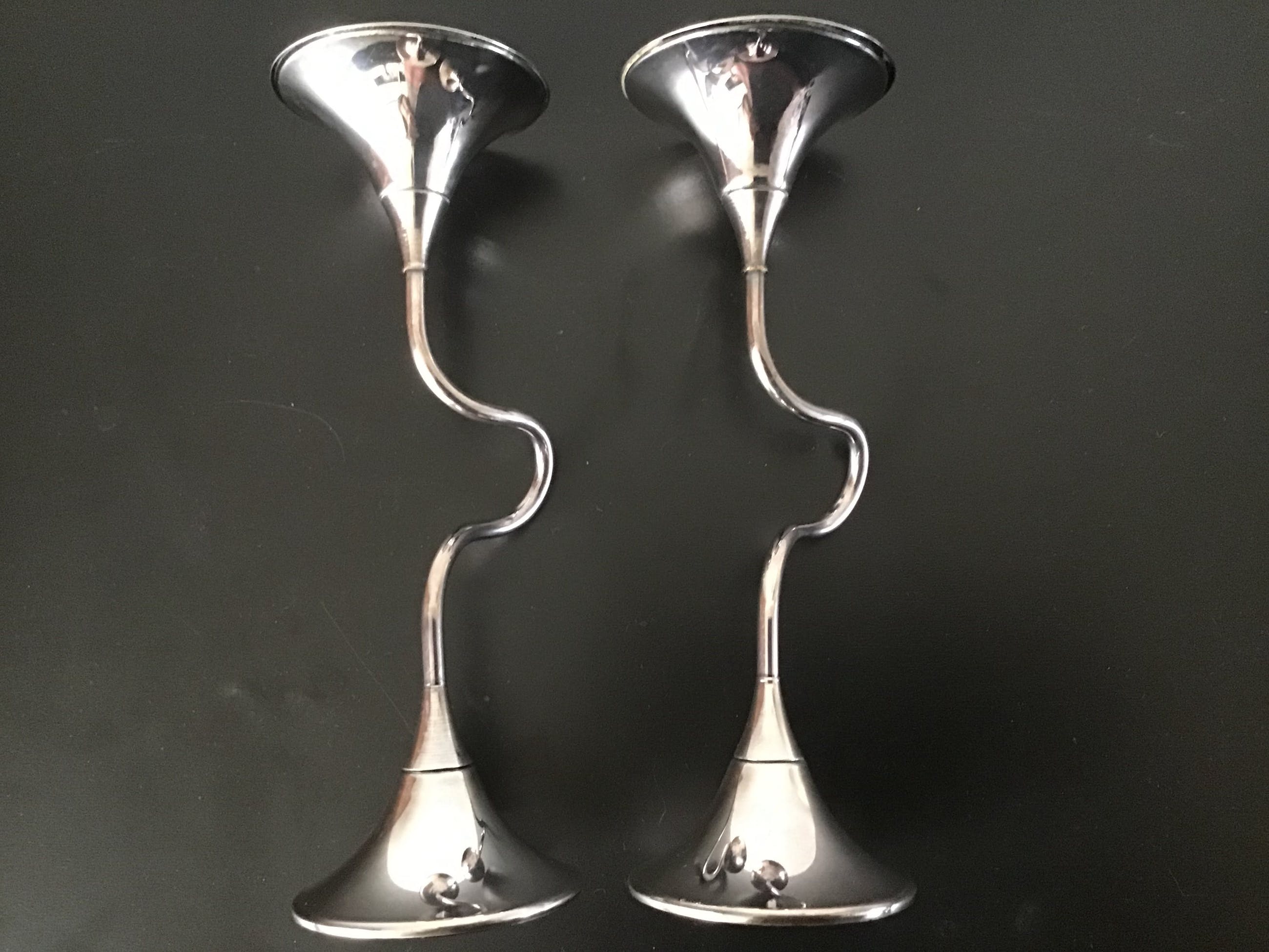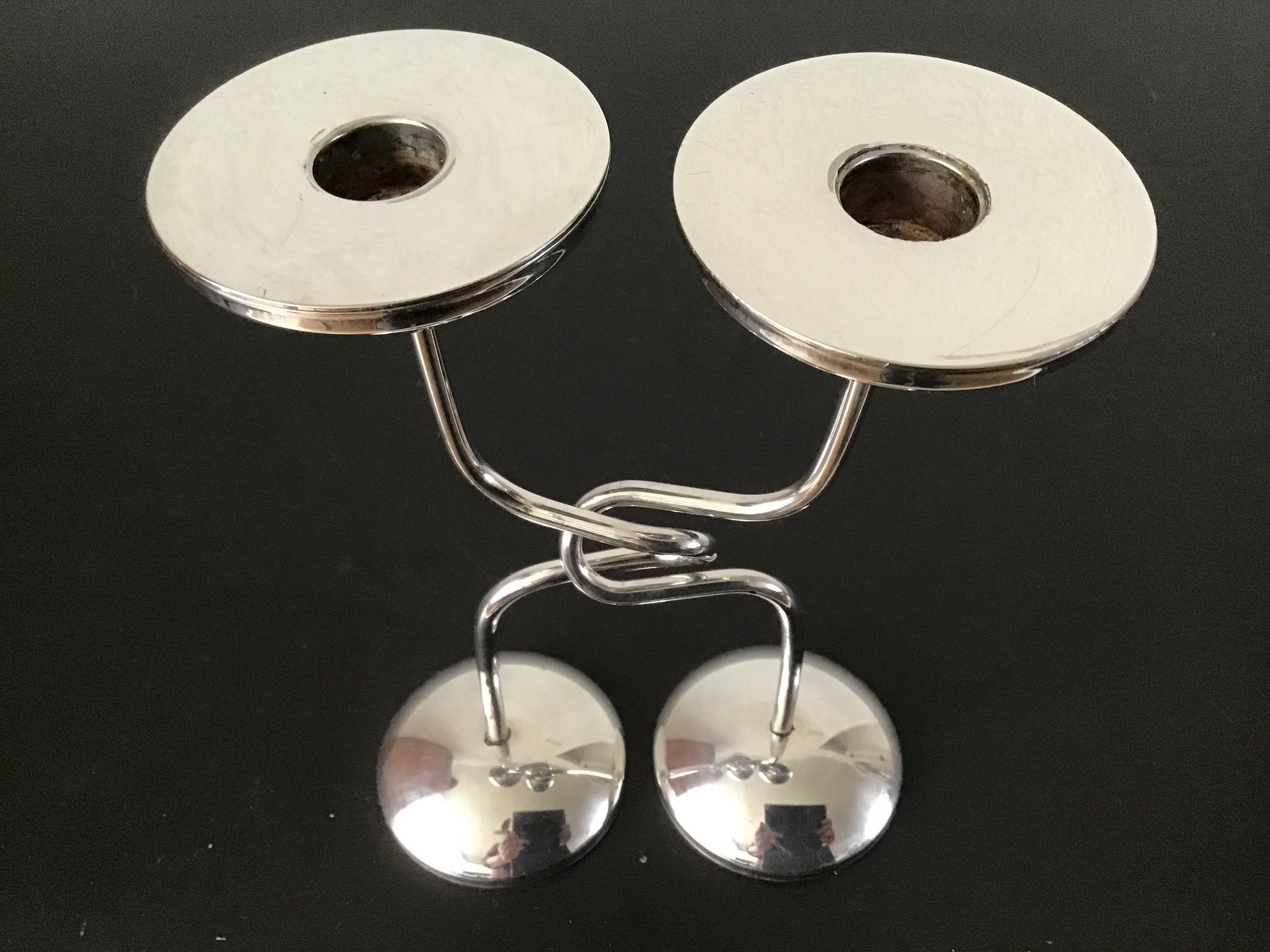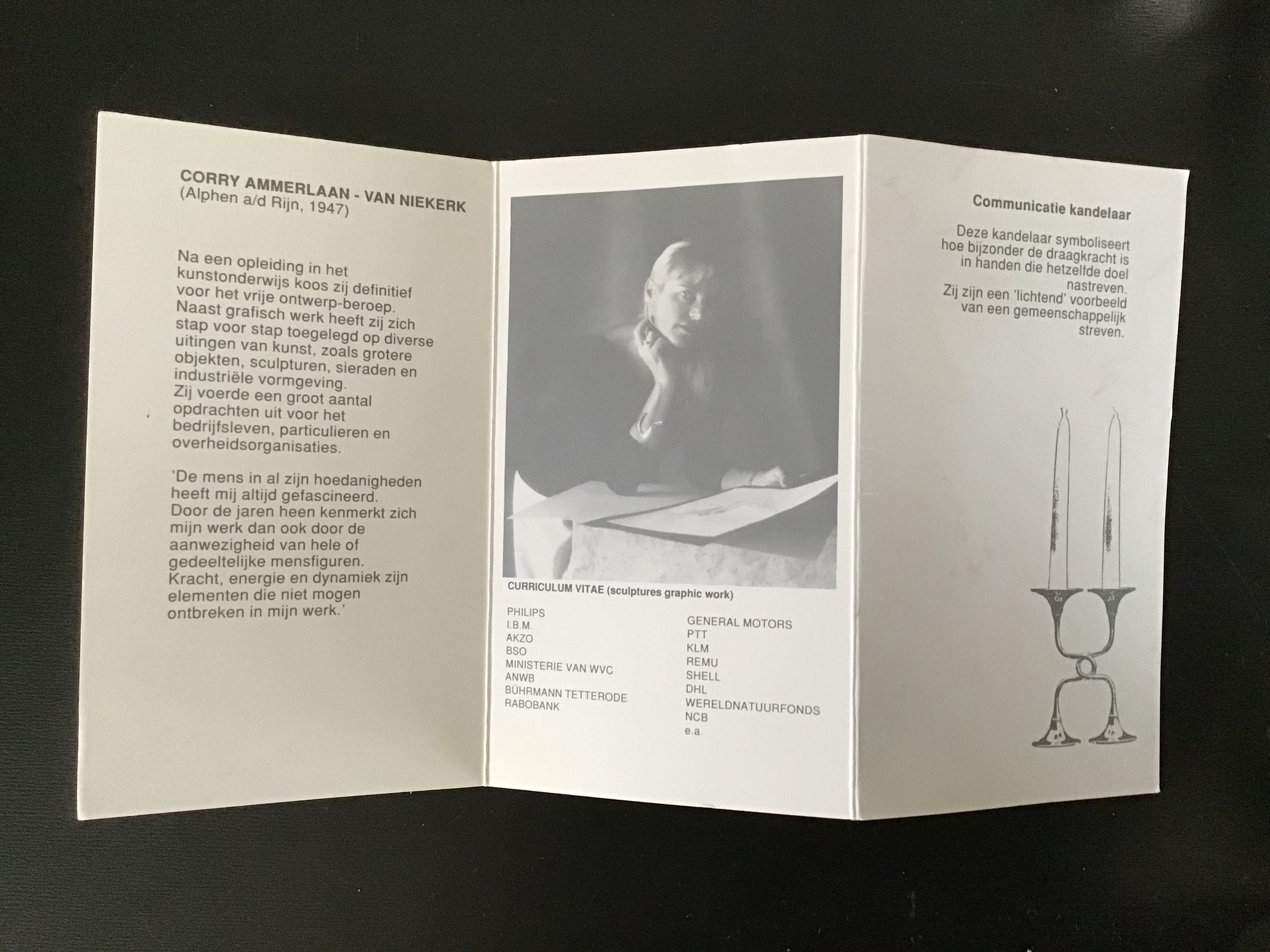 5 mooie,verzilverde kandelaars van Corry Ammerlaan. In goede conditie. 4 kandelaars hoogte 18.5 cm. Breedte 6.5 en 8 cm. 1 kandelaar hoogte 7.3 cm.breedte 6.3 cm.