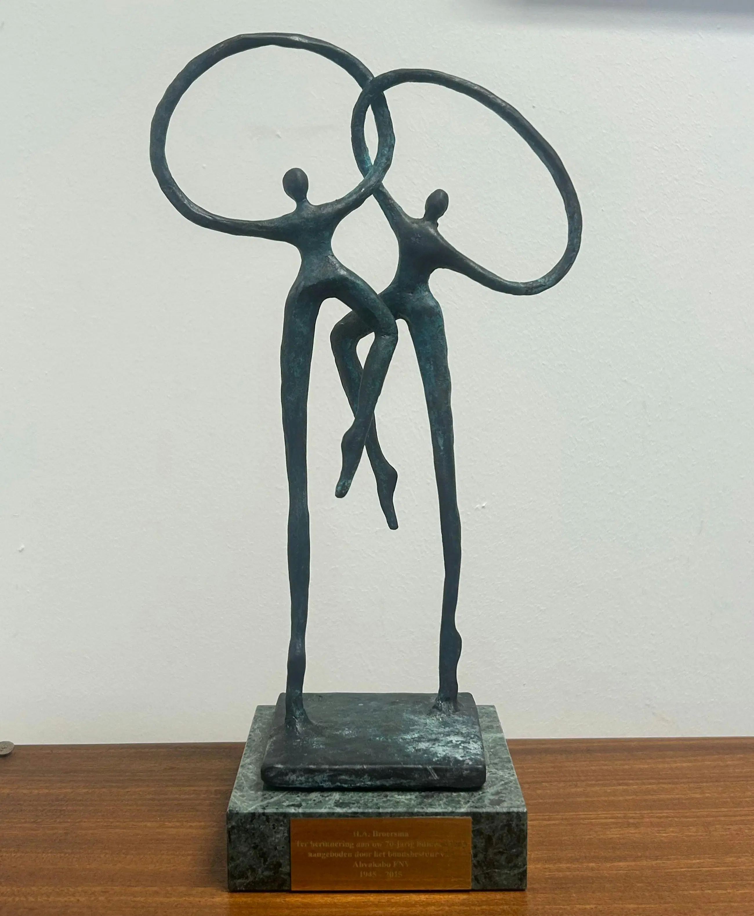 Mooi bronzen beeldje van de Nederlandse kunstenares Corry Ammerlaan van Niekerk. Dit beeld is aangeboden als herinnering aan een bijzonder jubileum en heeft de volgende inscriptie: