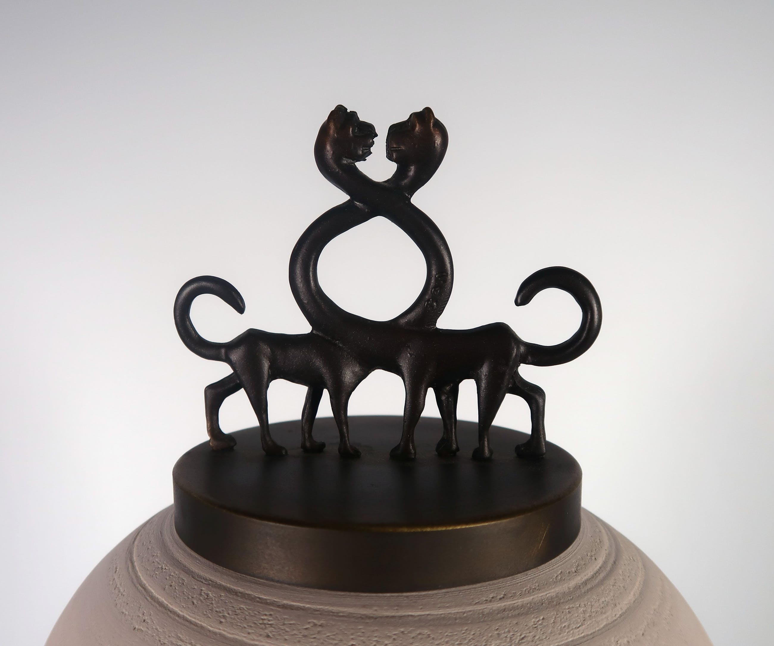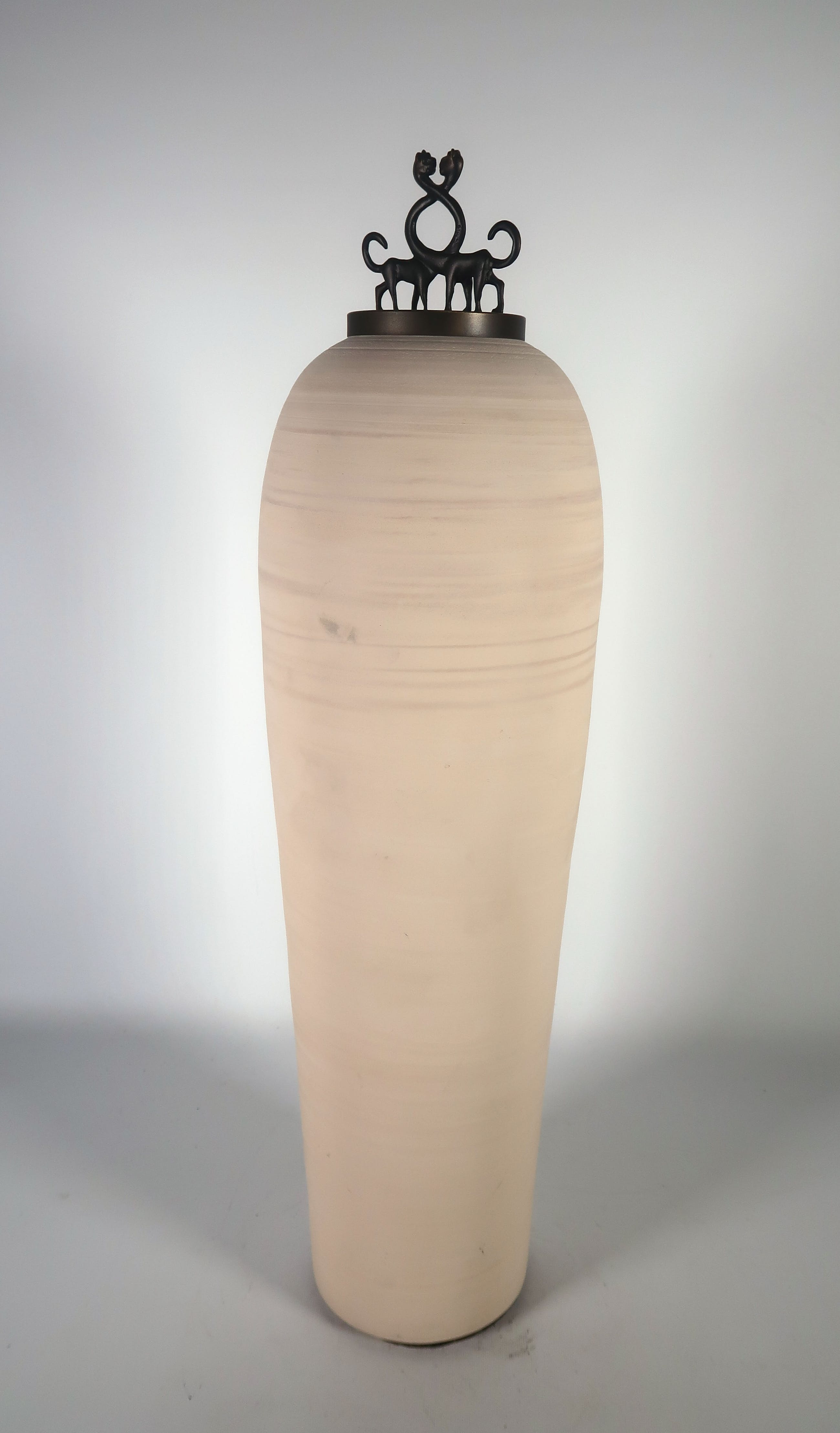 | Verspreid over de vaas zitten enkele krassen, butsen en vegen. De twee figuren op de deksel hellen beide naar achteren. | |