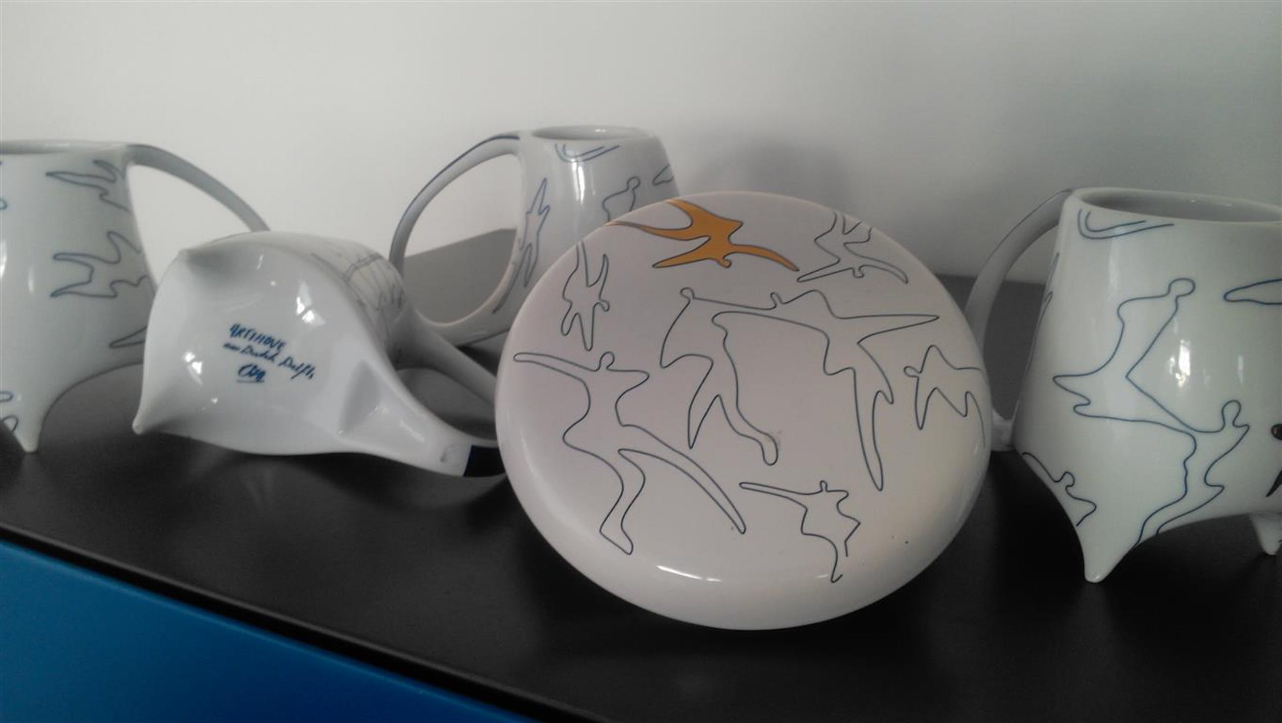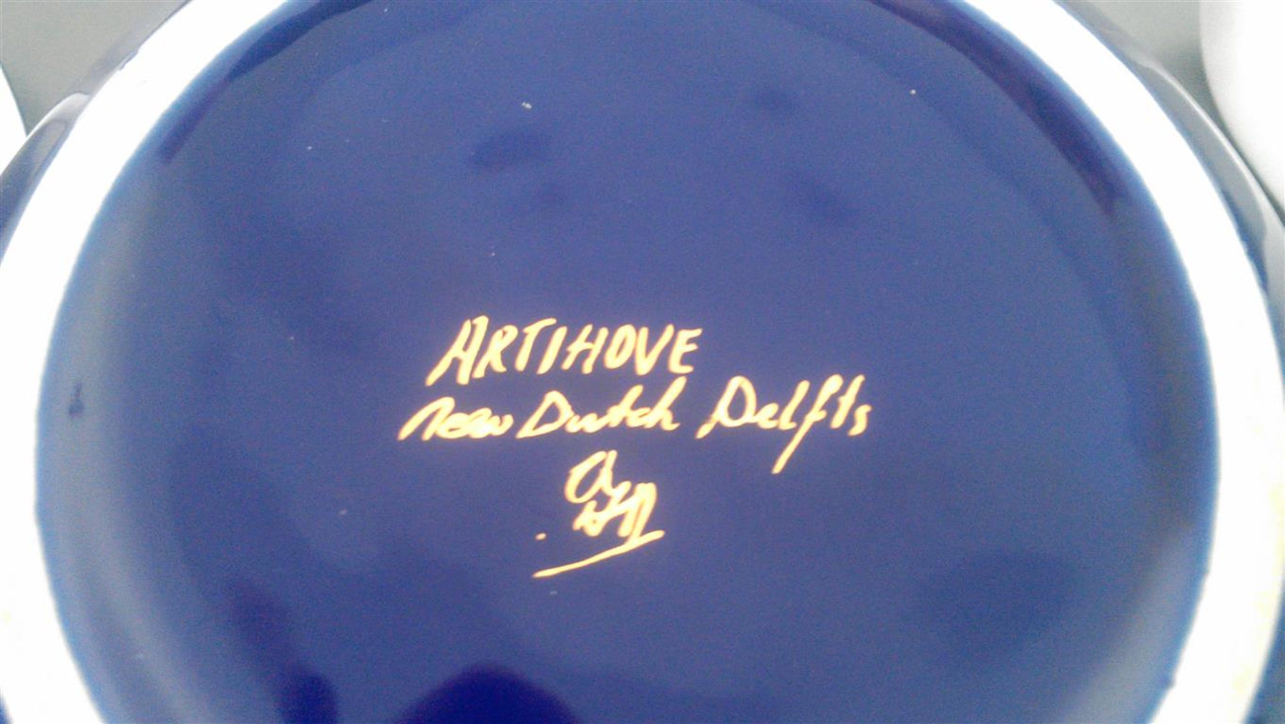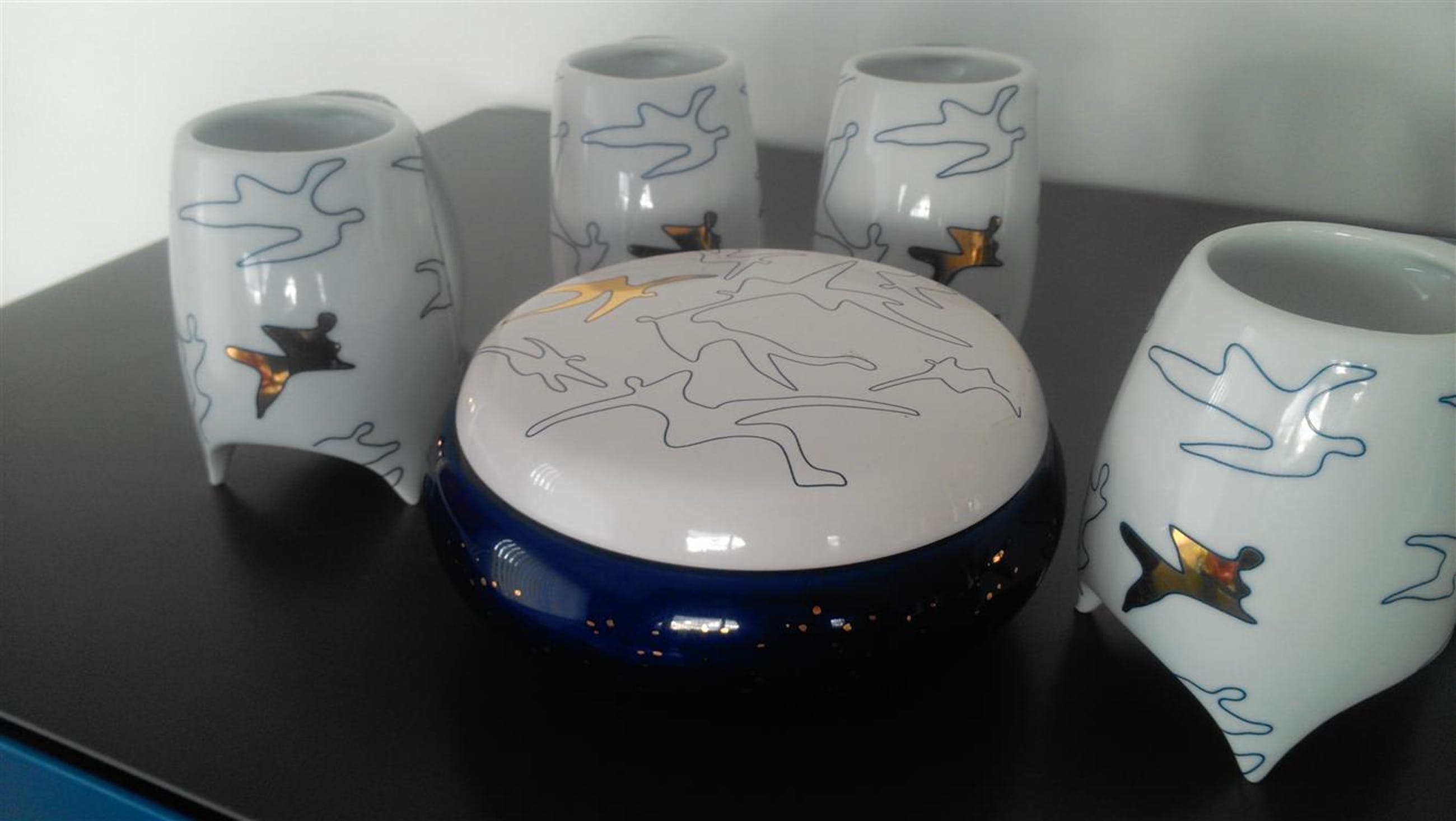 Gesigneerd met CAN Corry Ammerlaan van Niekerk deze eigenwijze New Dutch Delfts koppen en schaaltje met deksel met goudopdruk