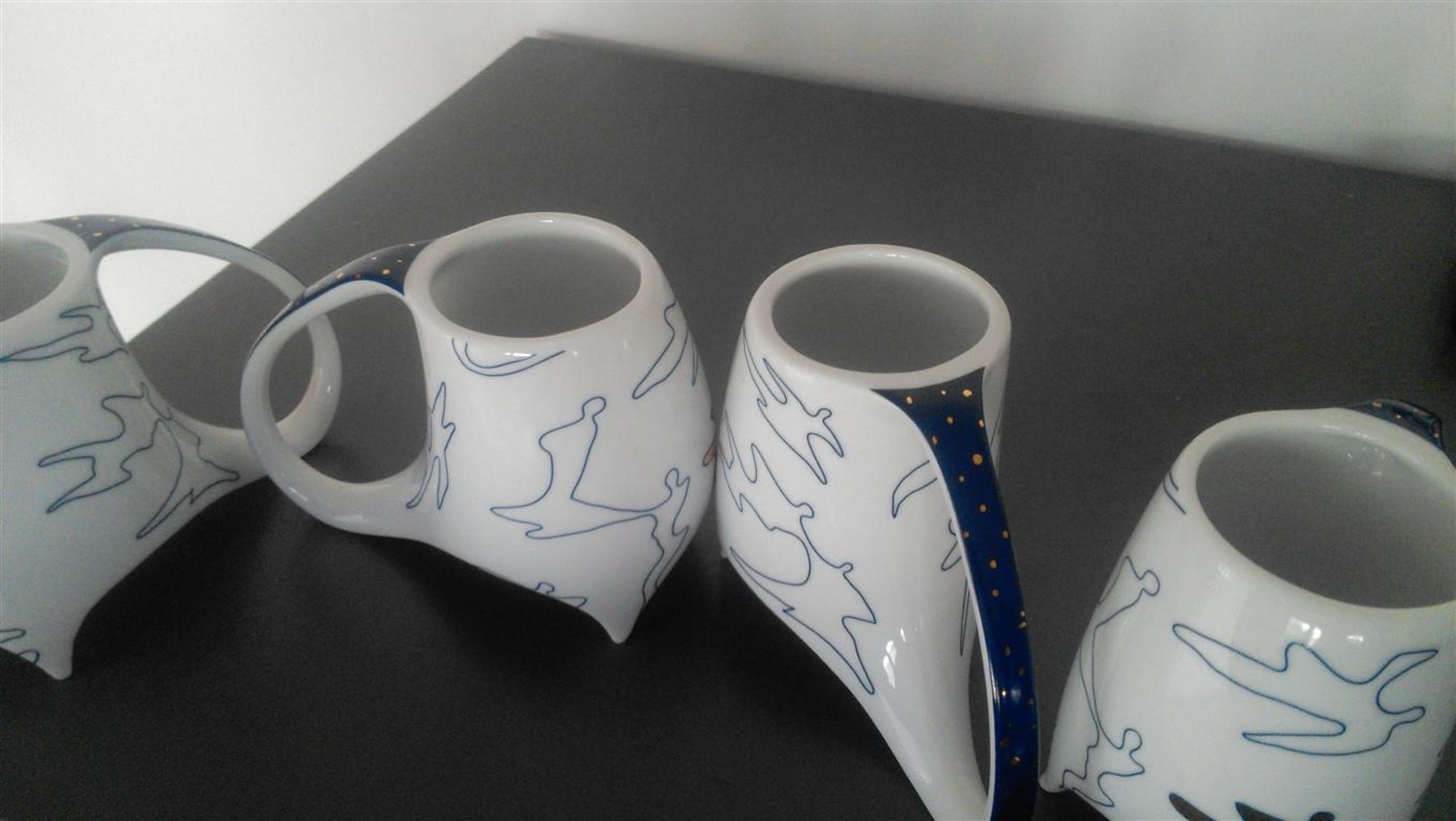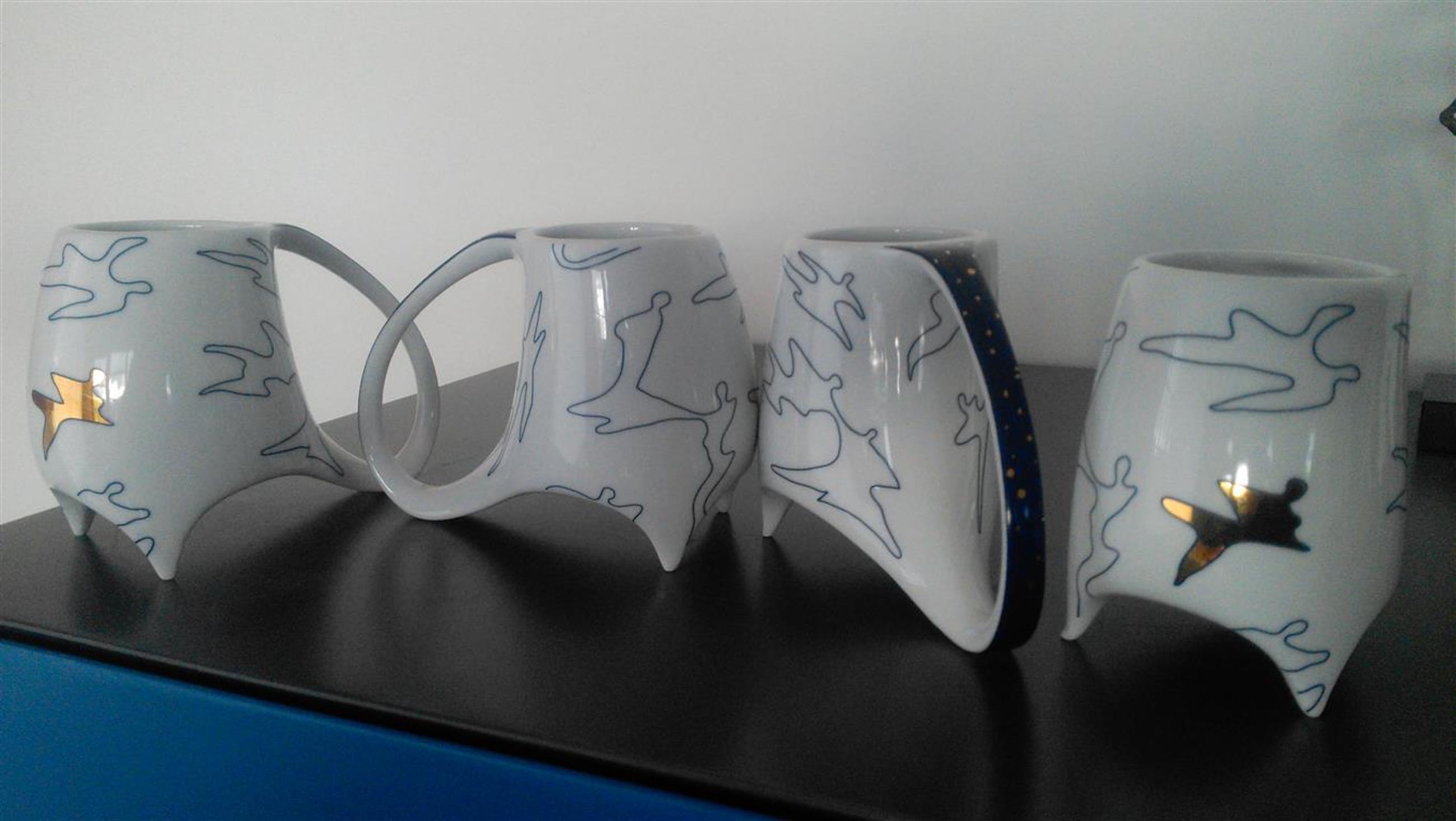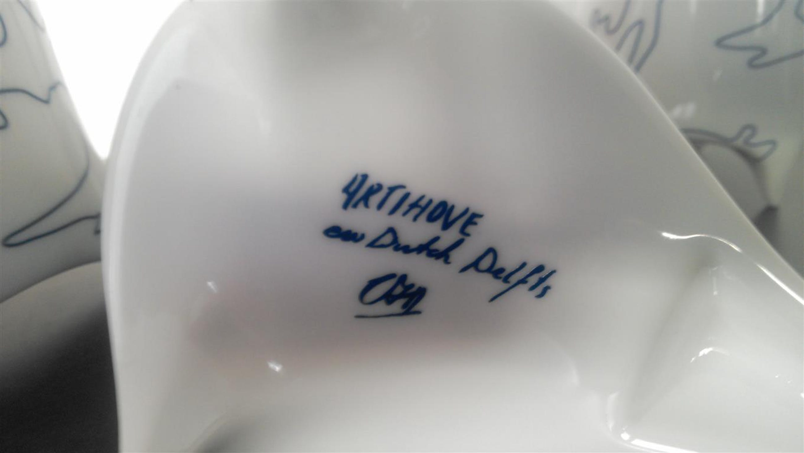 Gesigneerd met CAN Corry Ammerlaan van Niekerk deze eigenwijze New Dutch Delfts koppen en schaaltje met deksel met goudopdruk