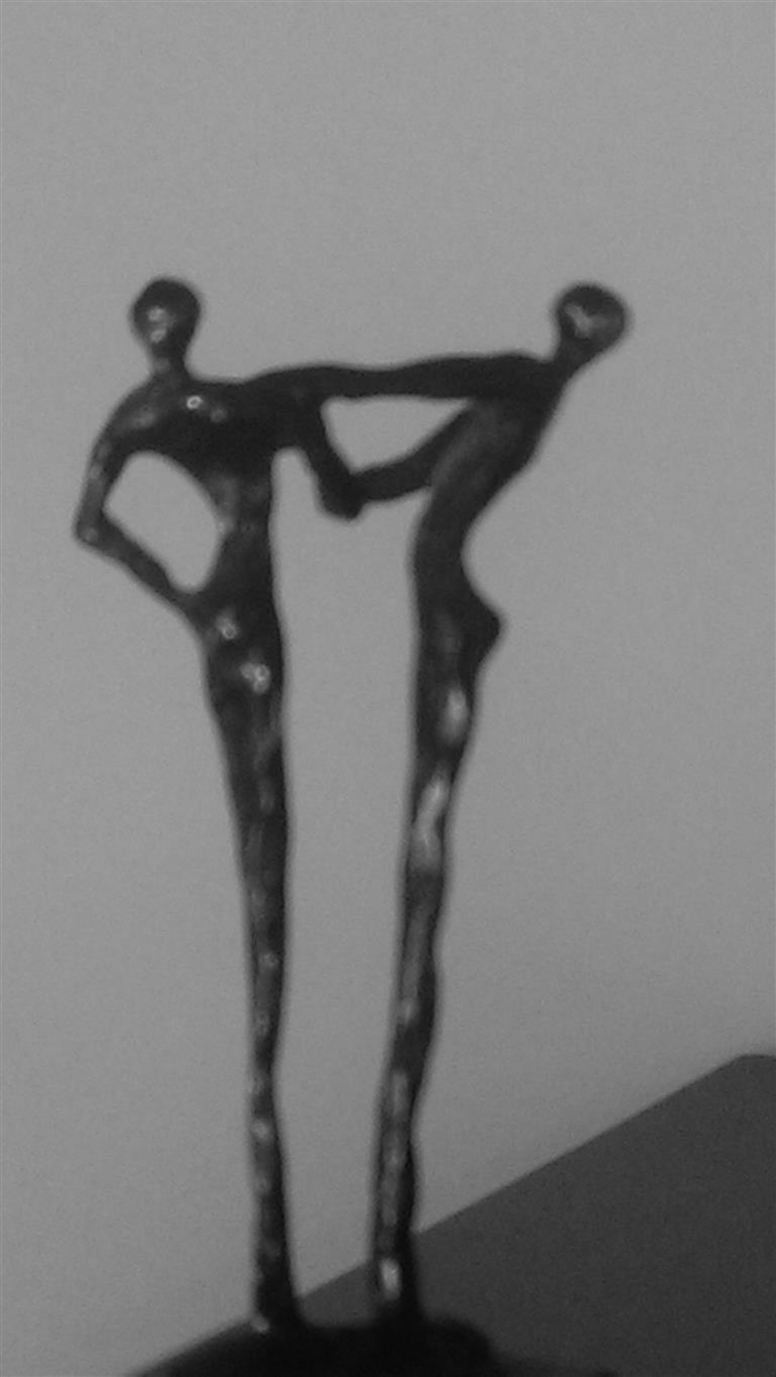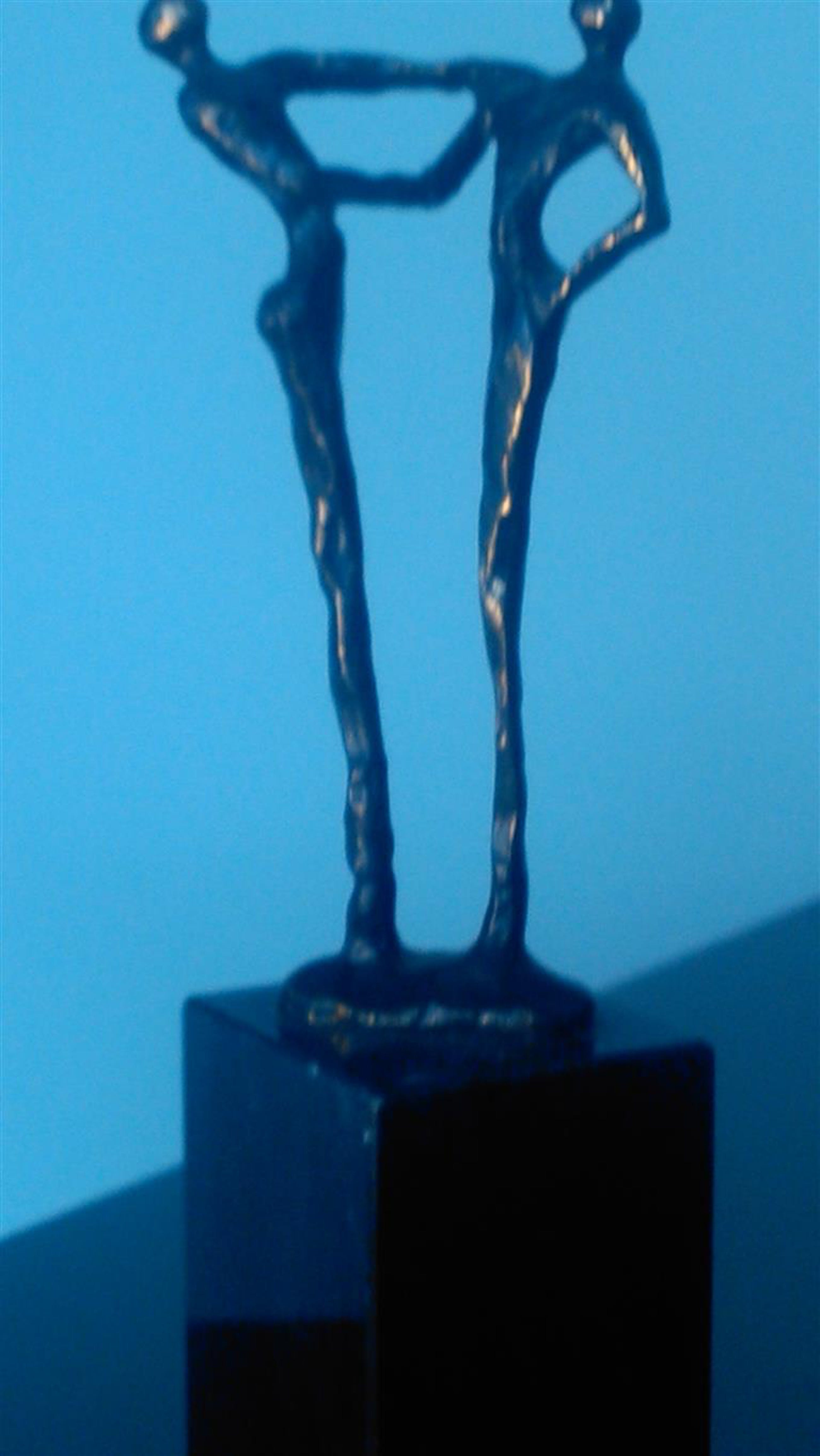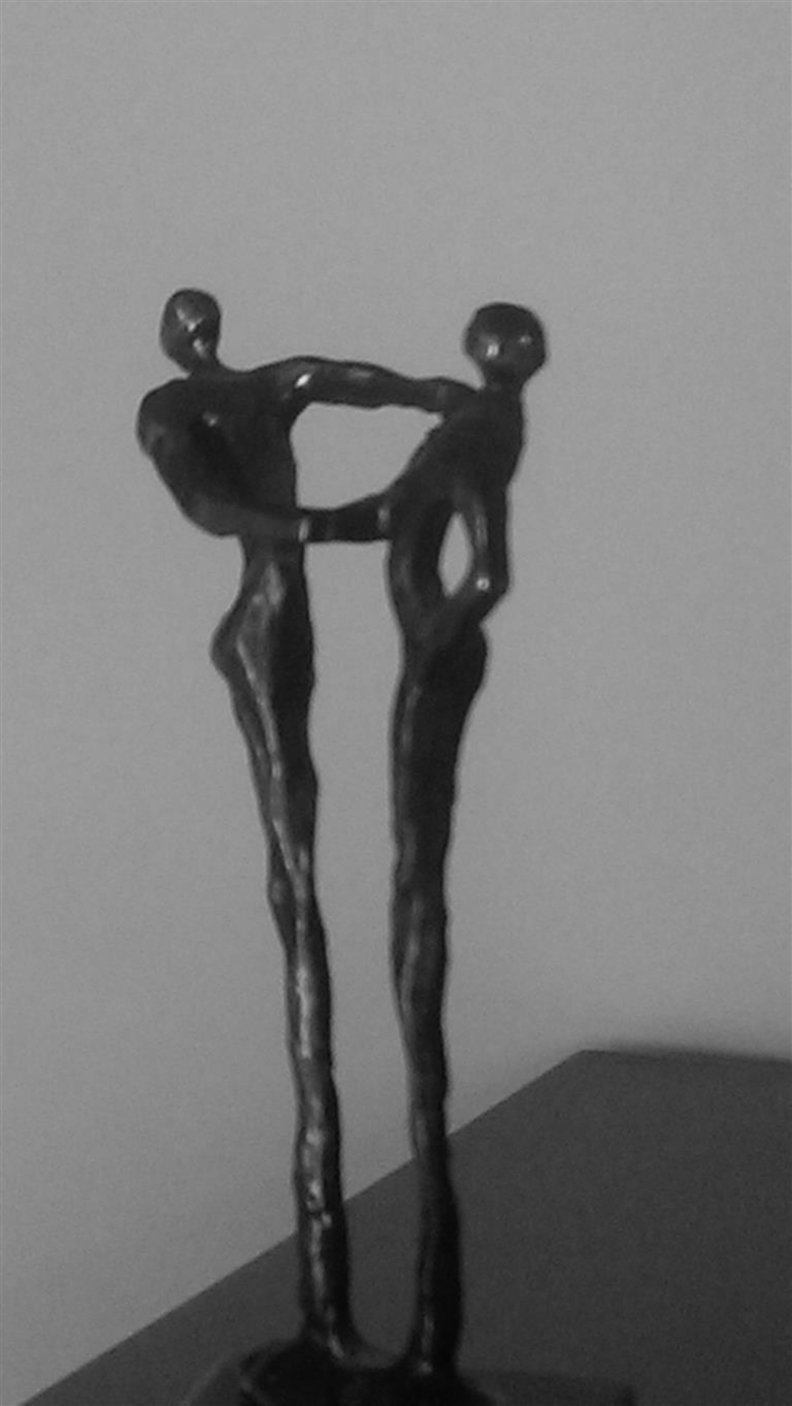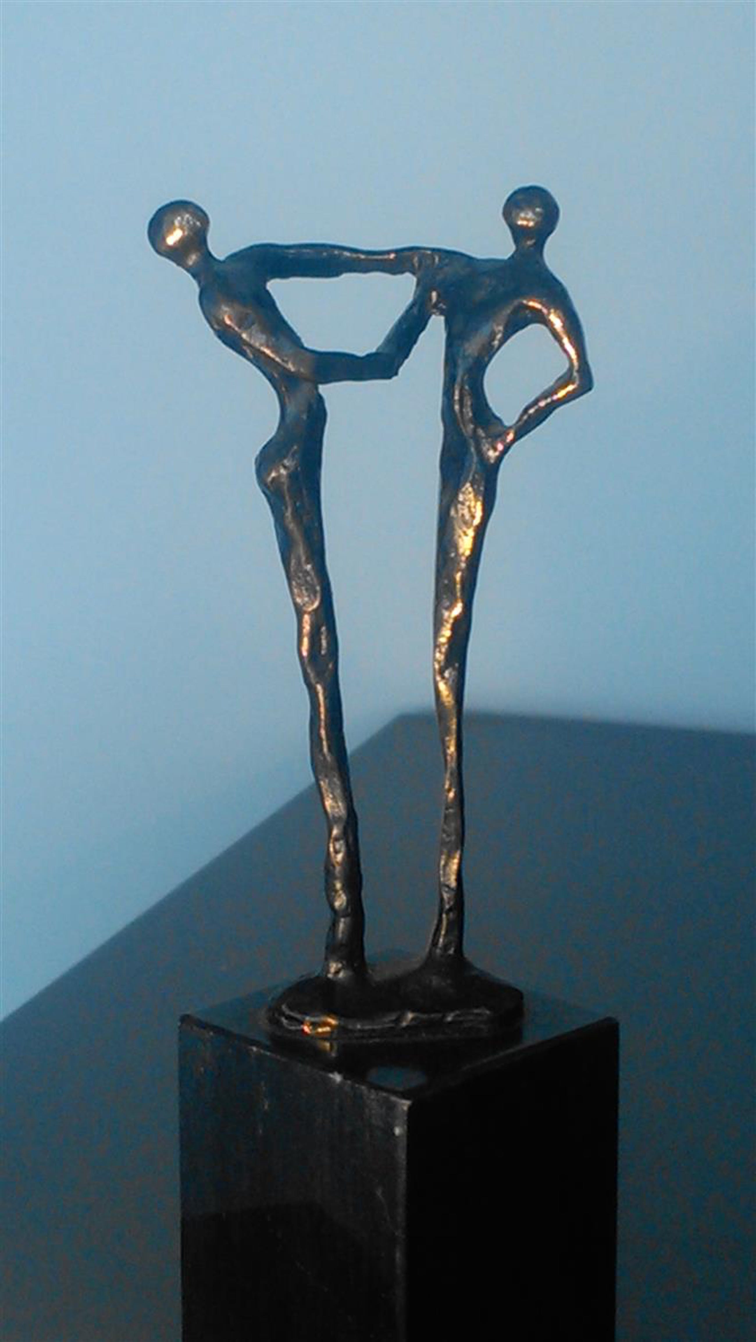 Een welgemeend bedankt verbeeld door deze handdrukkende personen op natuurstenen sokkel van 4 x 4 x 7 cm Gesigneerd CAN Corry Ammerlaan van Niekerk